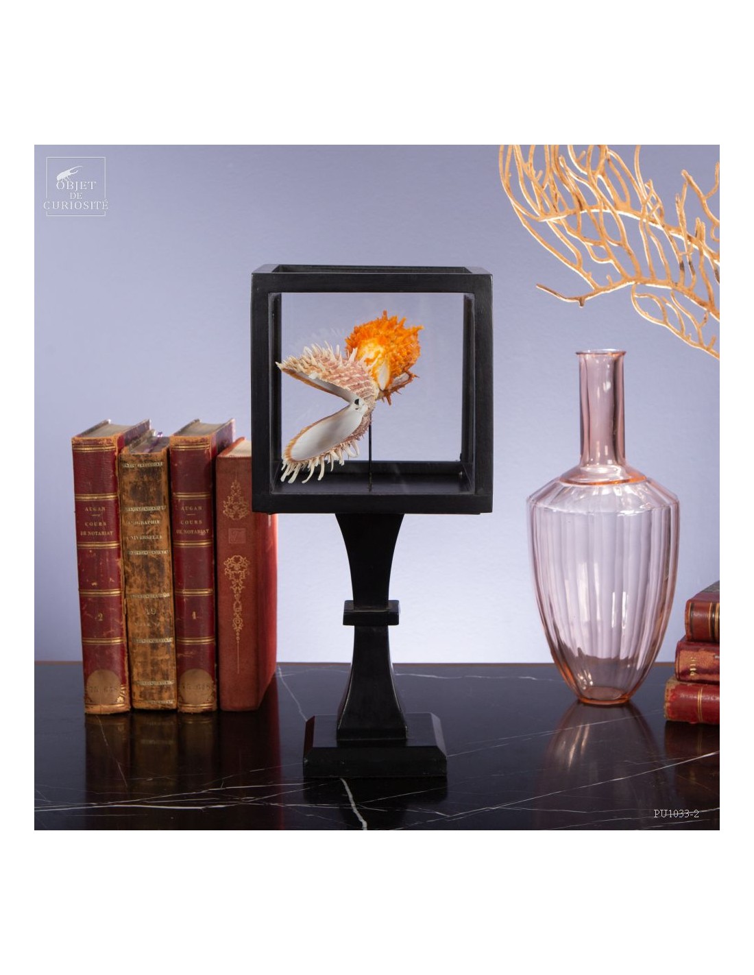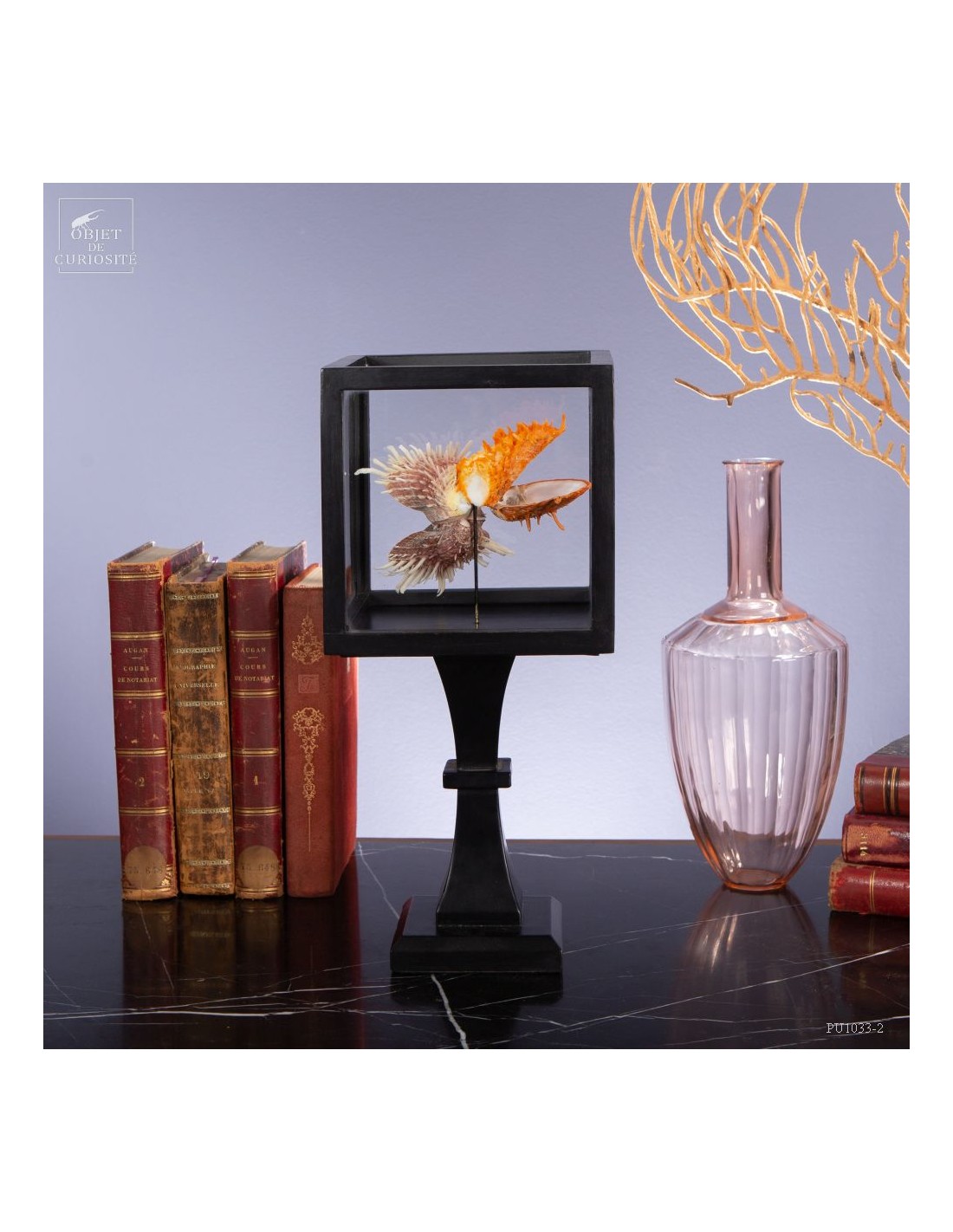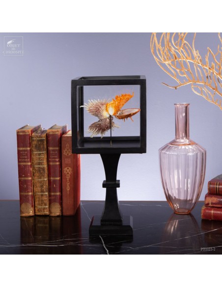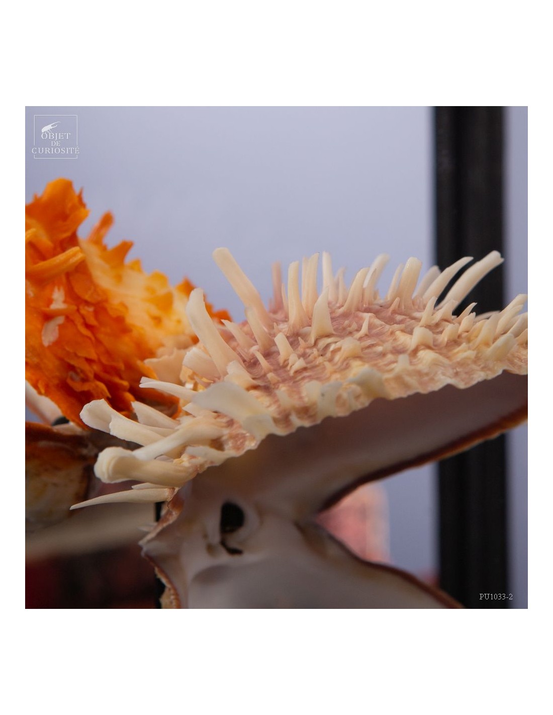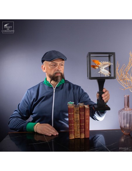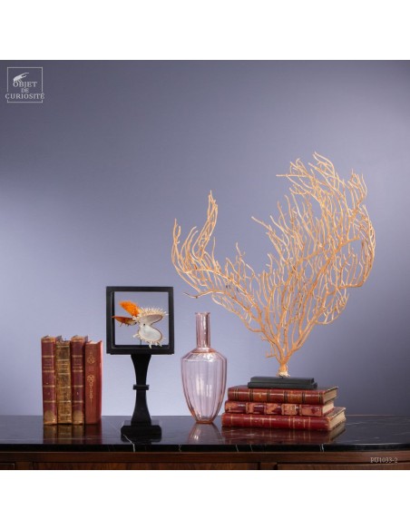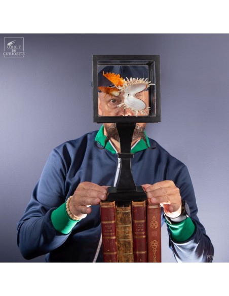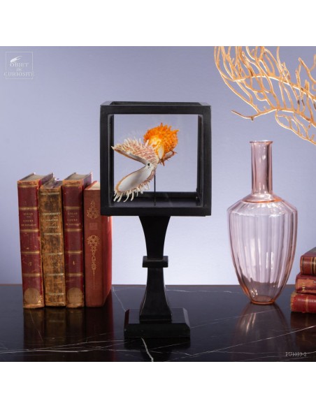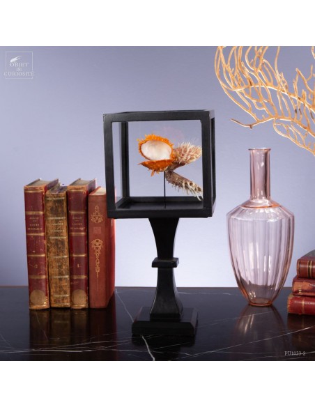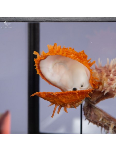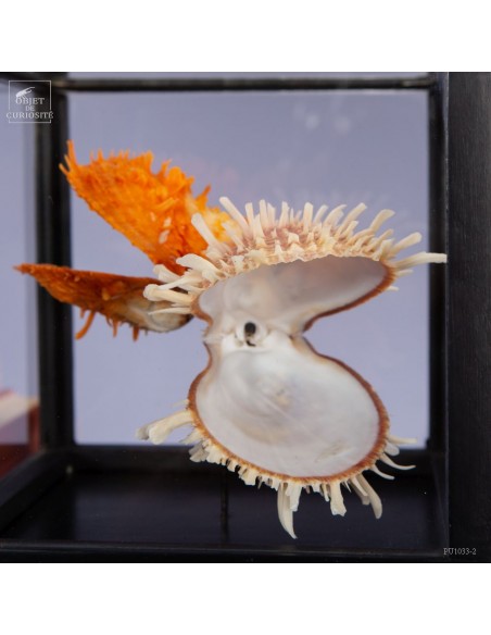 Couple of Spondyle Royal wearing beautiful colors and with large thorns not to be eaten by the starfish... This species does not live in pairs, but these two have grown together, to the point of being "welded" by their shell. It was only in our workshops that they decided to move into this solid mango wood box..