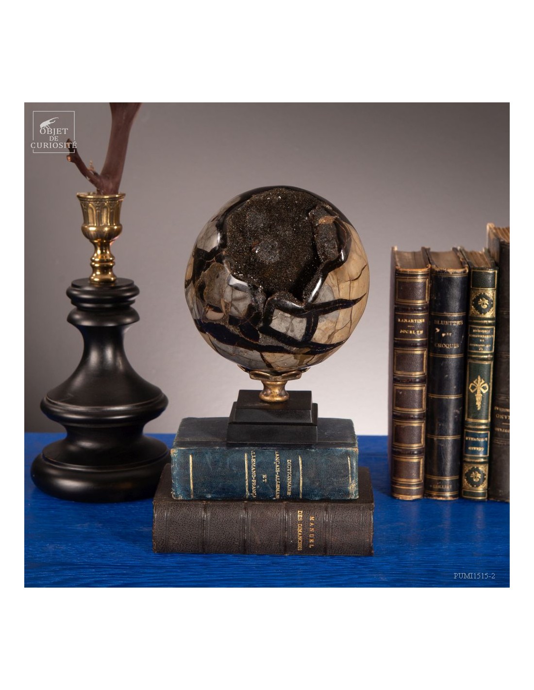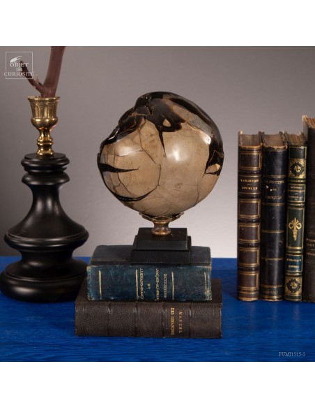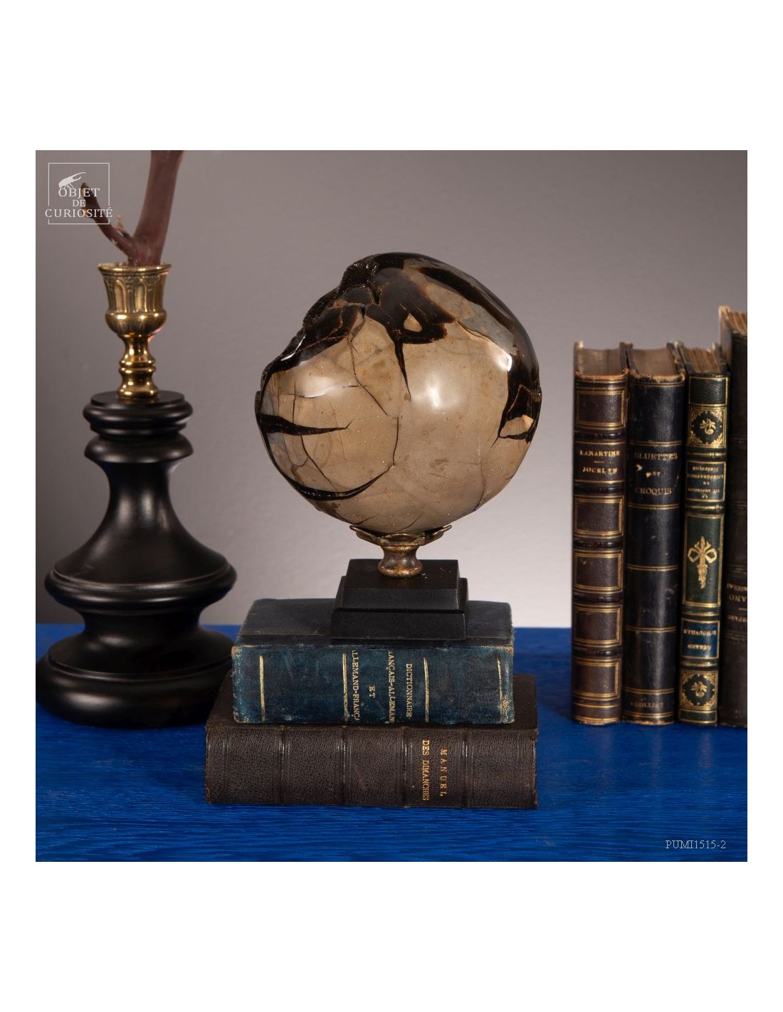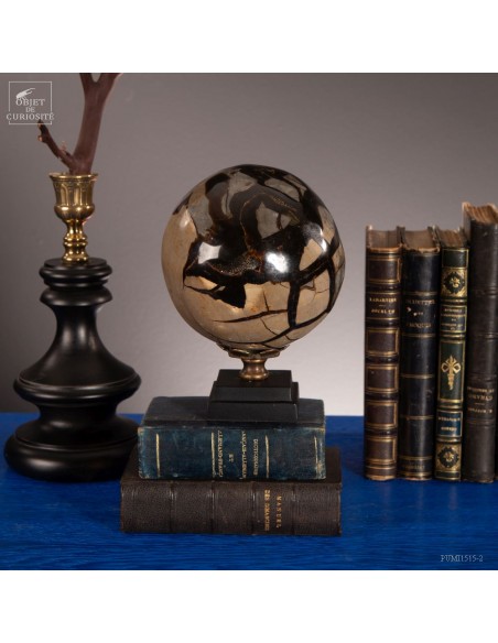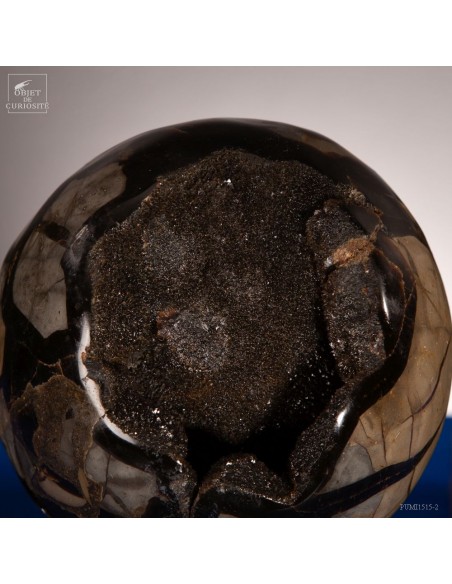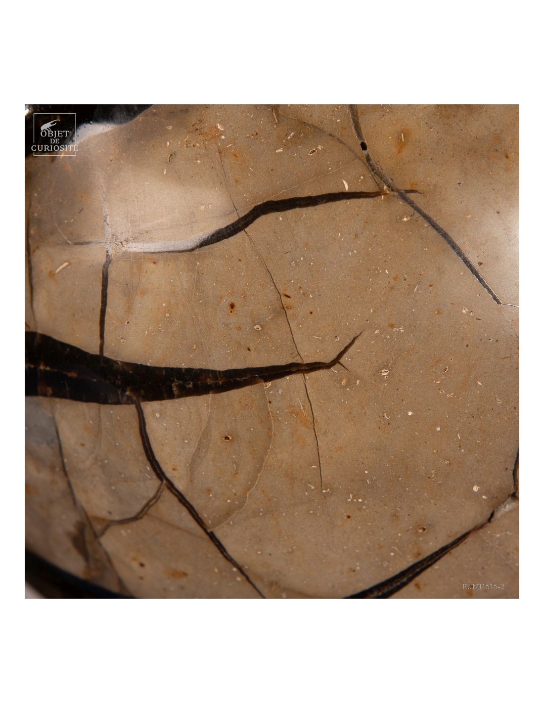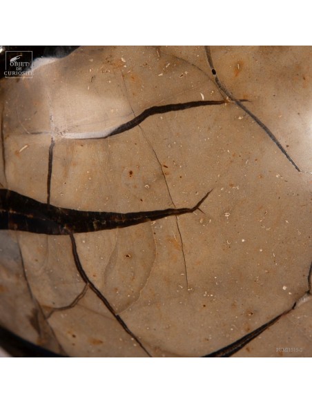 Medium spherical Septaria from Madagascar The nodules of Septaria  were initially formed around a core of organic matters (plant fragments,  or dead animal corpse). By digging in a clay soil, we find a big oval pebble, and after polishing we highlig ht the extraordinary combination  of craks filled with black crystal and the beige to dark brown of the nodule's body.