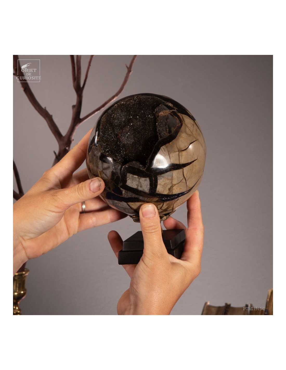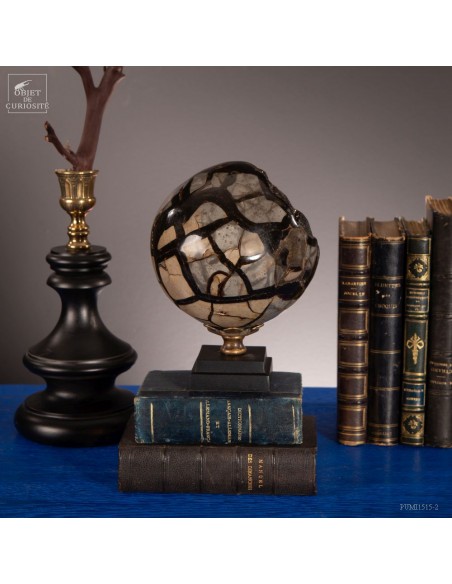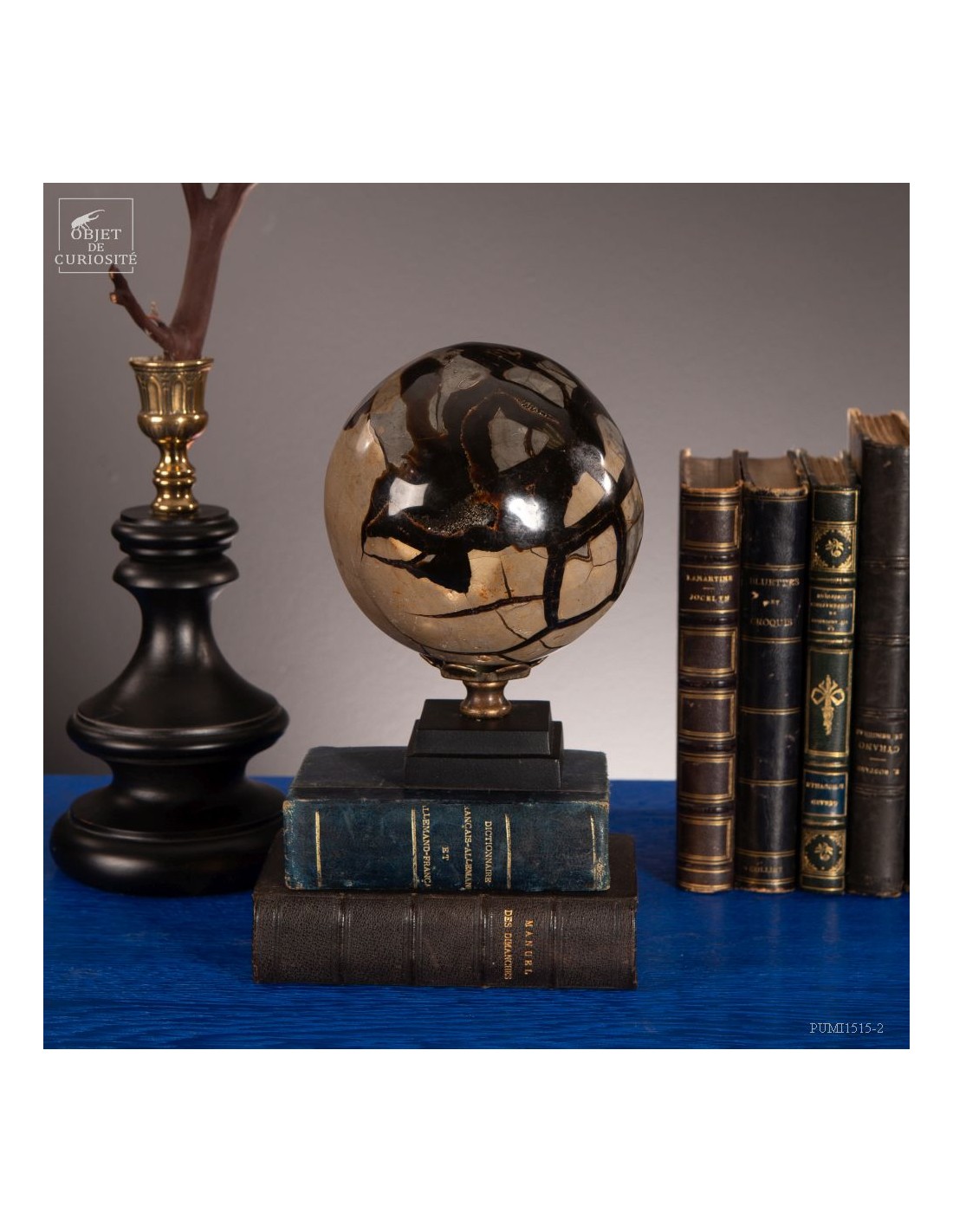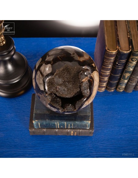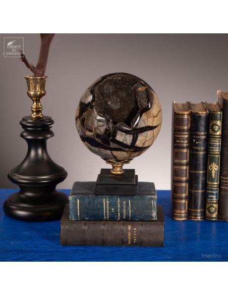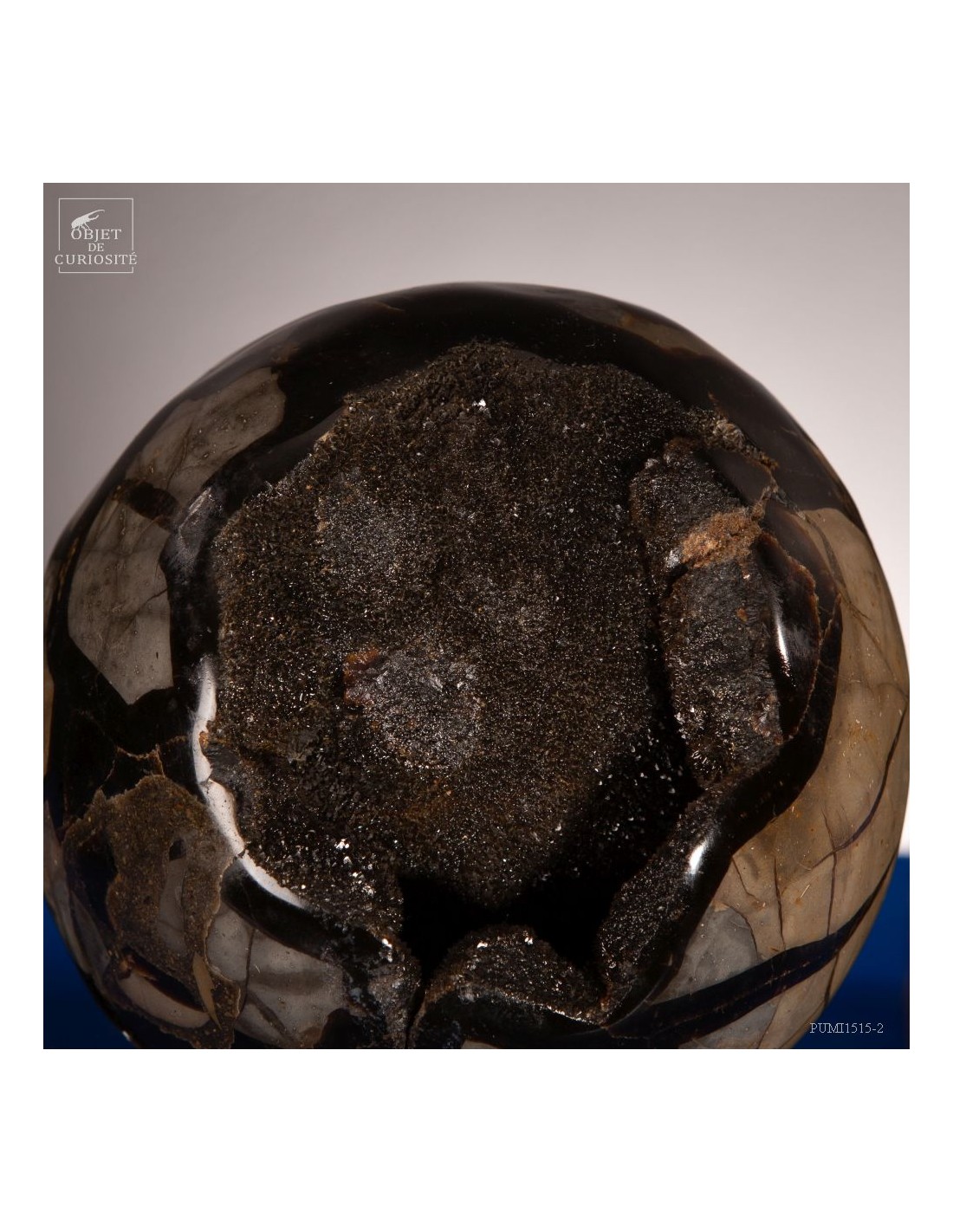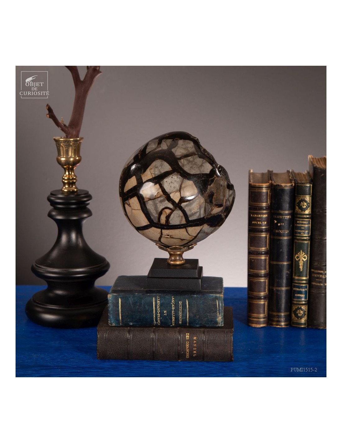 Medium spherical Septaria from Madagascar The nodules of Septaria  were initially formed around a core of organic matters (plant fragments,  or dead animal corpse). By digging in a clay soil, we find a big oval pebble, and after polishing we highlig ht the extraordinary combination  of craks filled with black crystal and the beige to dark brown of the nodule's body.