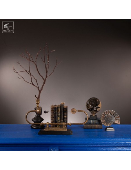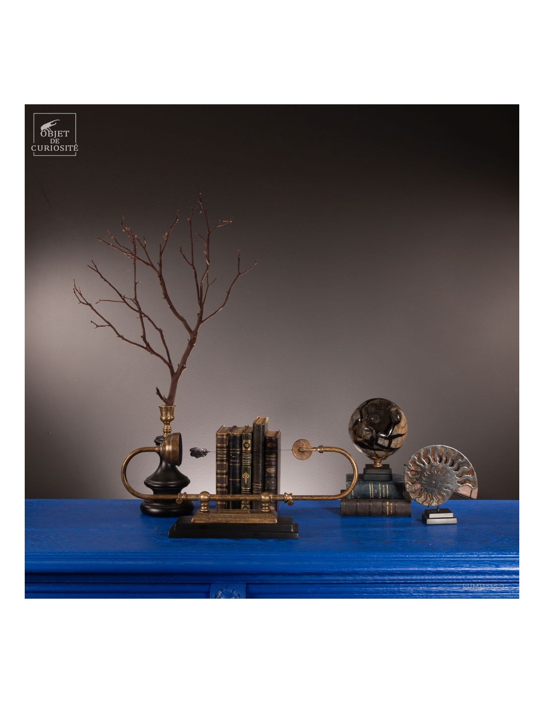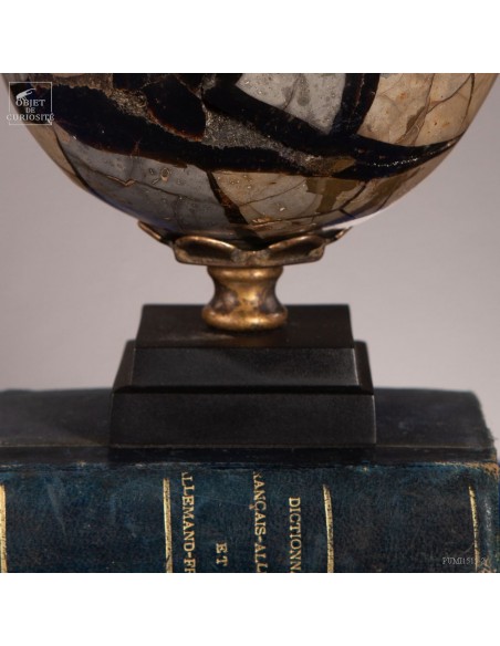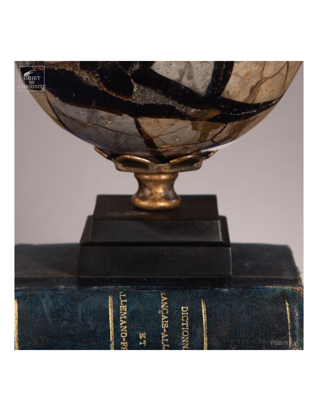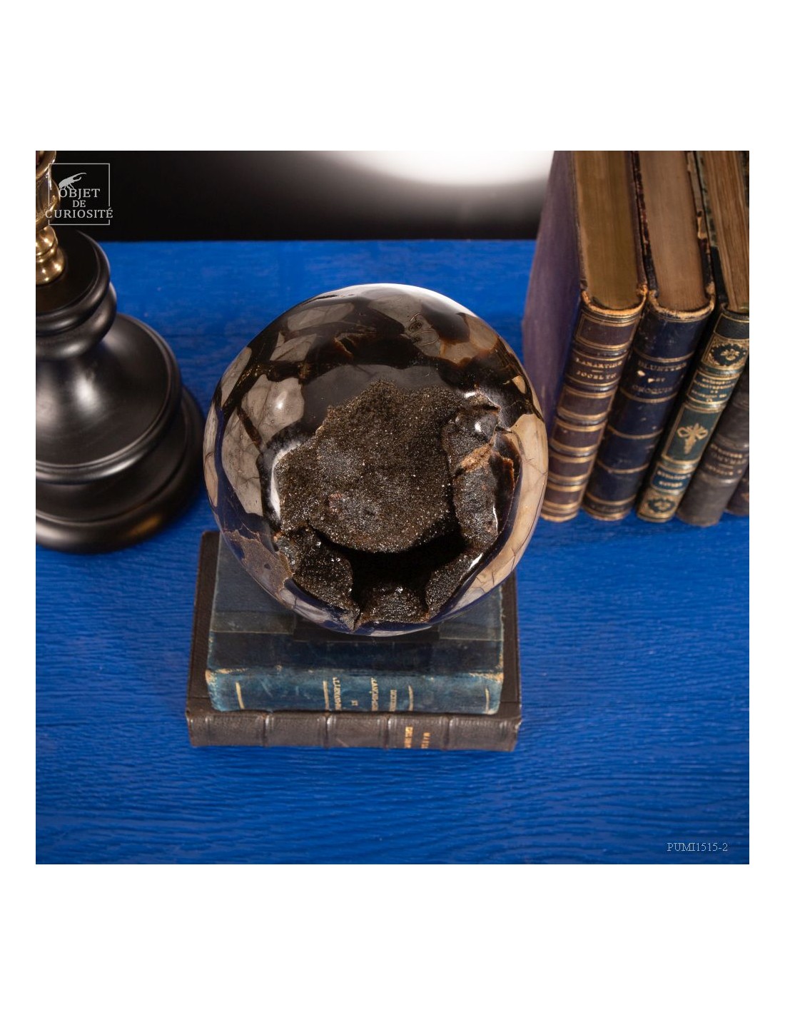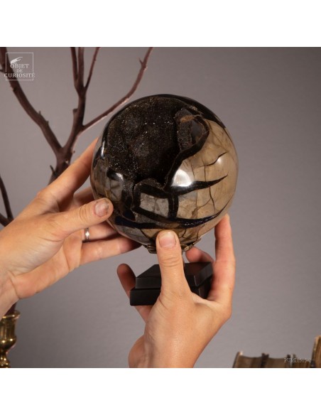 Medium spherical Septaria from Madagascar The nodules of Septaria  were initially formed around a core of organic matters (plant fragments,  or dead animal corpse). By digging in a clay soil, we find a big oval pebble, and after polishing we highlig ht the extraordinary combination  of craks filled with black crystal and the beige to dark brown of the nodule's body.