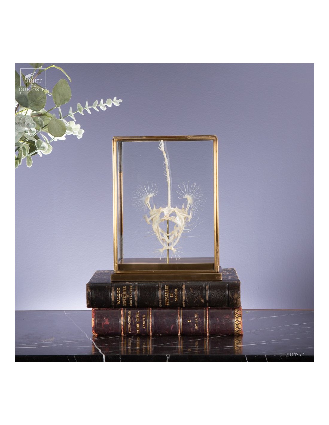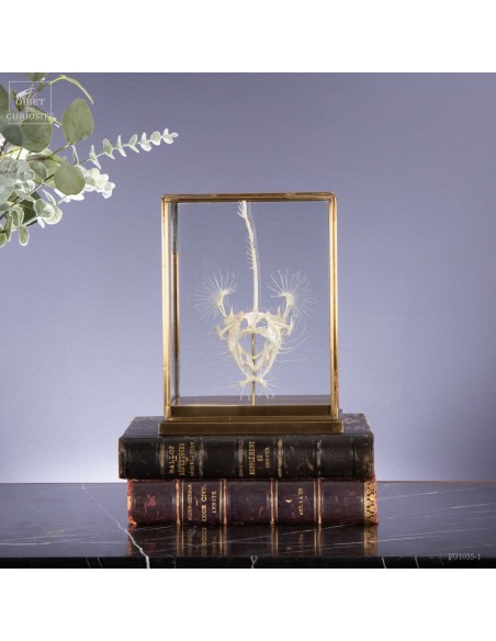 This Anglerfish skeleton under glass globe is a remarkable work of osteology. The mouth of this great hunter shows 2 levels of teeth. Frightening in a way, but in the same time a beautiful lace: At very great depth, food is rare: what goes into his mouth must not come out!