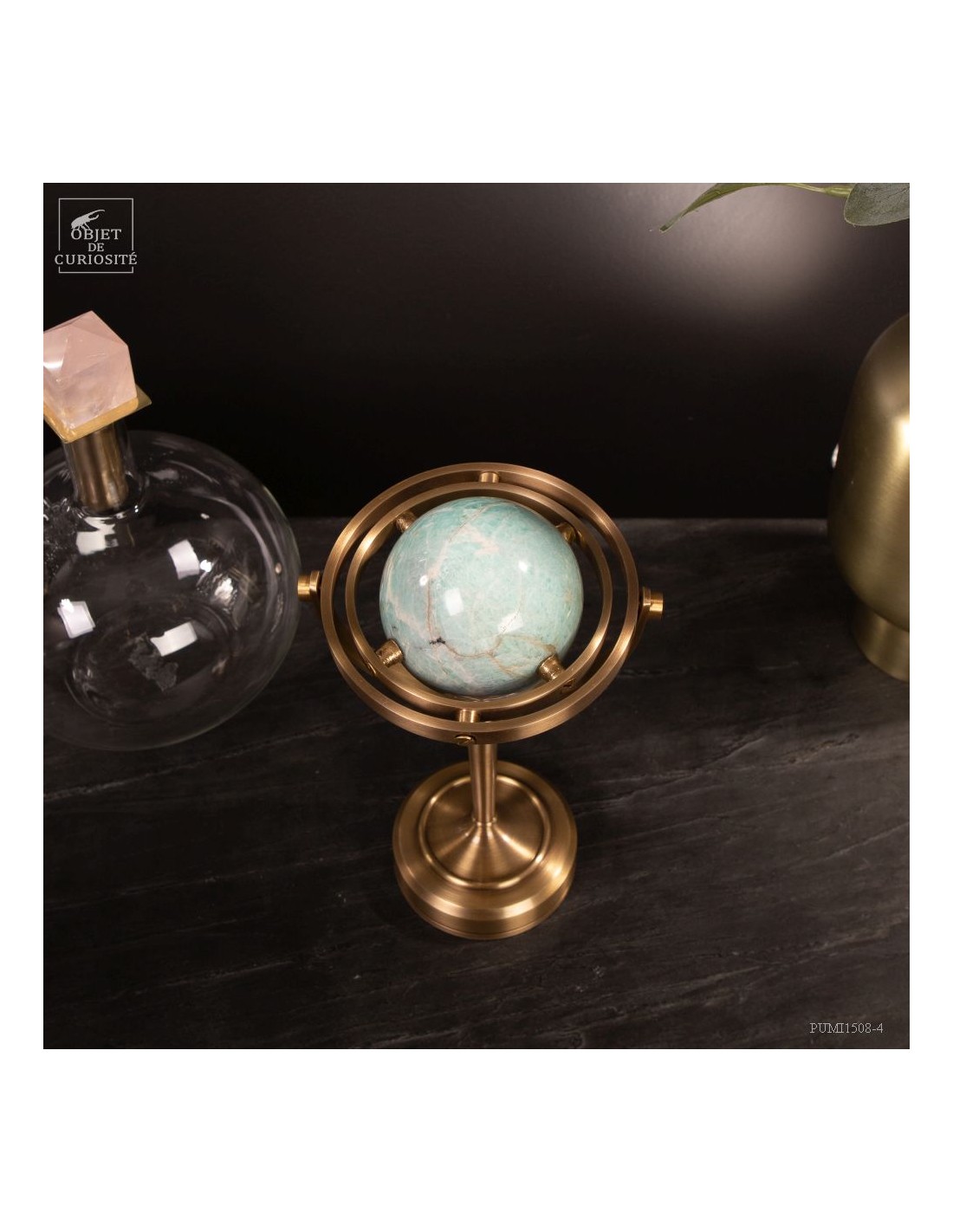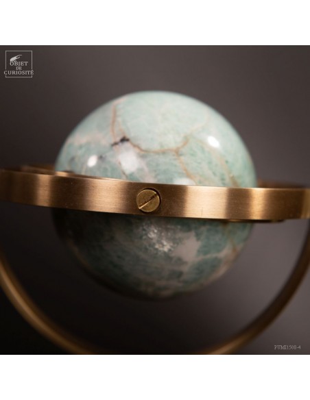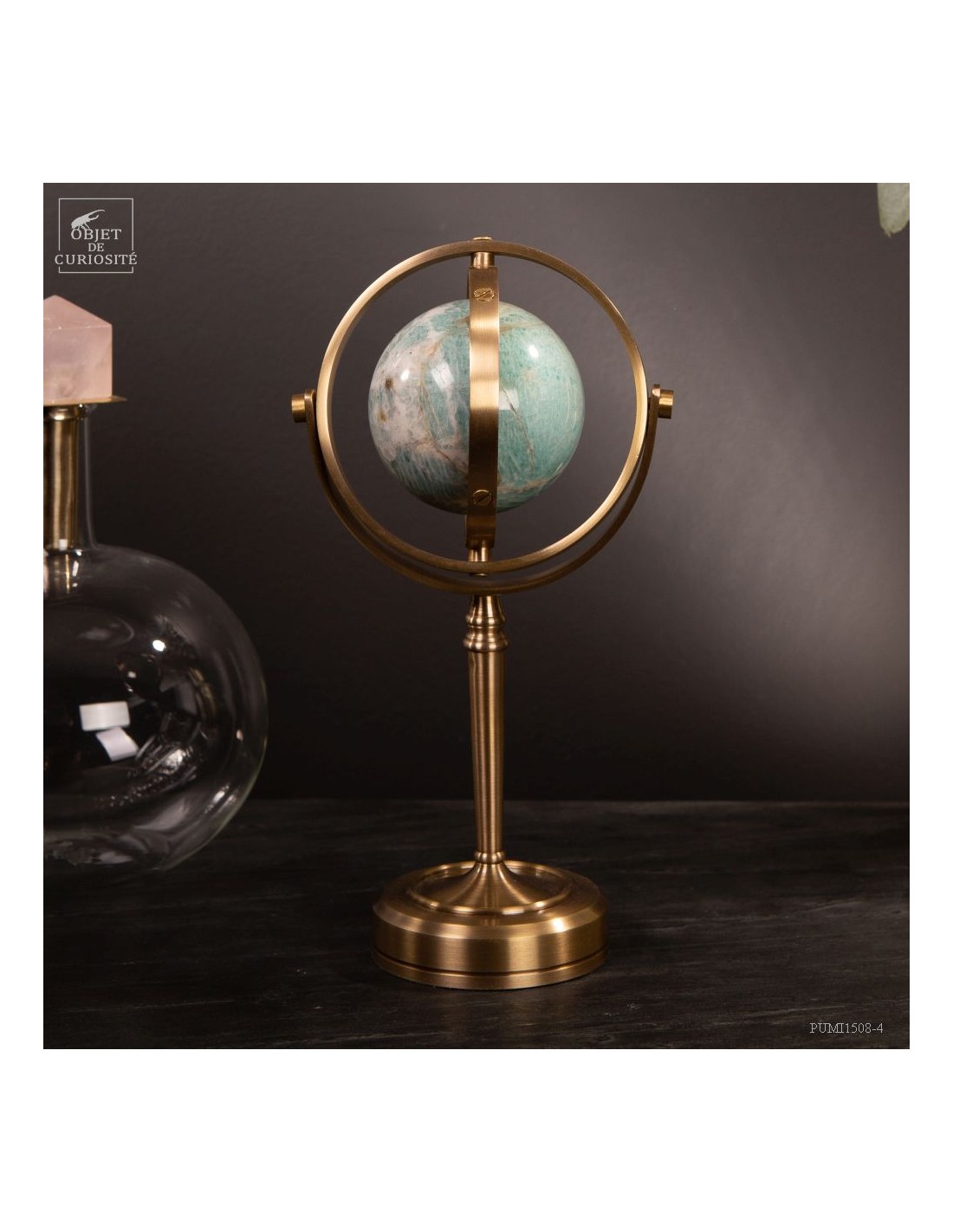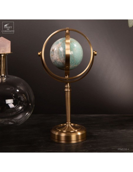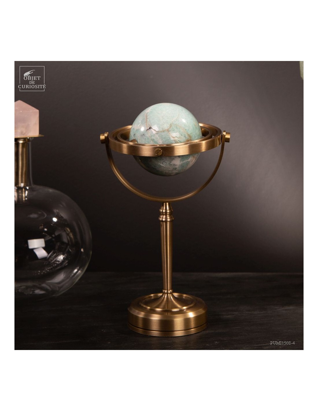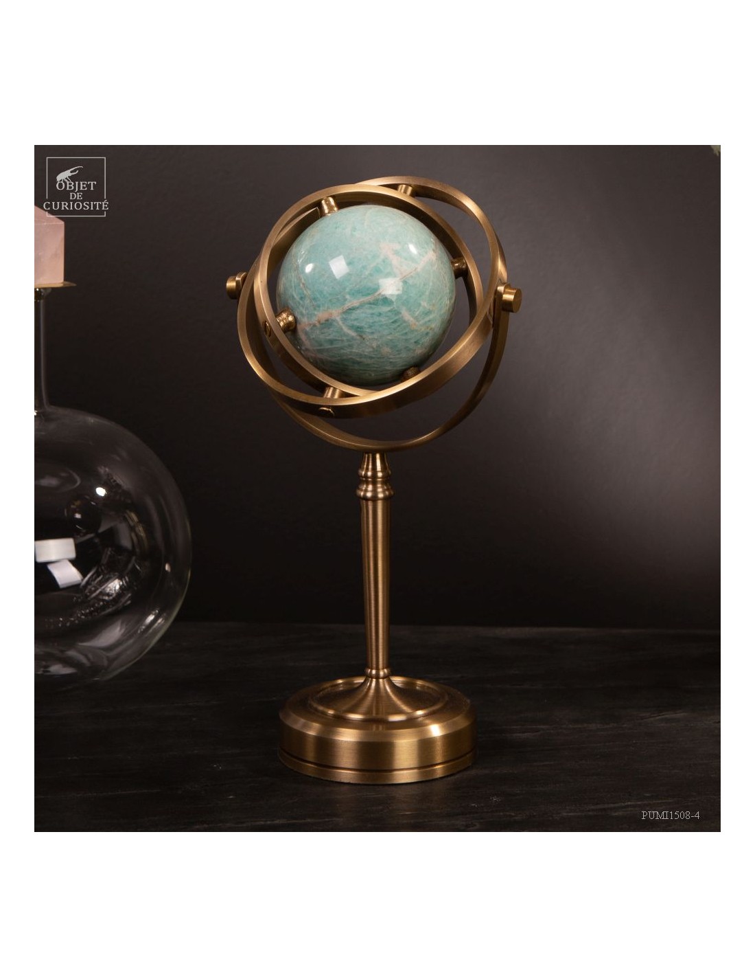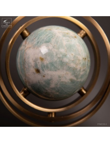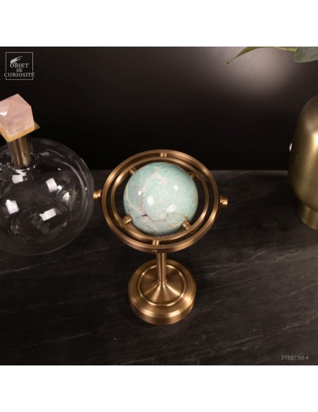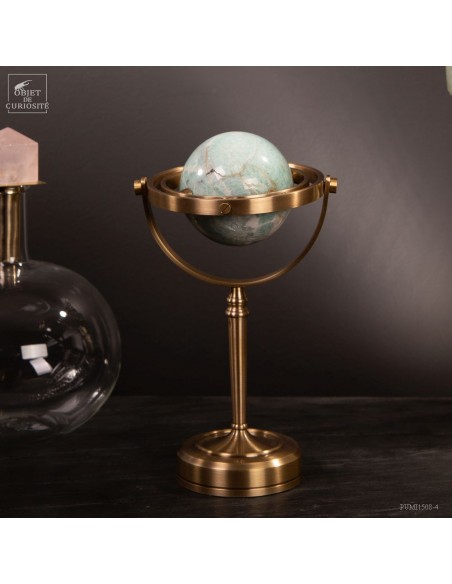 Ornamental stone of green color, blue-green translucent, almost the color of a beach on the Atlantic Ocean. This colour is likely to be given by small amounts of lead and water especially for feldspar. displayed in a spinning brass support for this stone from Madagascar. To let you imagine  the waves washing ashore again and again...