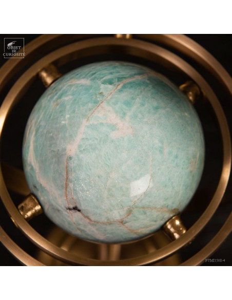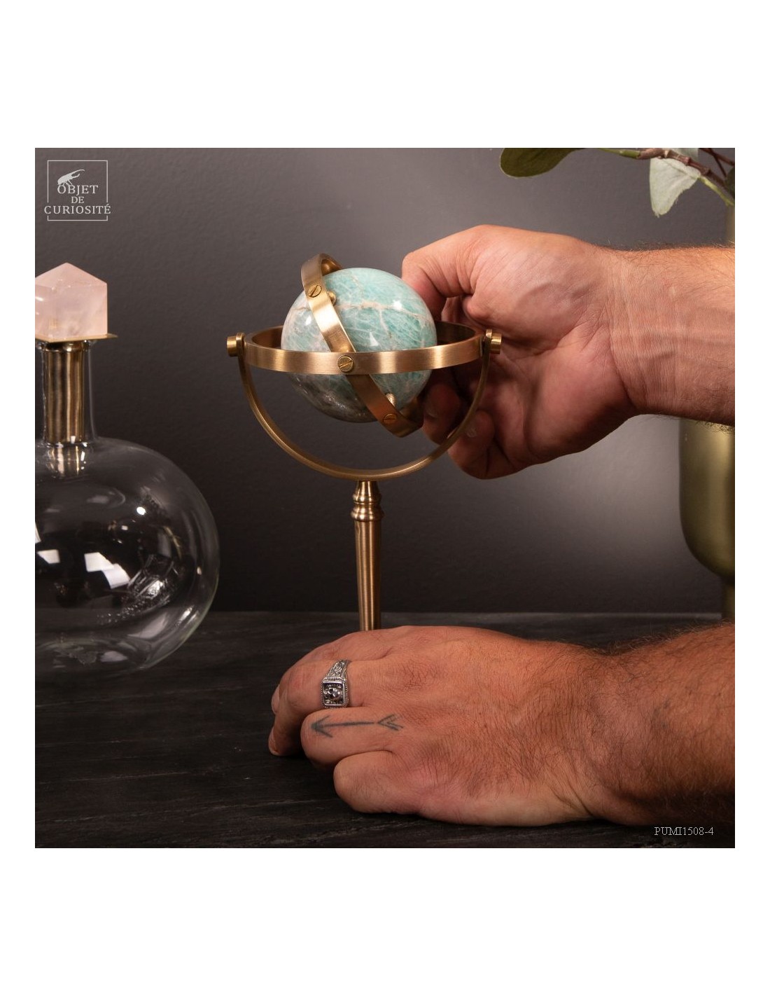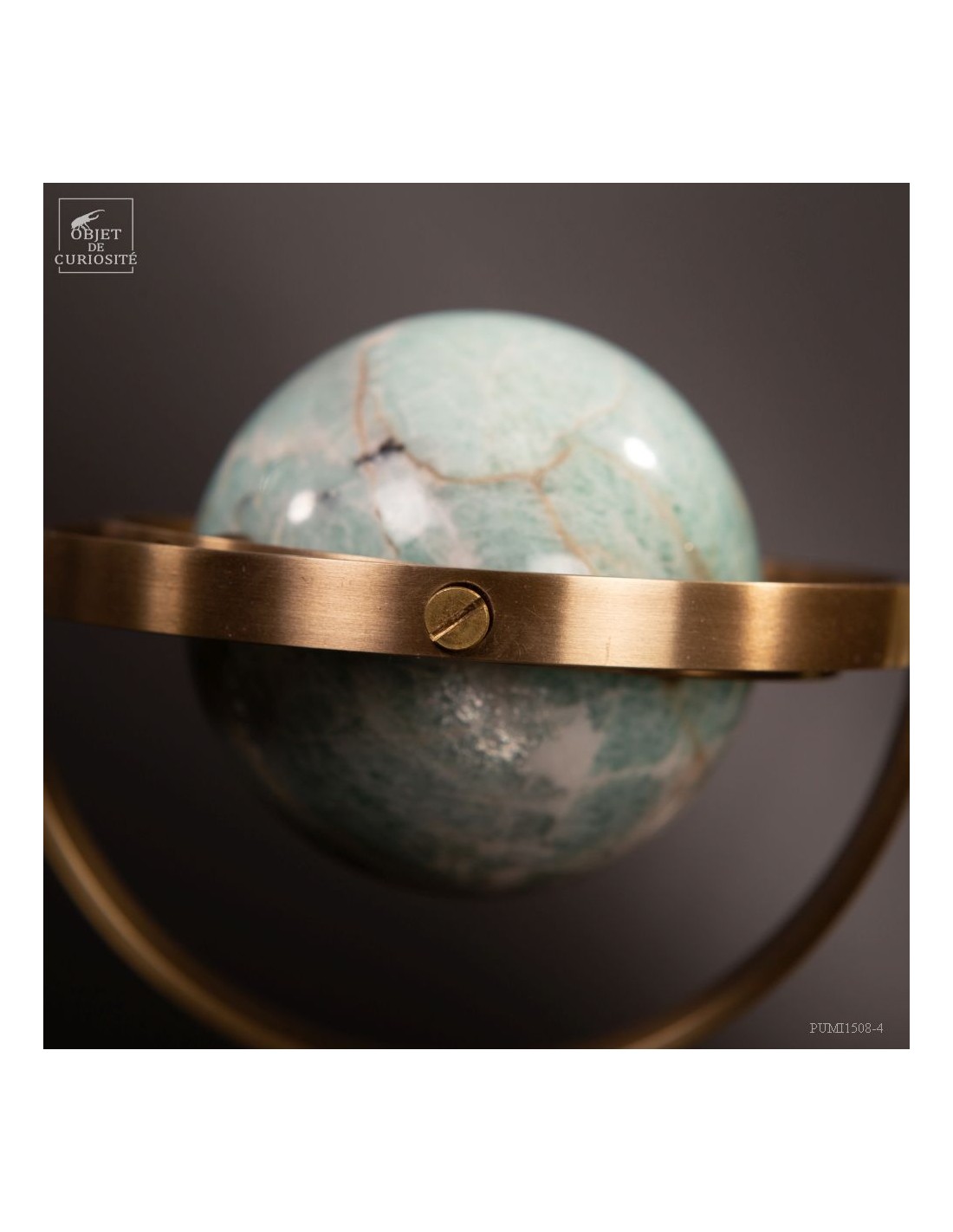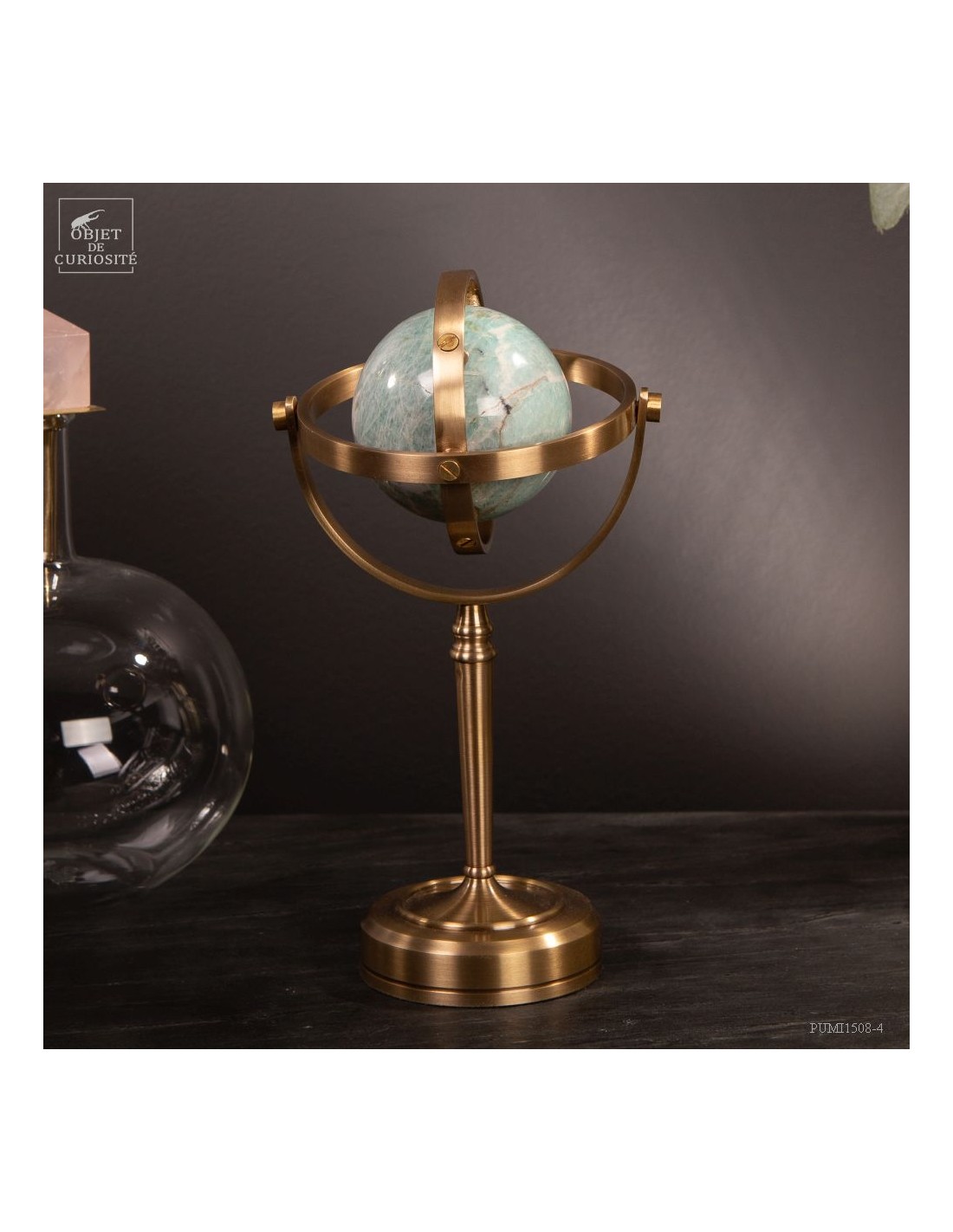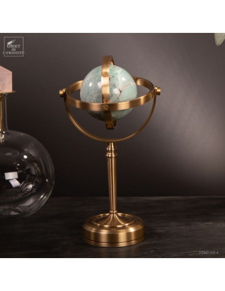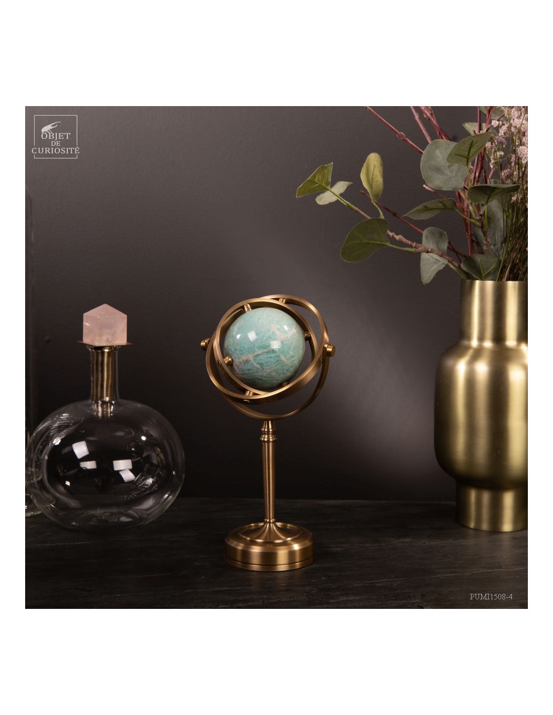 Ornamental stone of green color, blue-green translucent, almost the color of a beach on the Atlantic Ocean. This colour is likely to be given by small amounts of lead and water especially for feldspar. displayed in a spinning brass support for this stone from Madagascar. To let you imagine  the waves washing ashore again and again...
