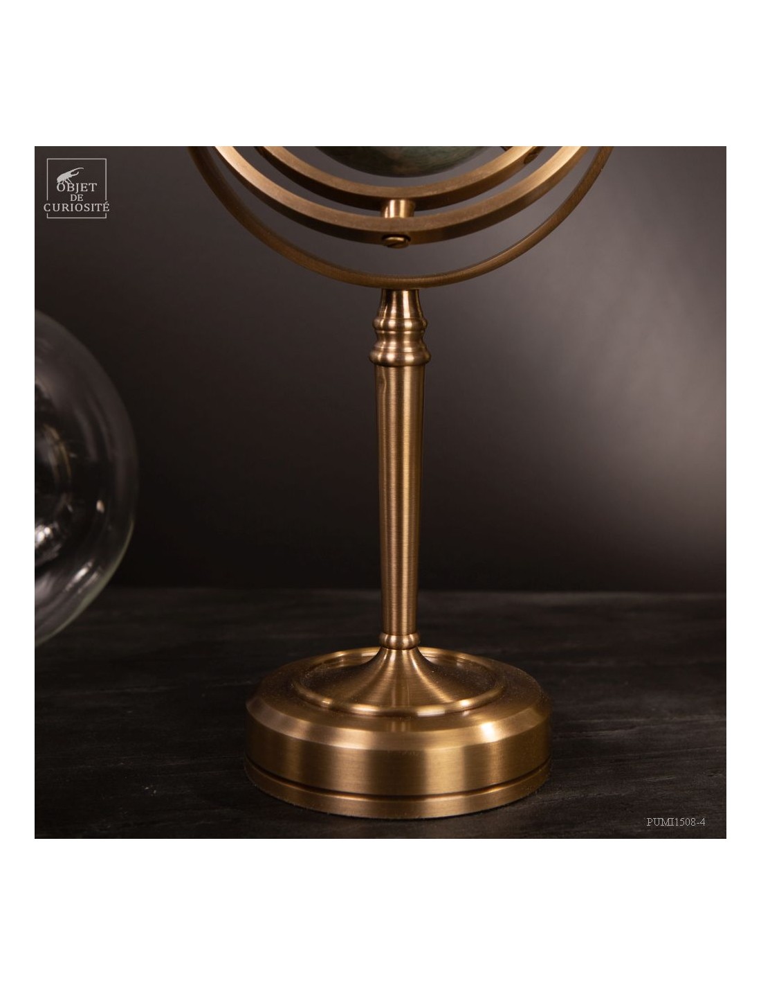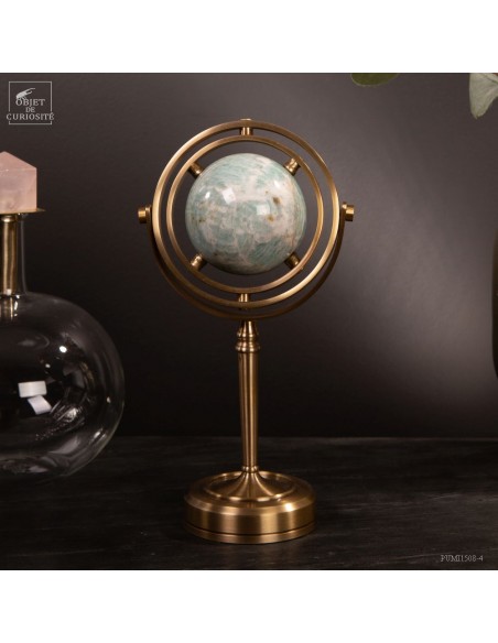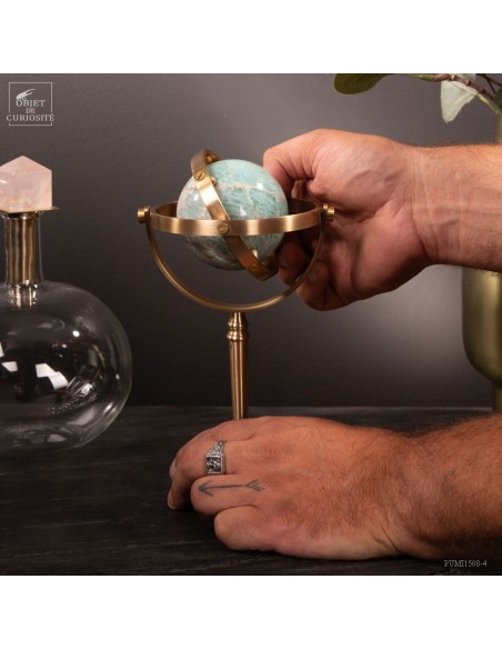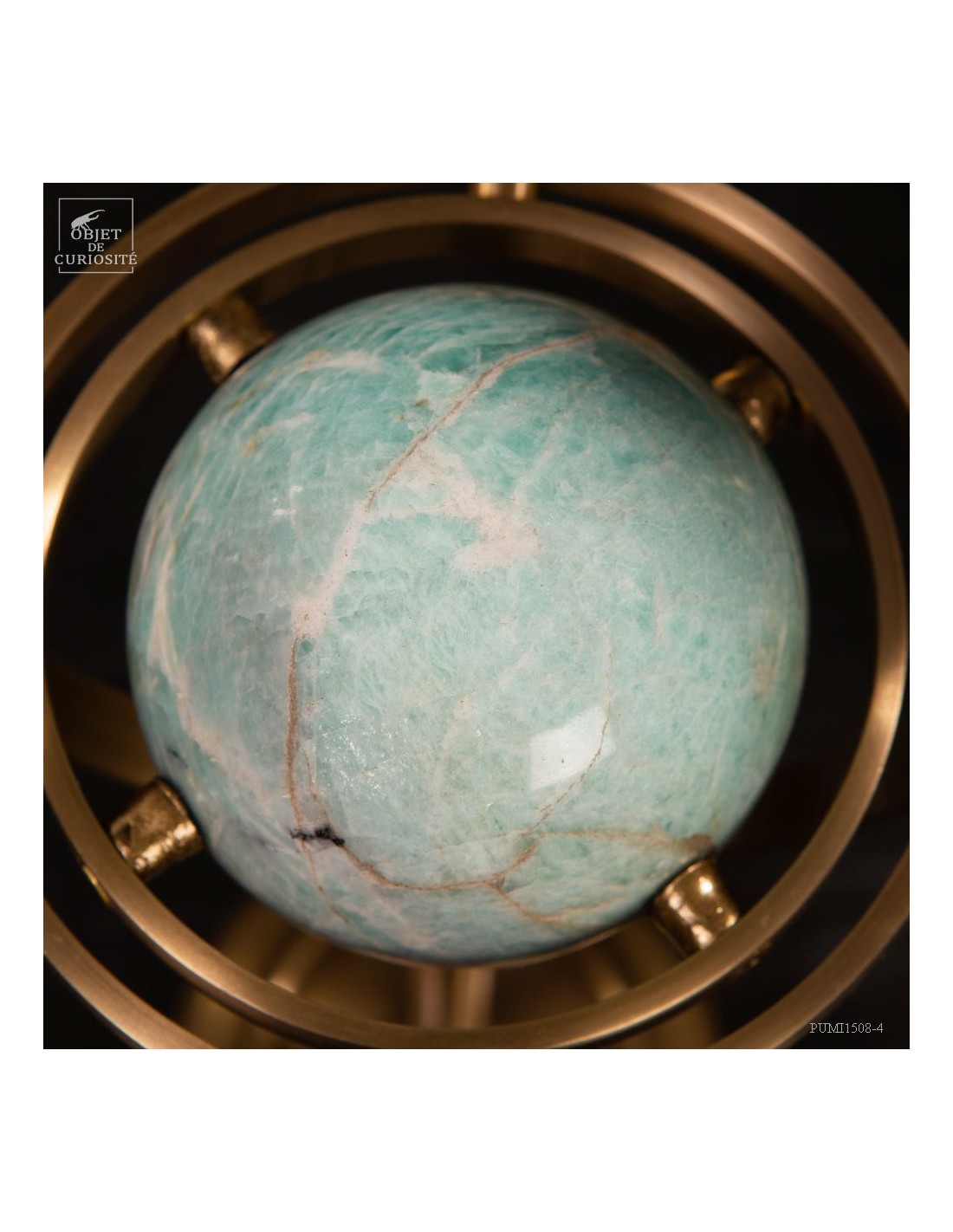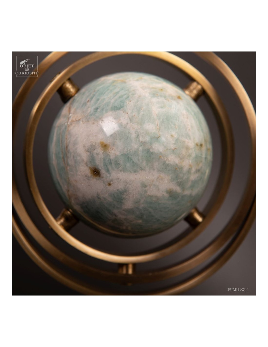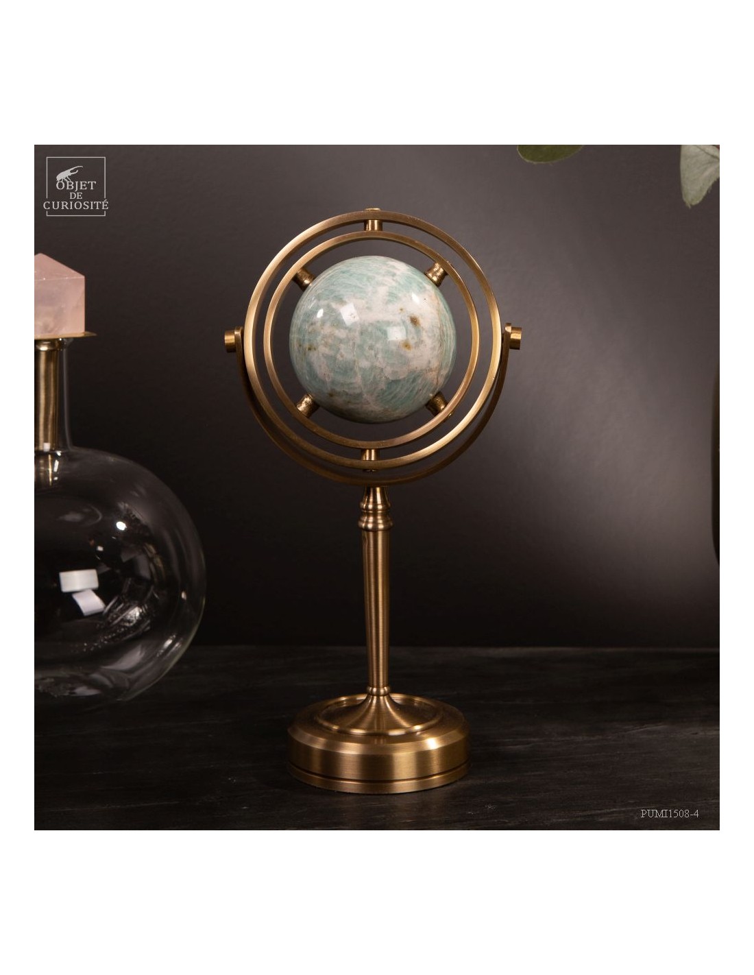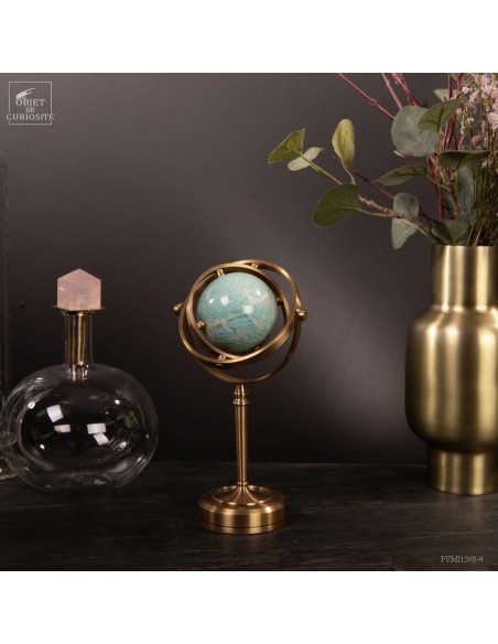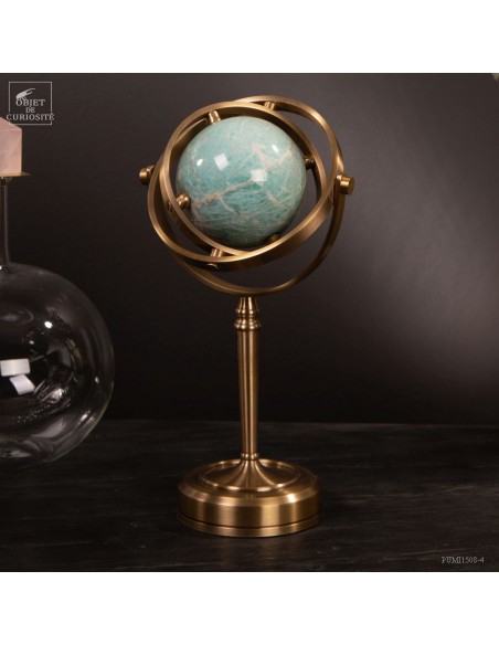 Ornamental stone of green color, blue-green translucent, almost the color of a beach on the Atlantic Ocean. This colour is likely to be given by small amounts of lead and water especially for feldspar. displayed in a spinning brass support for this stone from Madagascar. To let you imagine  the waves washing ashore again and again...