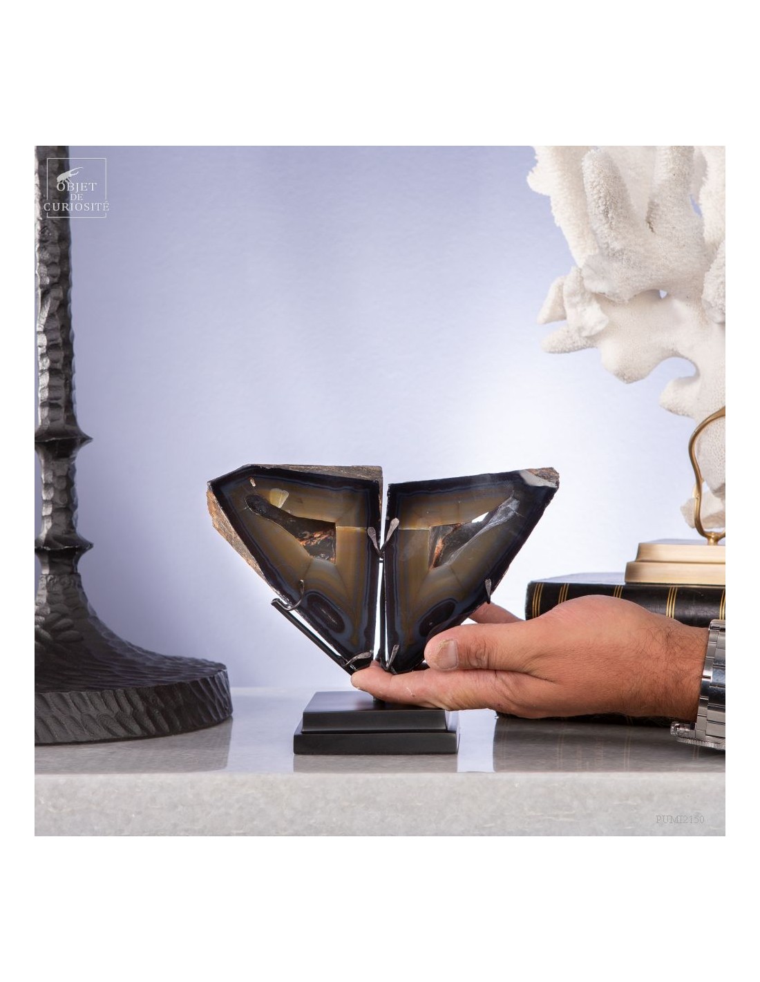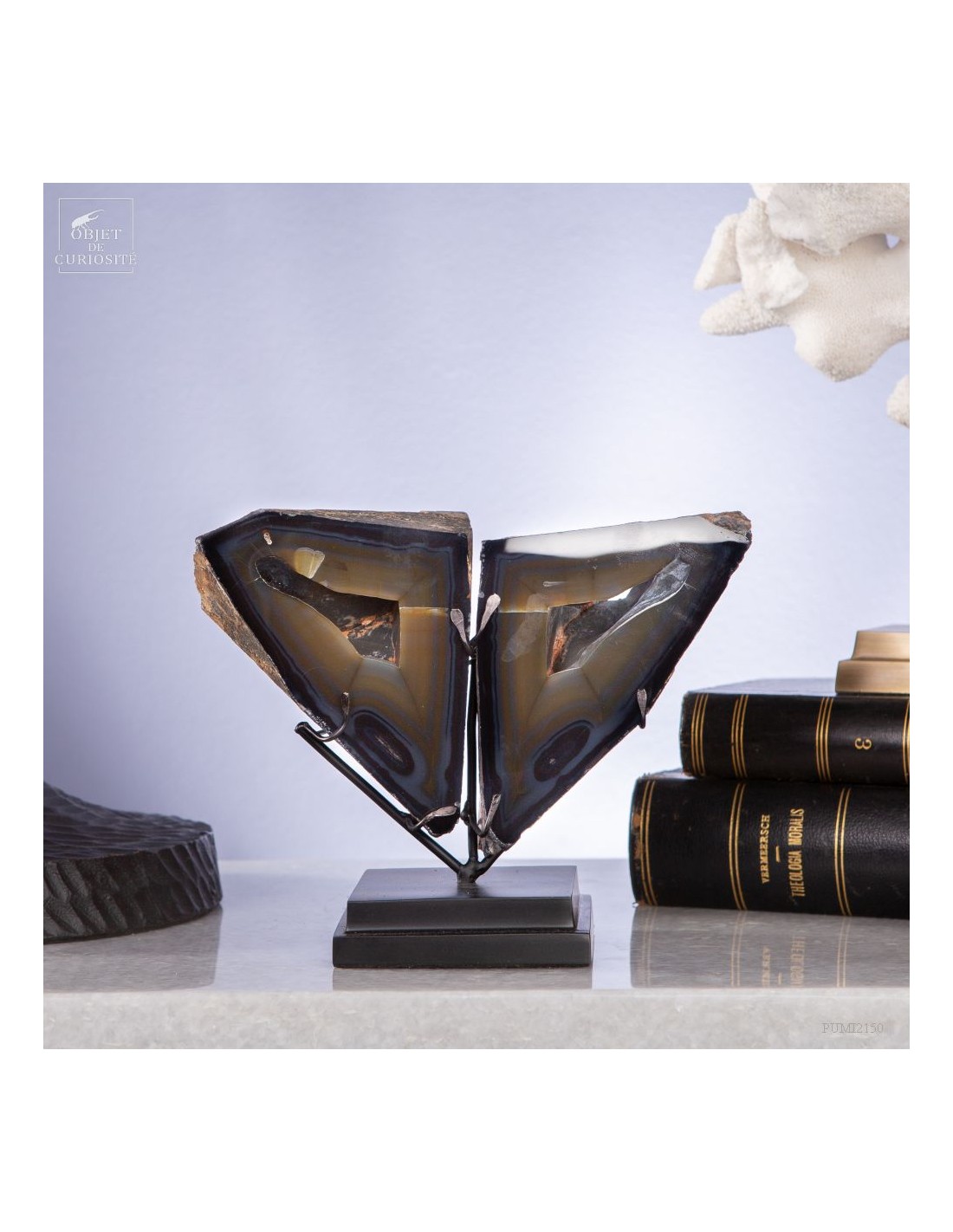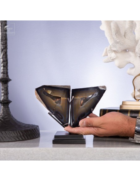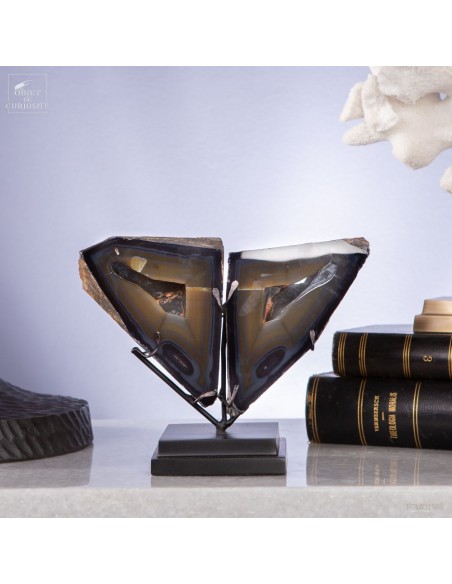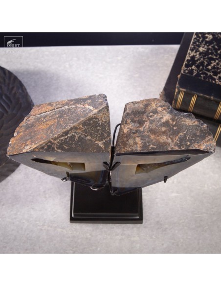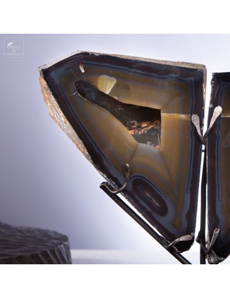 These two eyes staring at you will remain fix forever: it's a crystal cut in two of iPolyhedroid Agate. This geometrical Agate is unique in the world: discovered only one time in the world in late 1970's, in the Brazilian state of Paraiba. Agates are never geometrical, but... Some suggested that the polyhedroids formed in the interstices between tabular crystals of calcite. And other are thinking of a pseudomorph after feldspar (replacement of the feldspar crystal by agate due to dissolution) or… we don’t know for sure! It happened once, and might never be seen again, as the area is now under the water of a dam.