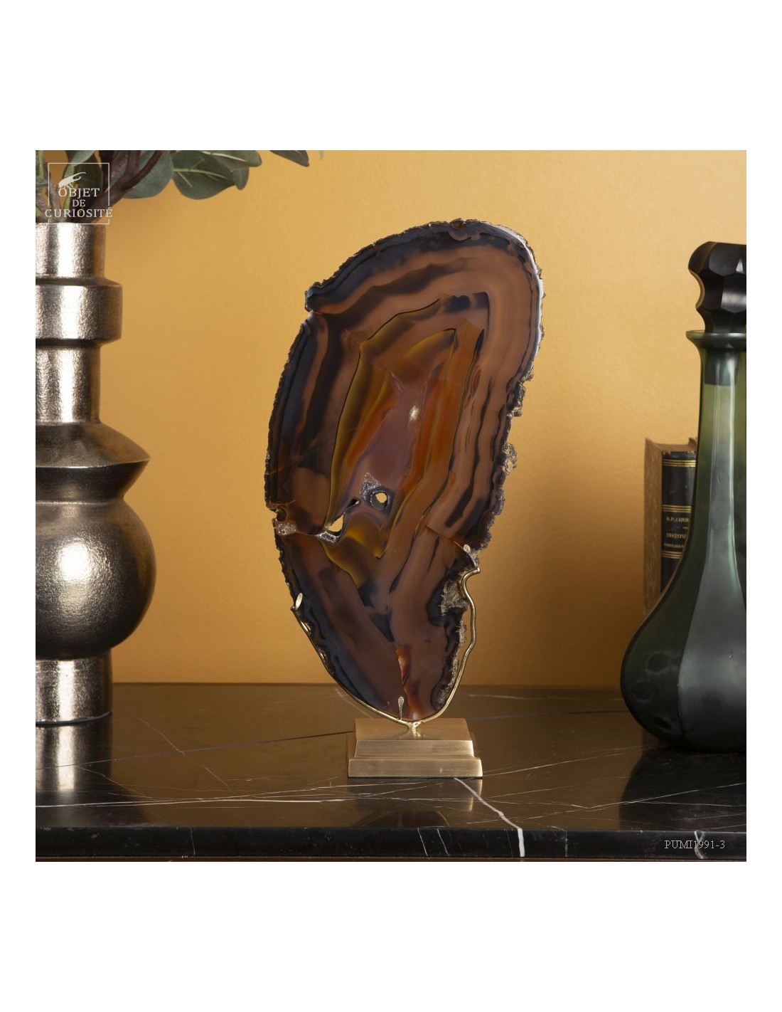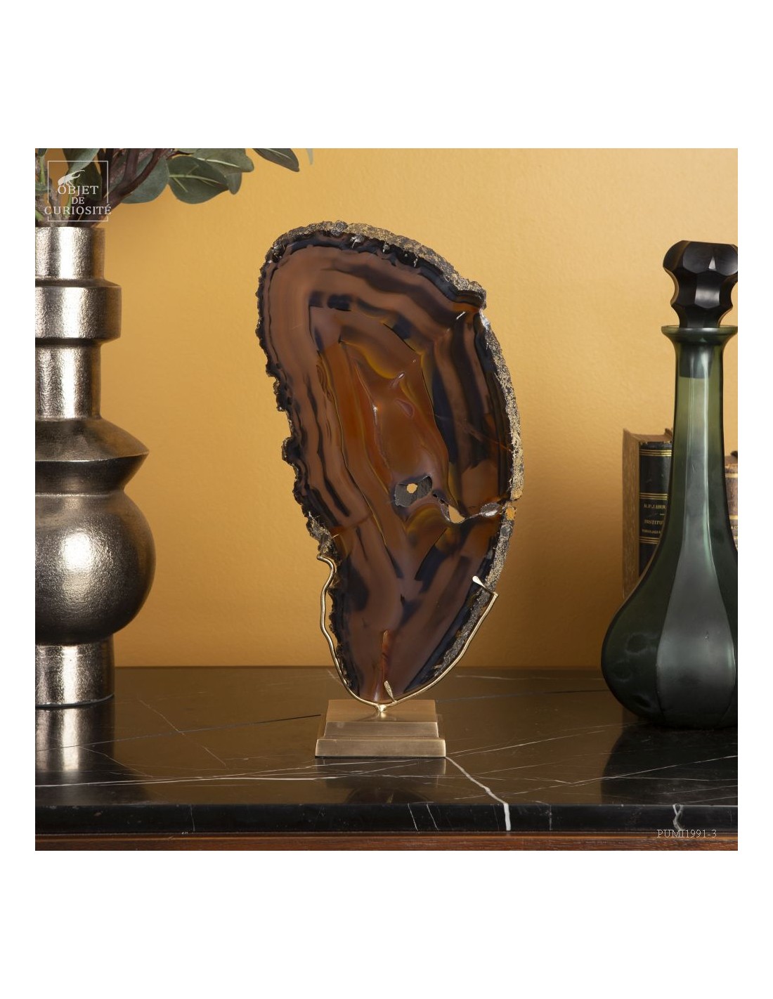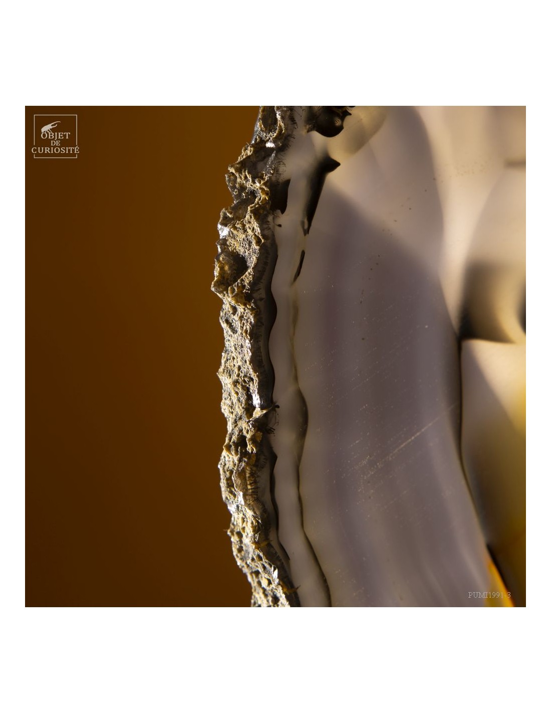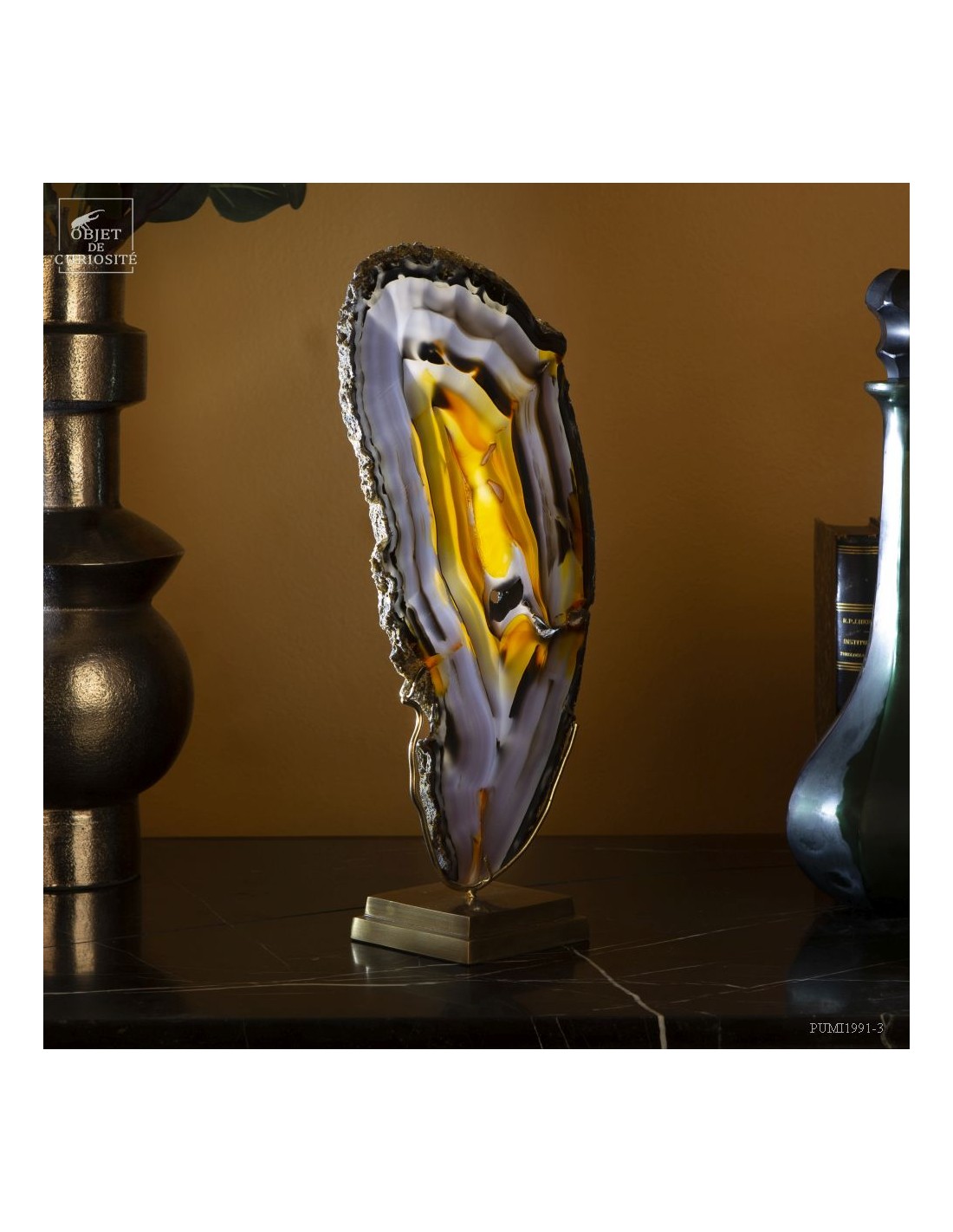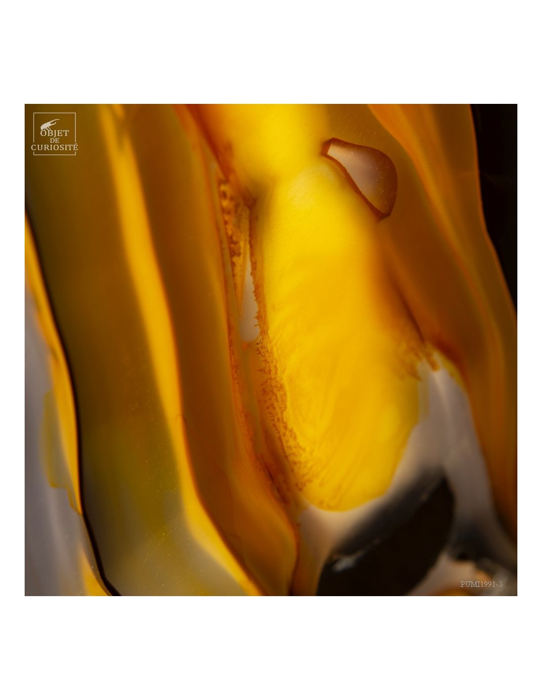 Golden agate from brazil, large size. Cut into a thin slice, it becomes translucent and lets light pass through. This is quite remarkable on photos 3,4 and 5: it will do this effect every time it is in front of a window or another light source... The heart changes from a caramel tone to a golden yellow, which makes it so bright.