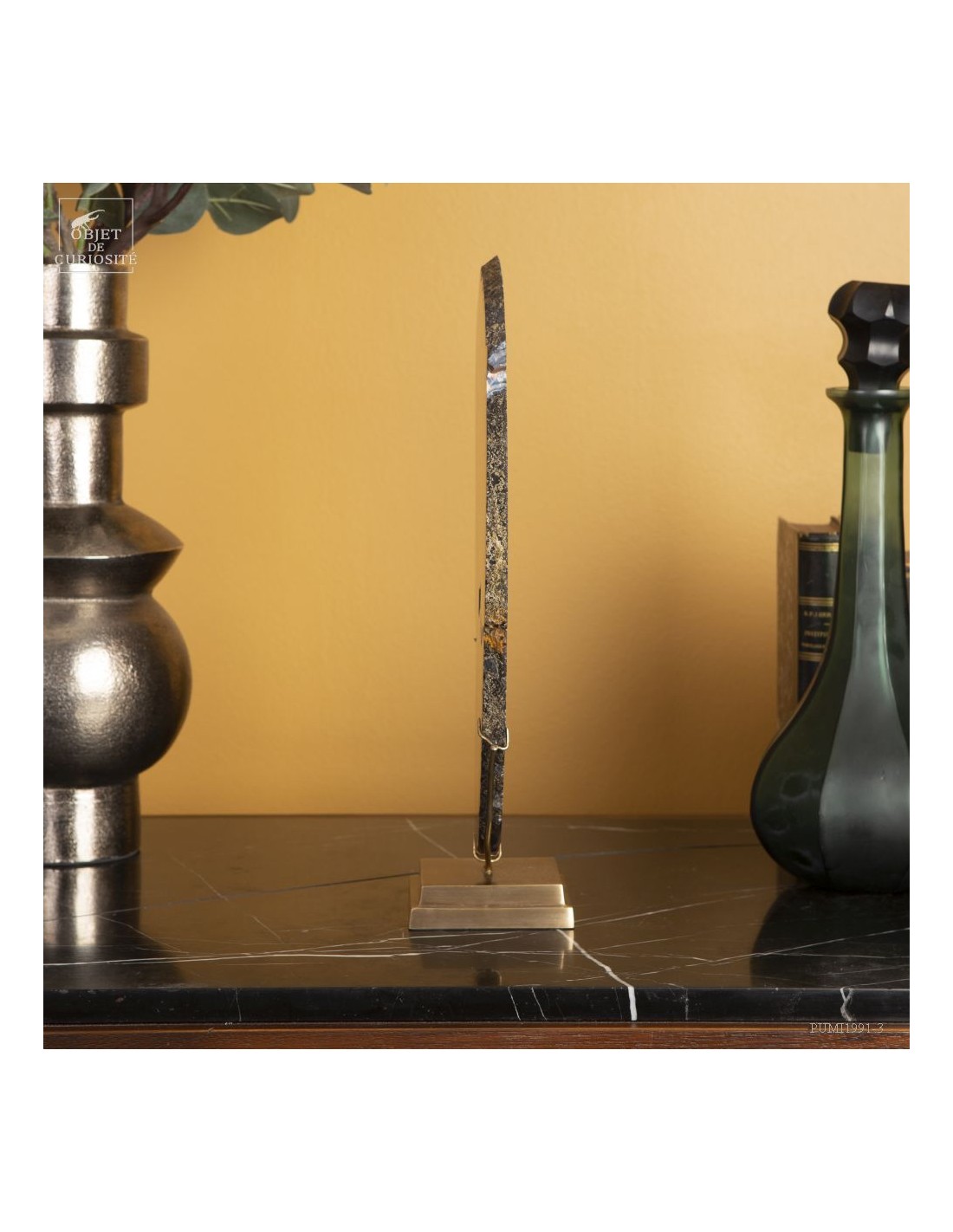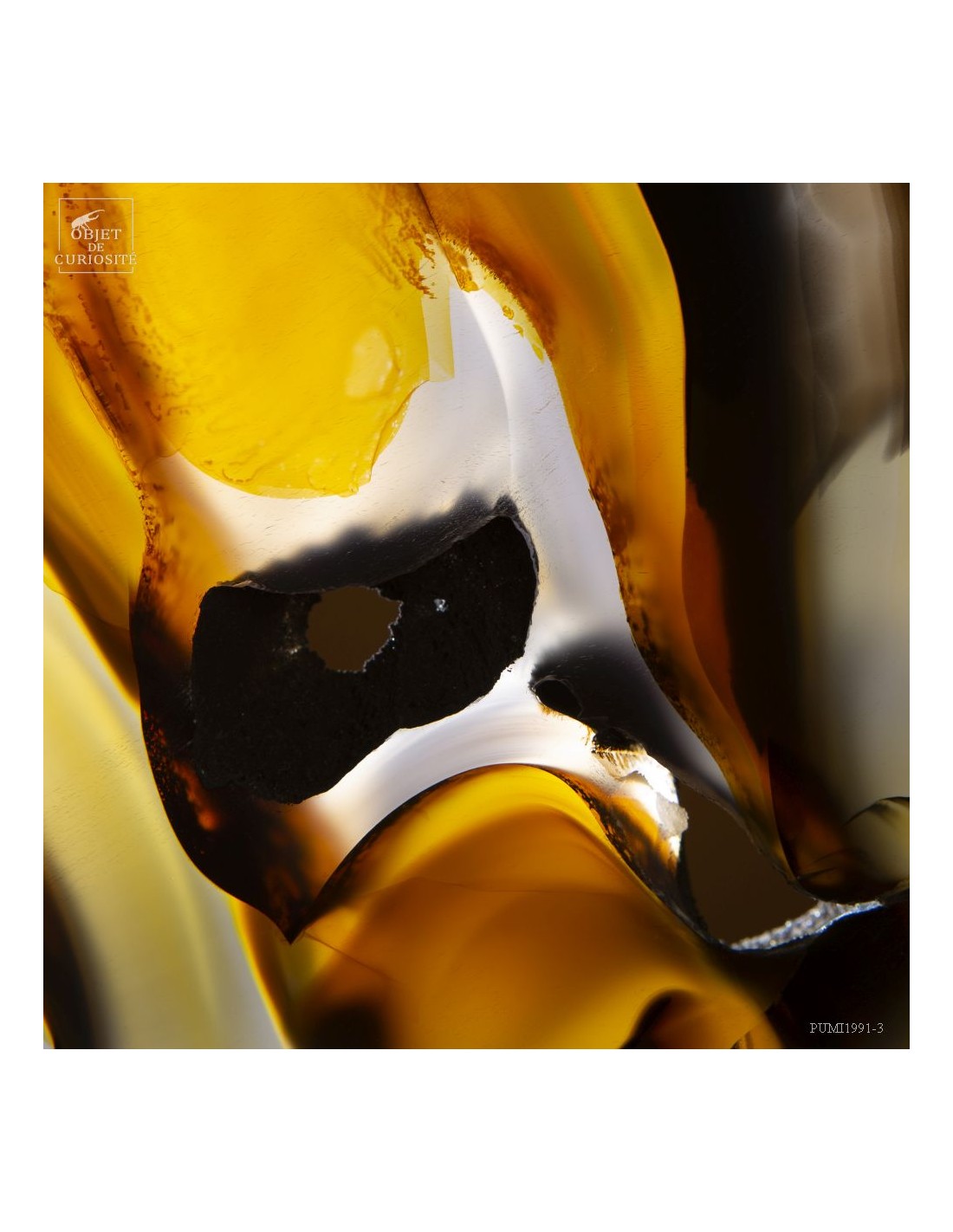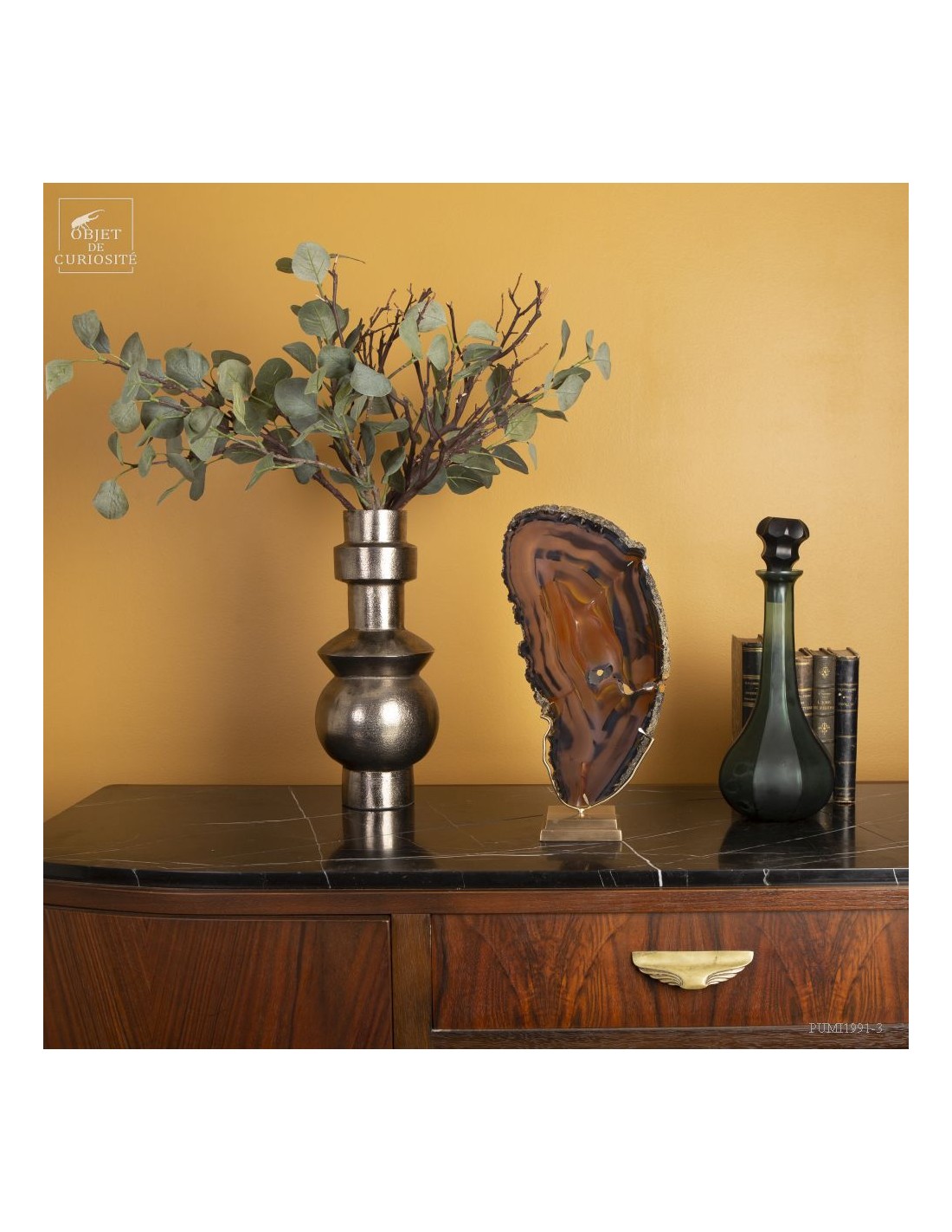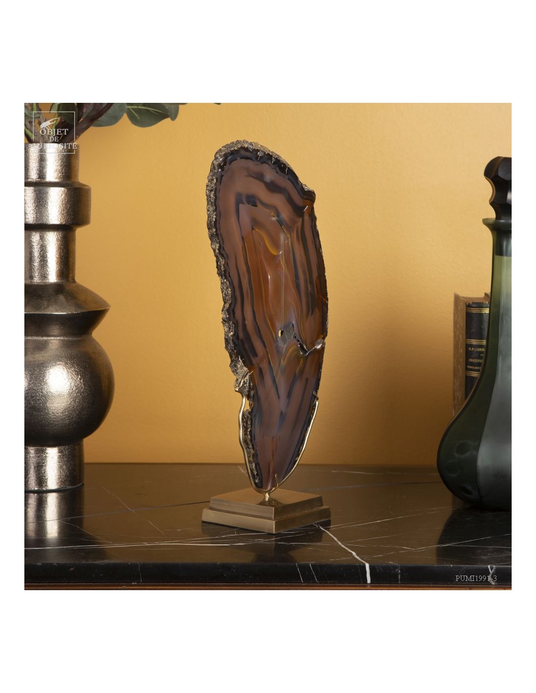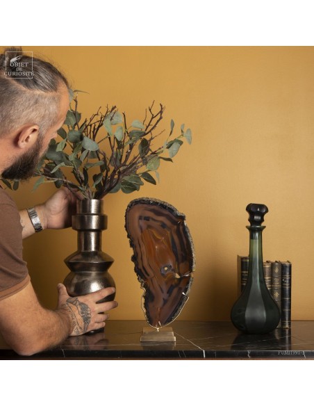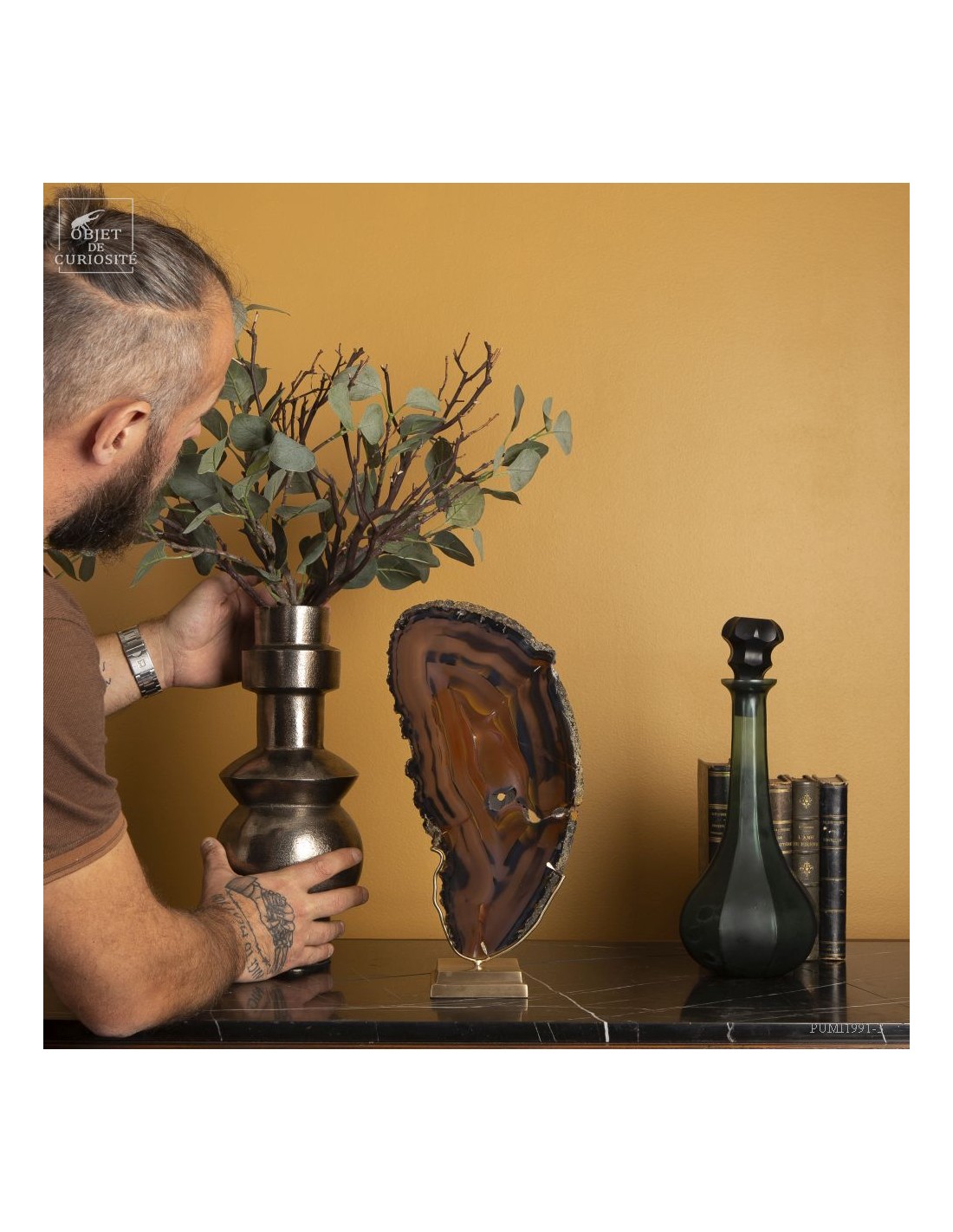 Golden agate from brazil, large size. Cut into a thin slice, it becomes translucent and lets light pass through. This is quite remarkable on photos 3,4 and 5: it will do this effect every time it is in front of a window or another light source... The heart changes from a caramel tone to a golden yellow, which makes it so bright.