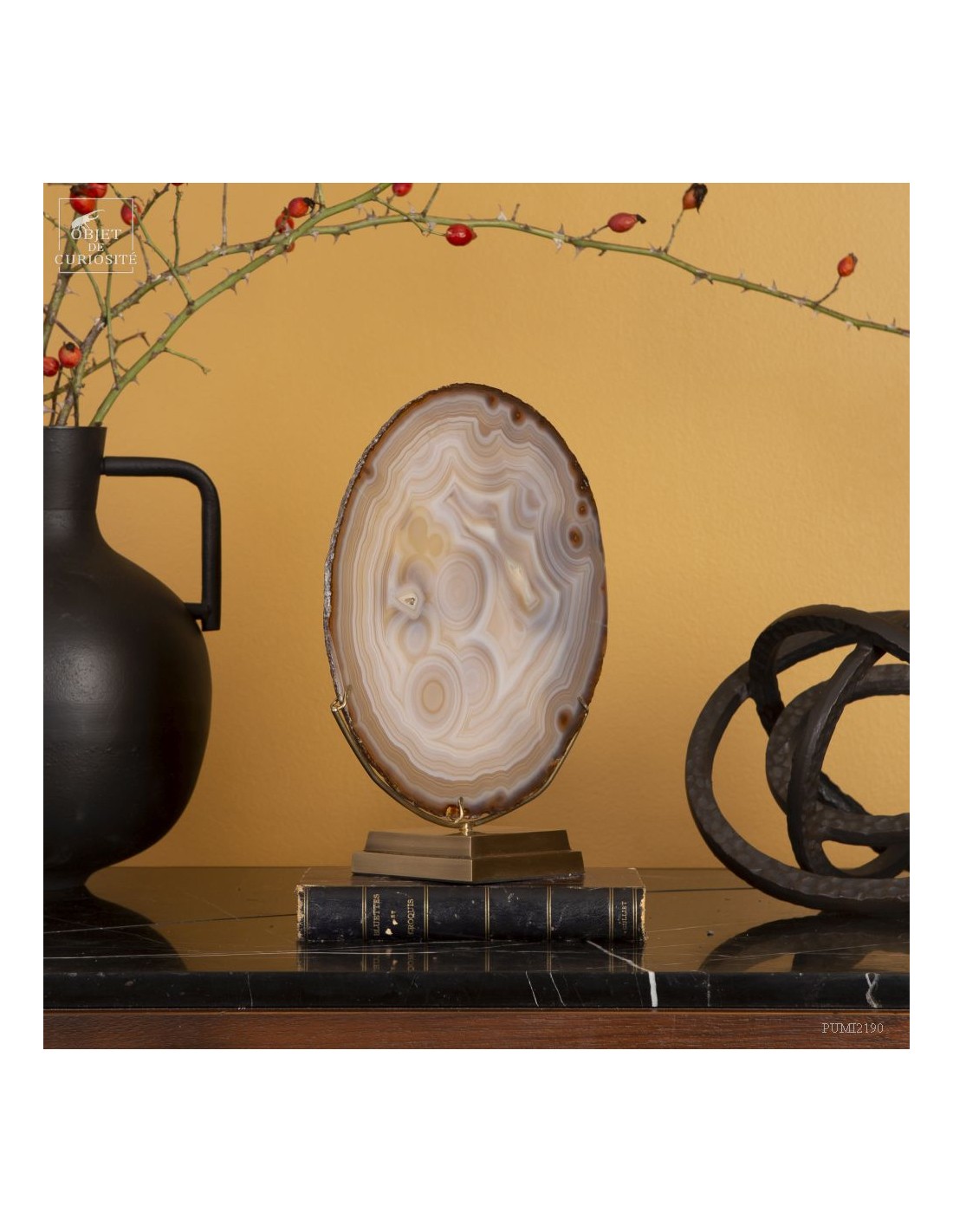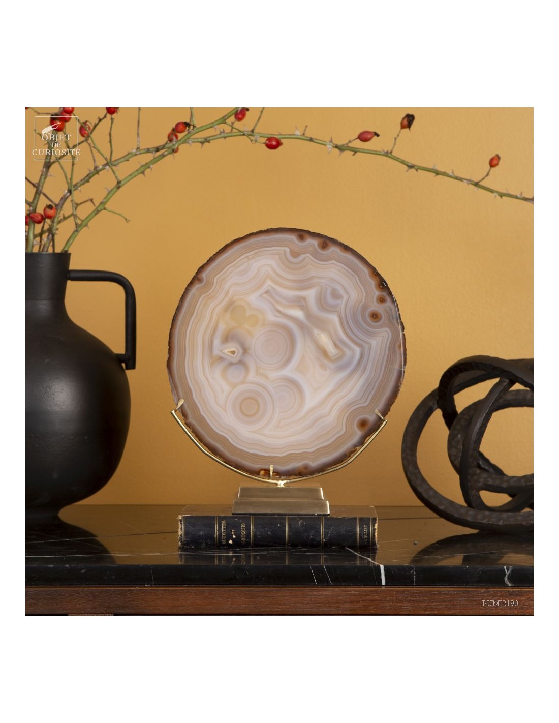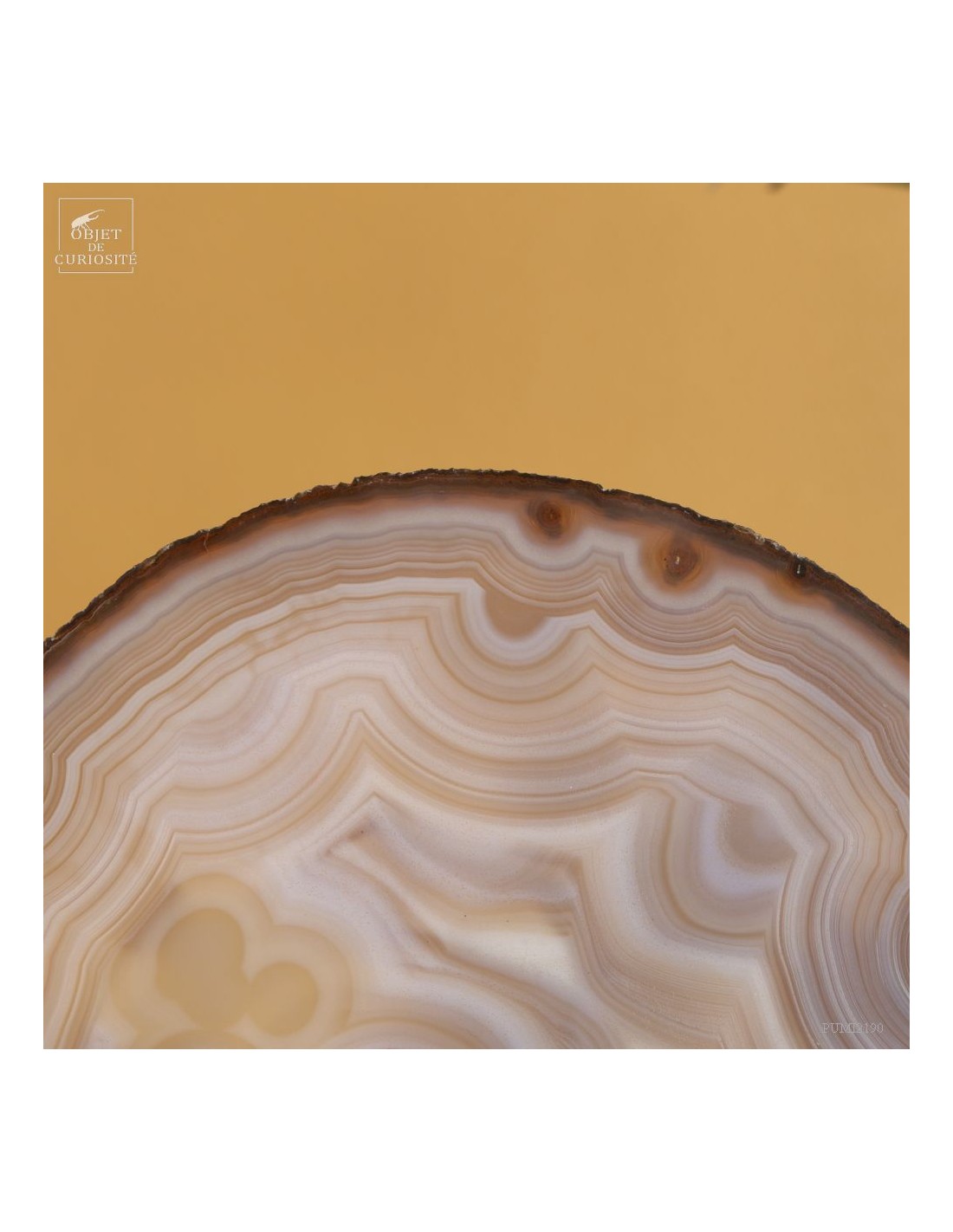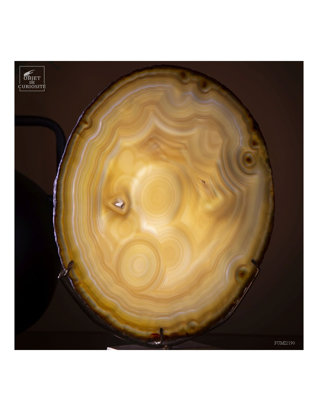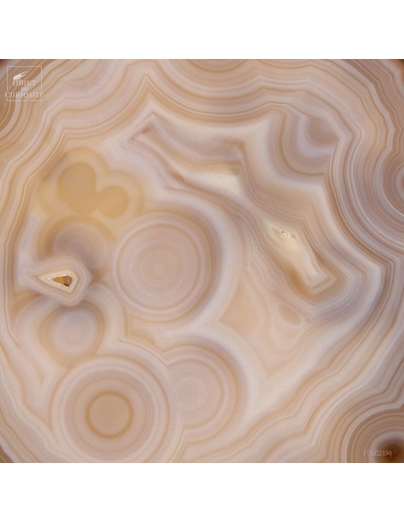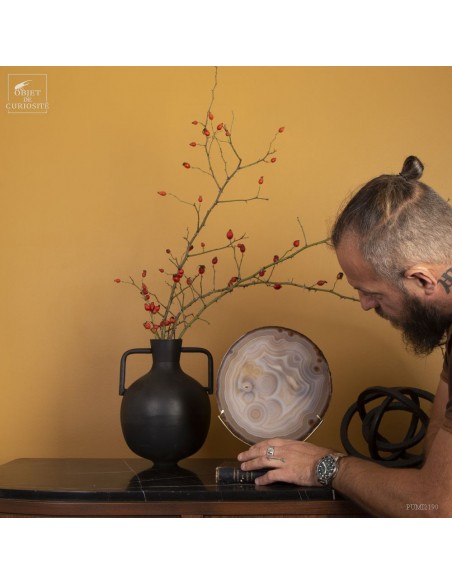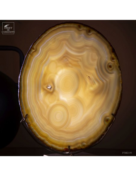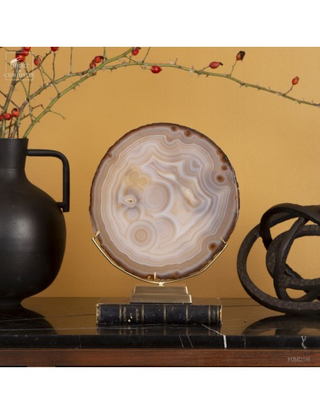 Golden agate from Brazil, on brass base. Cut into thin slices, it becomes translucent and lets light pass through. It is also quite remarkable in photo 5: it will make this effect whenever it is in front of a window or other light source... Its composition is rare because it has "filled" around nucleus, and water charged with iron oxides, among other things, deposited a layer at each big change of temperature, by evaporation. A true textile pattern.