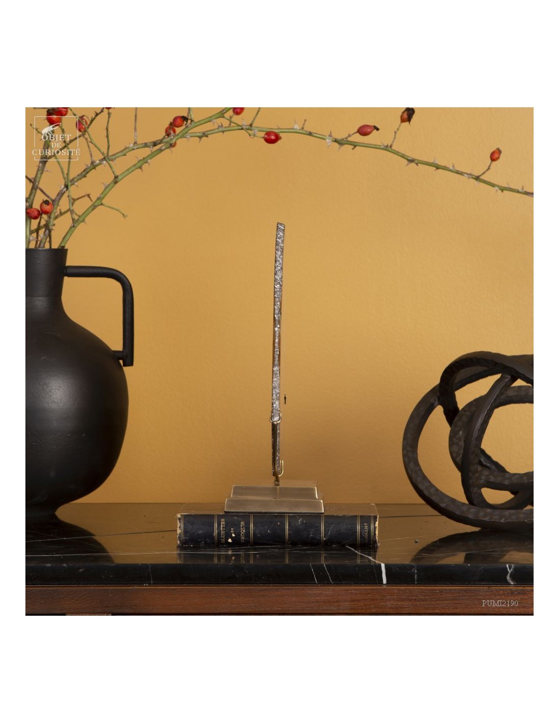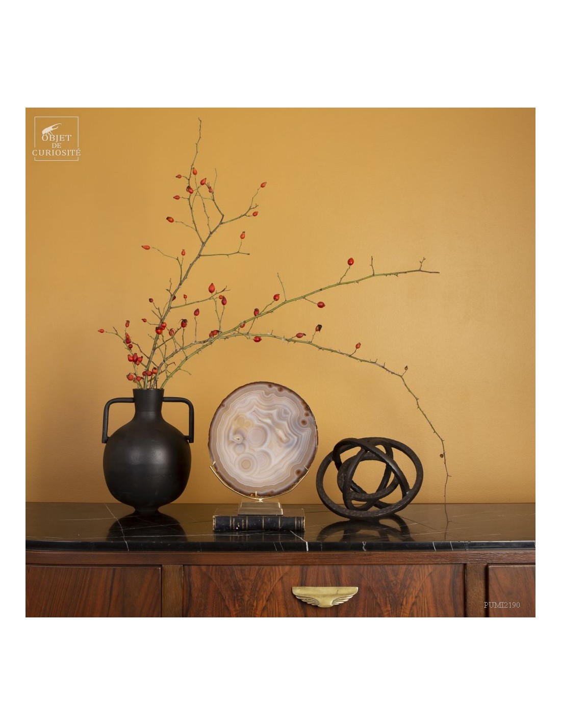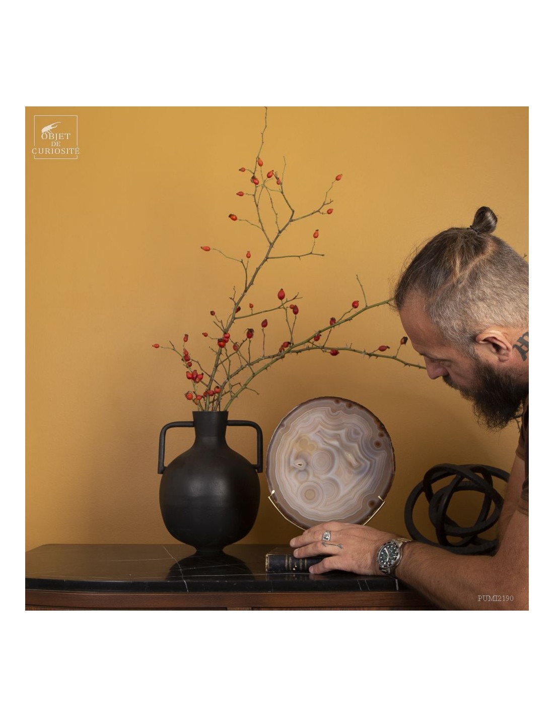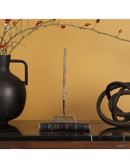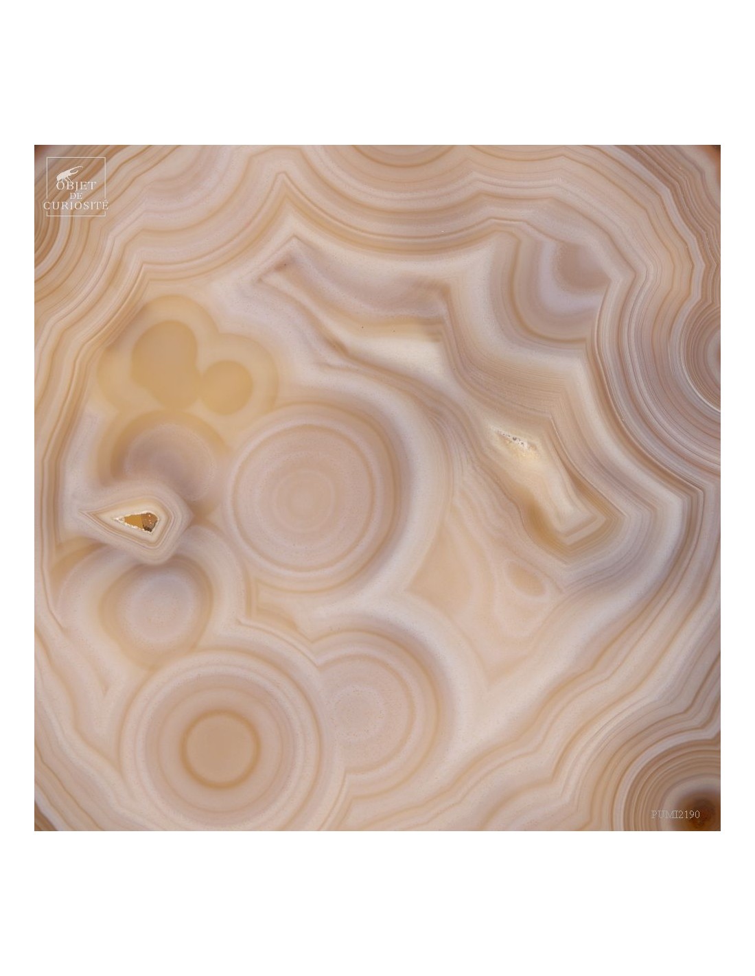Golden agate from Brazil, on brass base. Cut into thin slices, it becomes translucent and lets light pass through. It is also quite remarkable in photo 5: it will make this effect whenever it is in front of a window or other light source... Its composition is rare because it has "filled" around nucleus, and water charged with iron oxides, among other things, deposited a layer at each big change of temperature, by evaporation. A true textile pattern.
