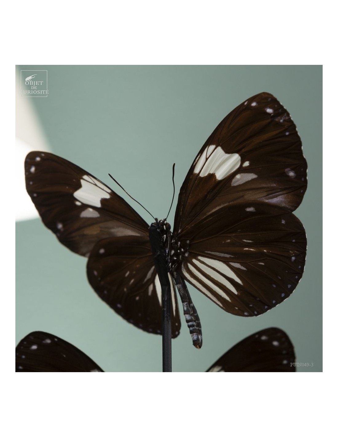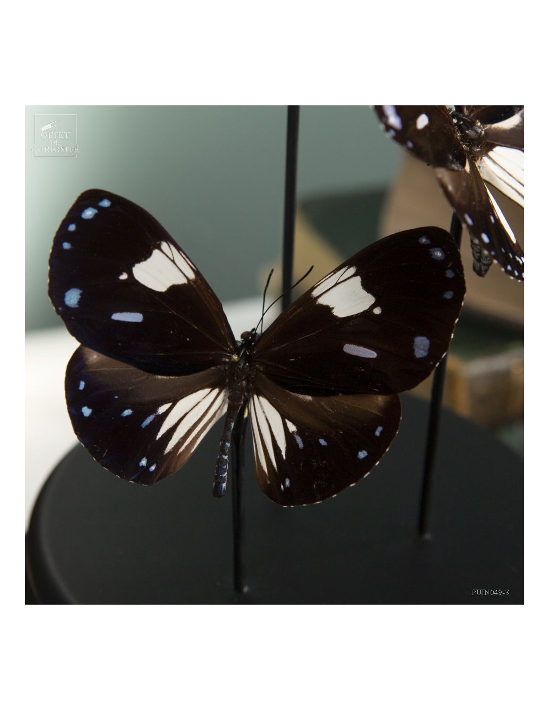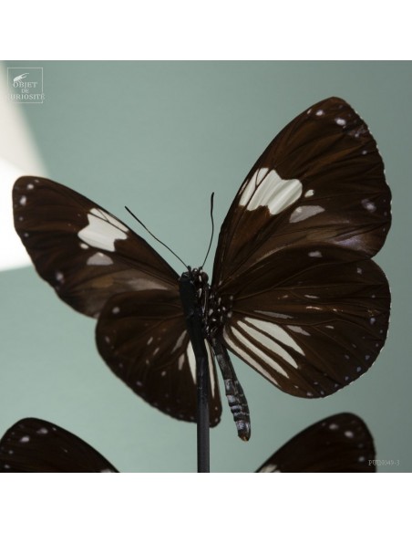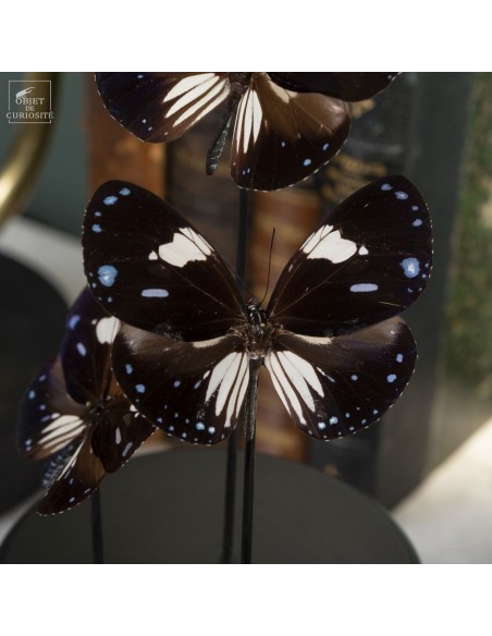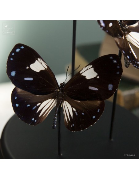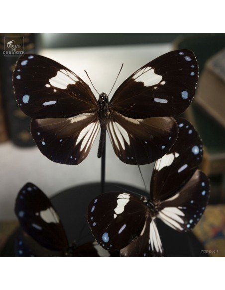 These black and white butterflies with small blue dots are Hypolimnas anthedon dubius, the Variable Tiara. A butterfly that lives in the forests of Central Africa. These ones, captured in January 2011, come from the Central African Republic, more precisely from Mongoumba, along the banks of the Oubangui river in the Lobaye region.