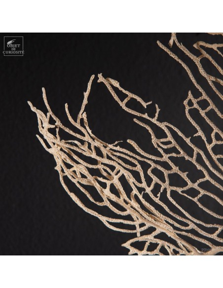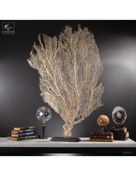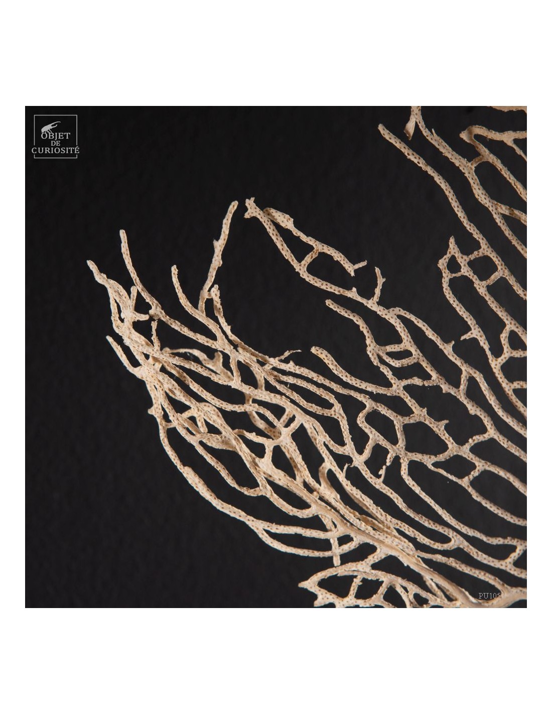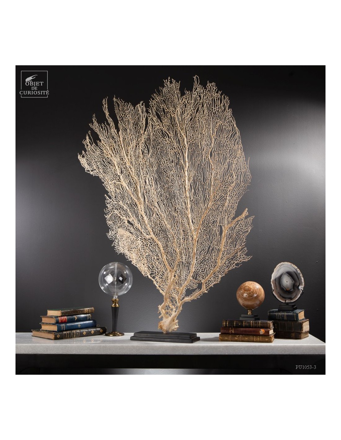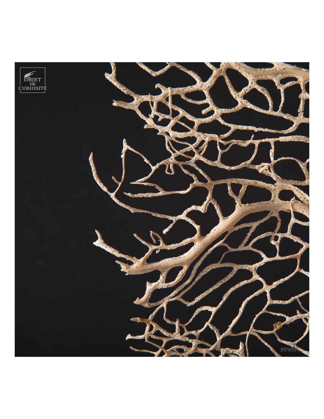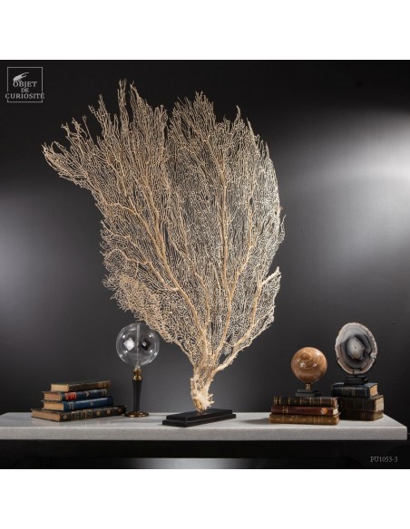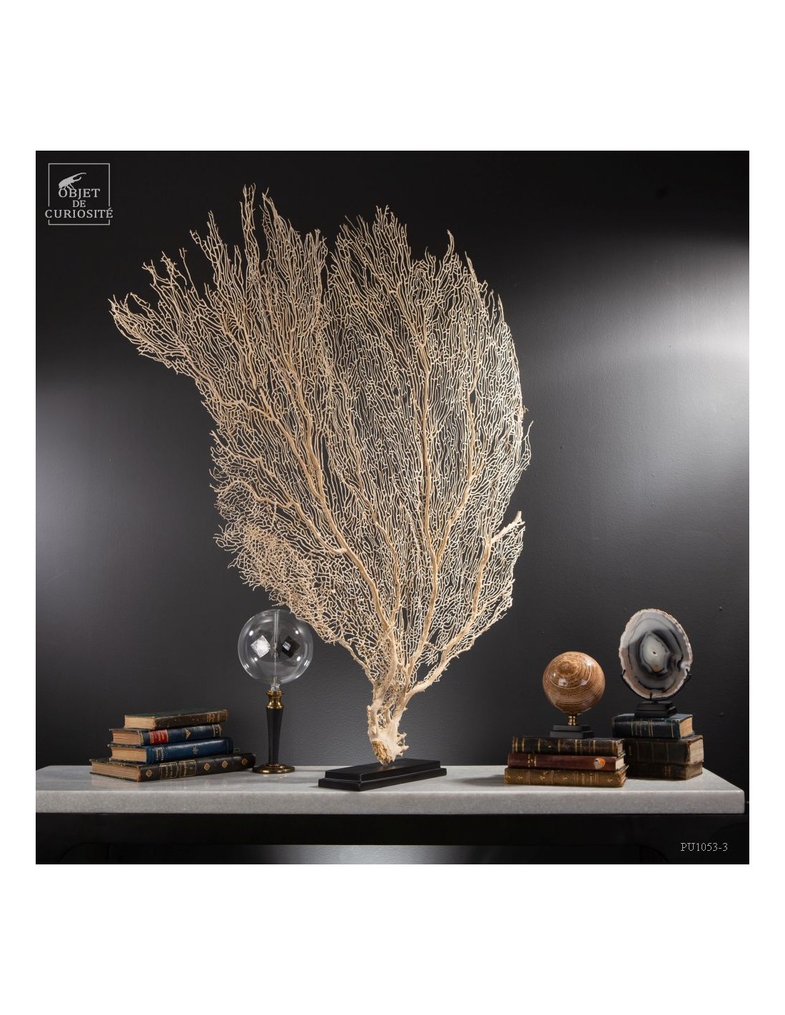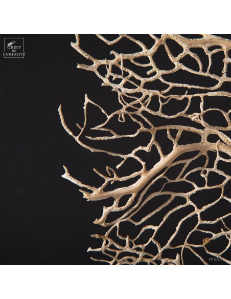 Off-white natural Gorgonia, over 1 meter high, on a black metal base. This beige skeleton look like lace. No wonder why they are called sea-fan: when they reach that size,they look like a screen. They can be a great divider in a room, on a console  and we also have a black spicky species than can reach the same size, also from Micronesia. Bringing some mistery if you look through it, without blocking the light.