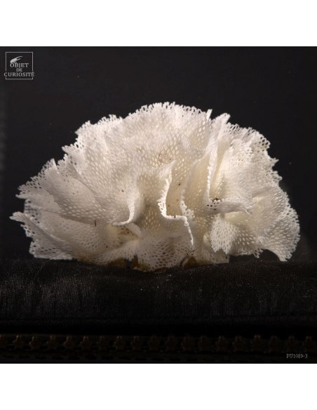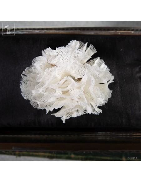 A sea lace on a silk cushion. It is the delicate skeleton left by a colony of Bryozoans in the Mediterranean Sea. These animals, very similar to coral polyps, live in colonies hooked all their life to the same substrate. They lives in colonies, connected by kind of nerves, sharing food . We know 5000 species with diferent shapes, sizes, and structures, rigid (limestone) or flexible (chitinous). The visible part, which protects the bryozoaire (Bryozons) can be disc , fan, slices, corkscrew, stick,... shaped. This species is a Triphyllozoon sp. When they die, they become so many little touches of lace in the ocean.