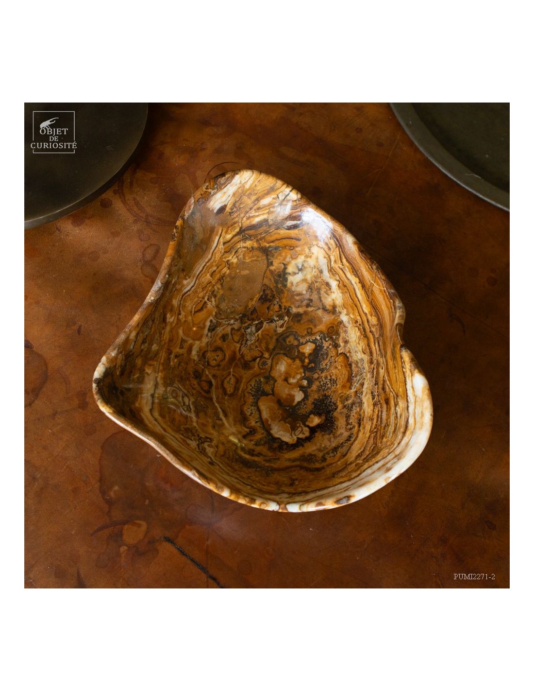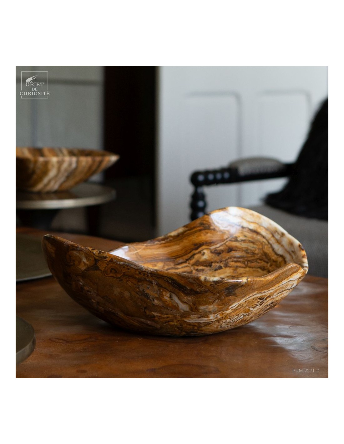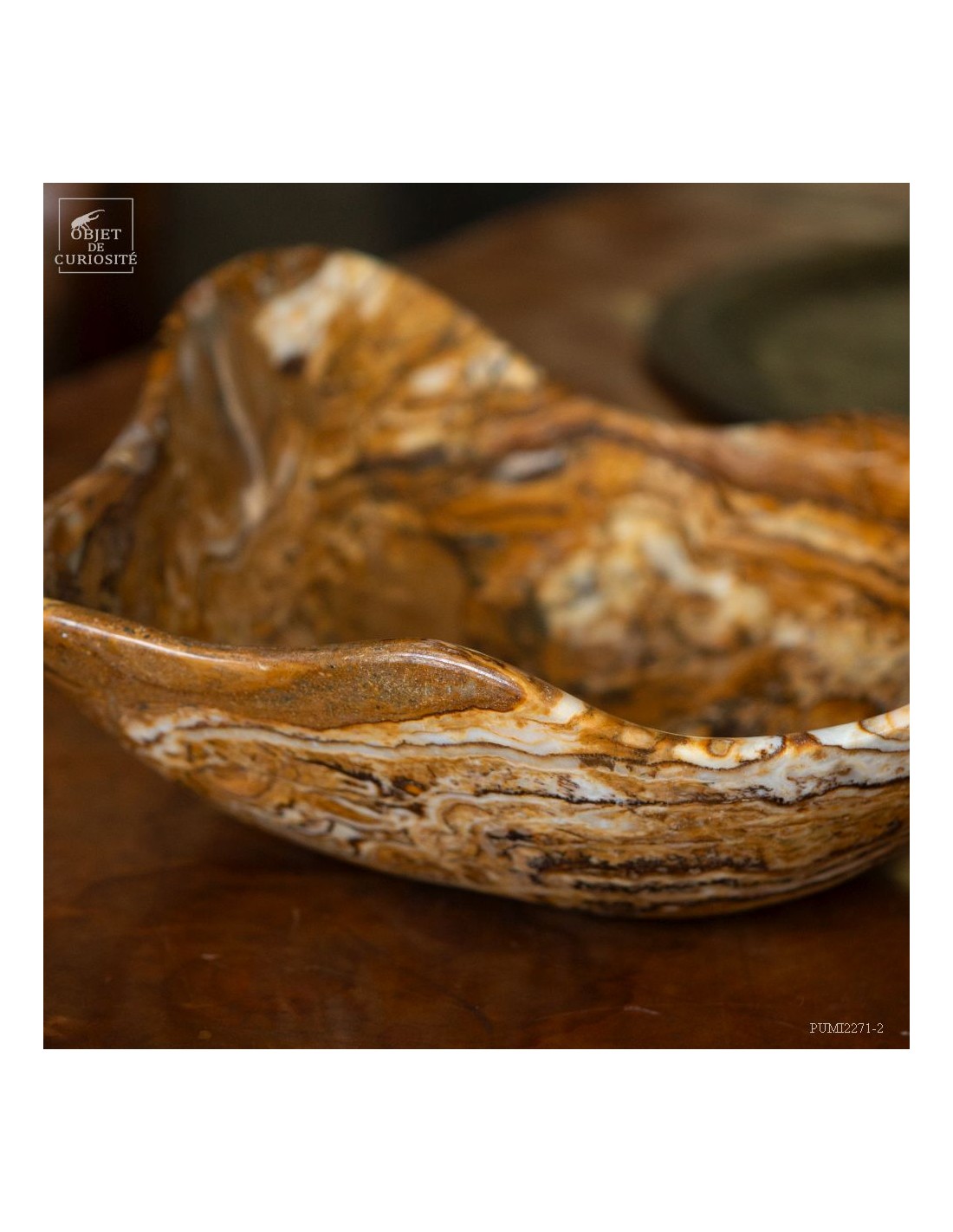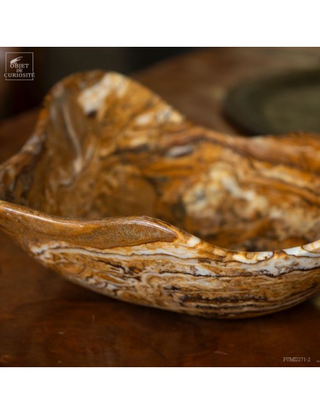 This free-form dish has a beautiful amber color. It comes from Morocco and is in Aragonite. At least we discovered it under that name in 2022. It is a variety of banded Calcite that takes exactly the colors of the famous Moroccan Aragonite which, iusually takes the shape iof tabular crystals that grow in all directions. A Moroccan craftsman from Sefrou was inspired by forms carved by Mexicans in Fluorite.