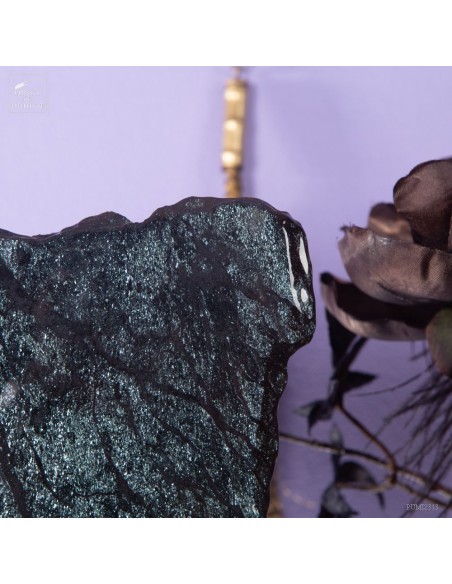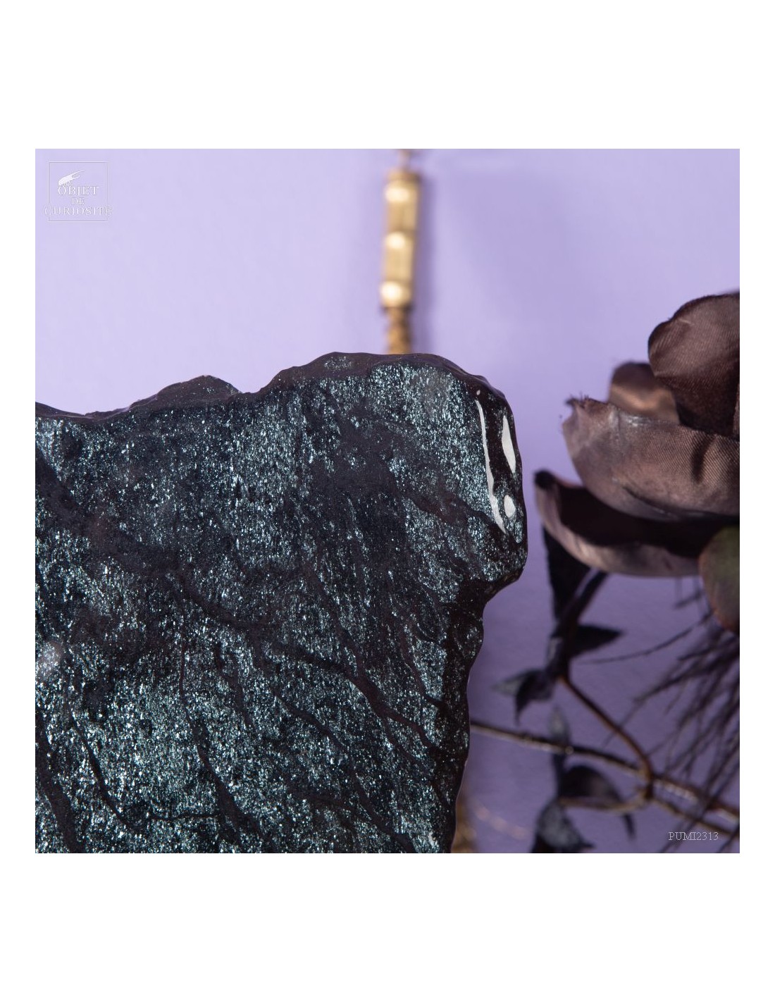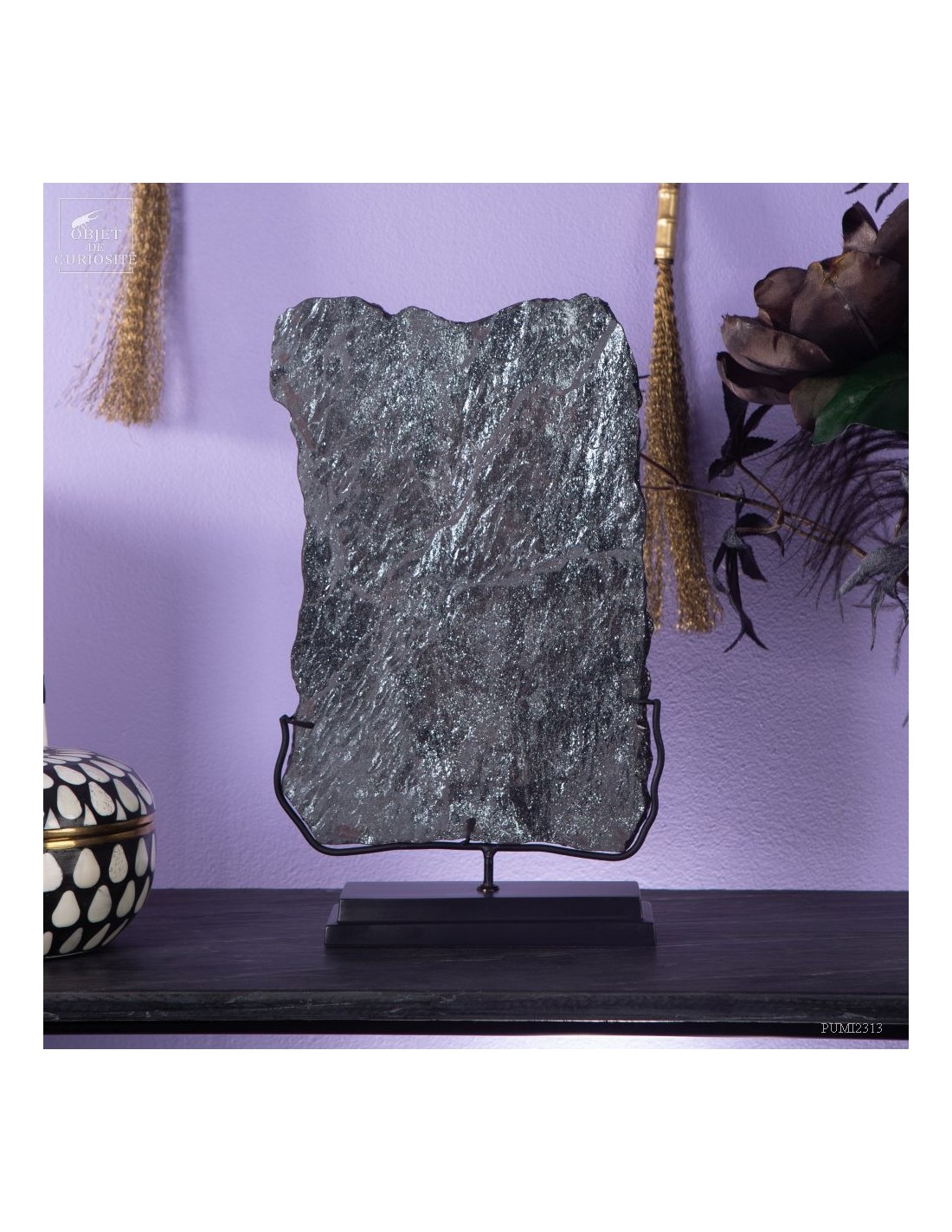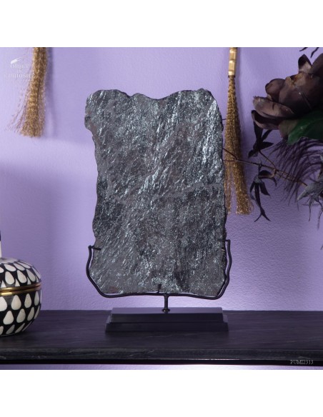 Specular hematite, sometimes called "Specularite" is a highly reflective, "glittery" form that consists of many small flakes of hematite. You could pretend it is the favourite stone of Unicorns...It formed in thin, stacked sheets resembling mica. It can actually be classified as hematite schists. This piece comes from the Republic mine in Michigan - US. It has been varnished to impress you, but even the back that remain natural will astonish you.