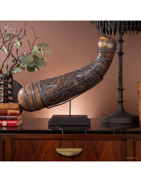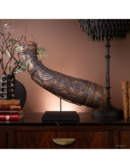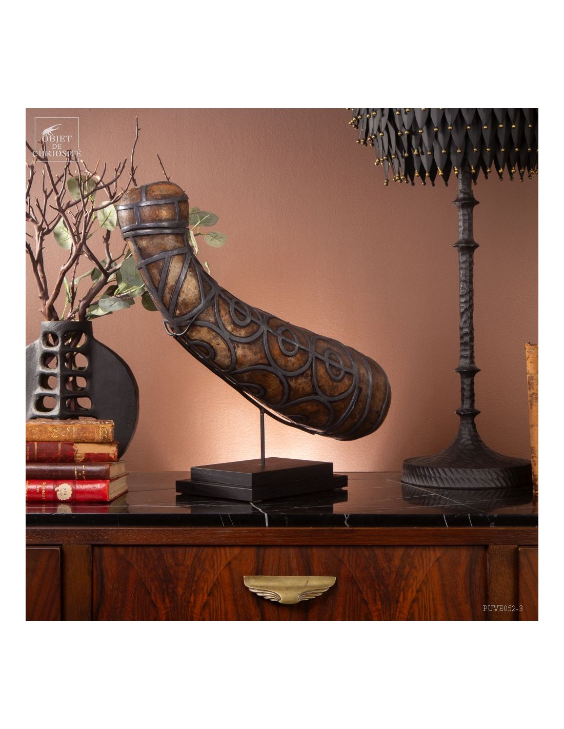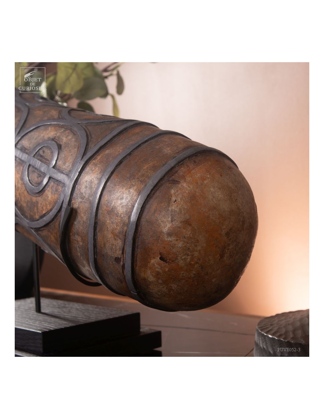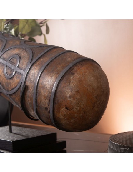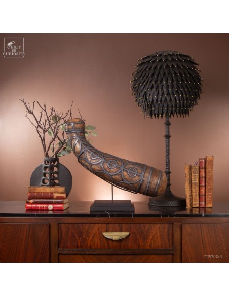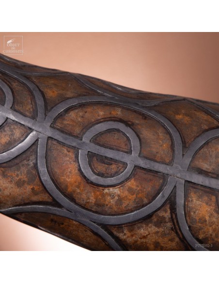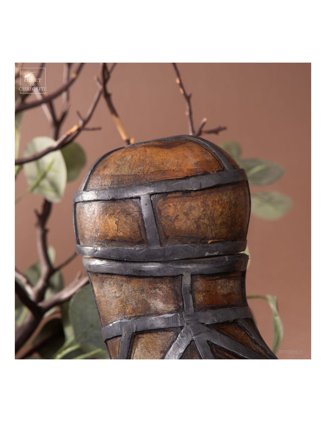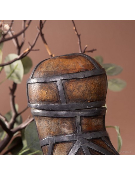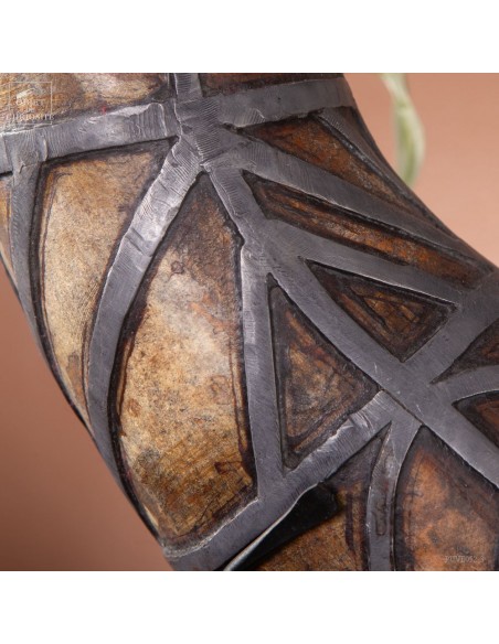 This calabash is decorated with tin according to the traditional art of Berber culture. This object had a double function: it served to contain and preserve liquids such as water or oil, while also being an ornamental artistic piece that expressed the aesthetics and cultural values of Berber society. Dried calabash had the particularity of being light, solid and waterproof, thus making containers adapted to the movements of these nomadic populations. But a calabash decorated with tin is our little intervention..