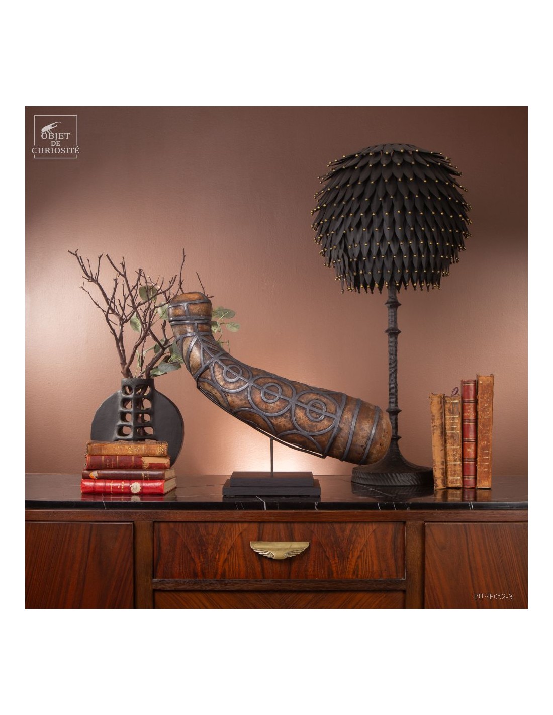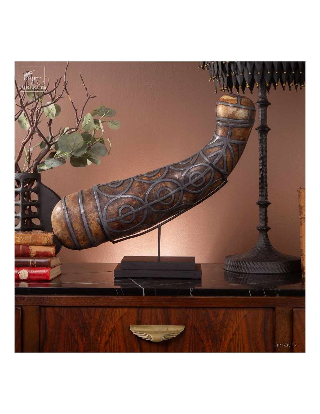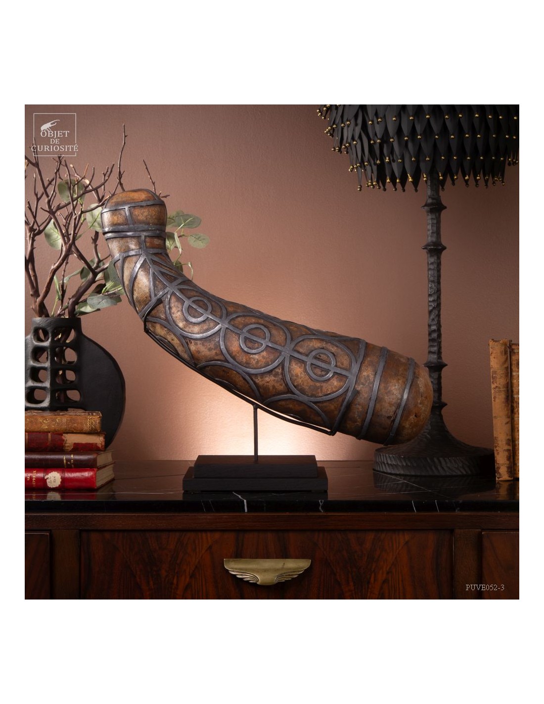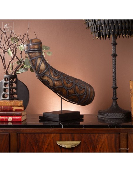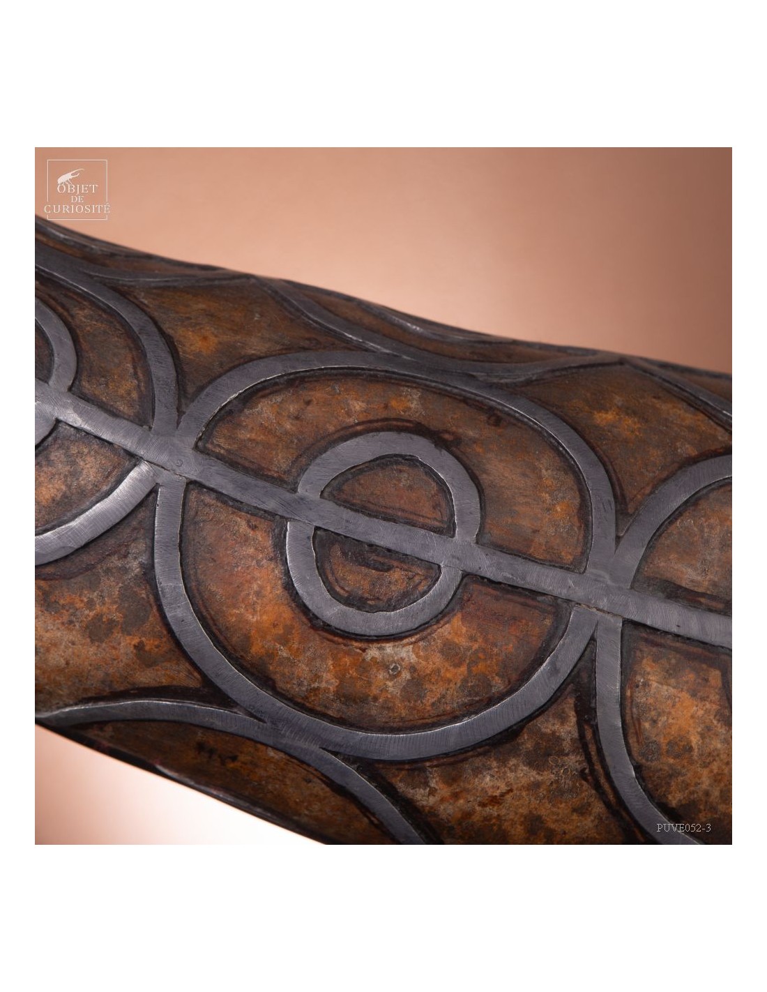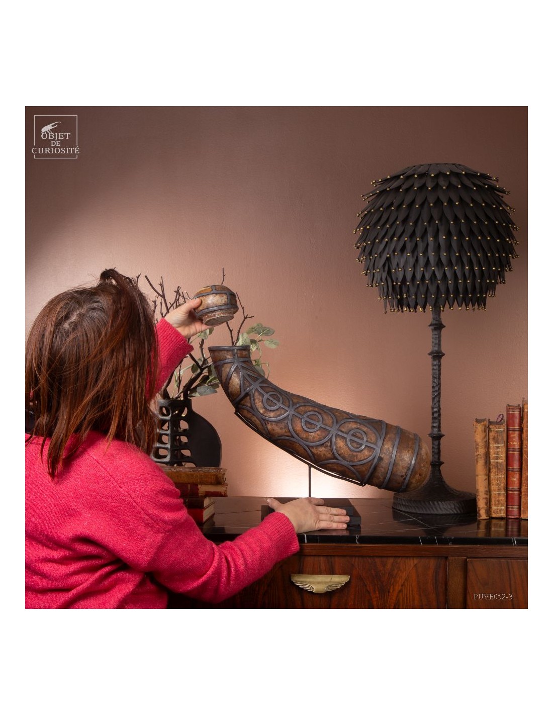 This calabash is decorated with tin according to the traditional art of Berber culture. This object had a double function: it served to contain and preserve liquids such as water or oil, while also being an ornamental artistic piece that expressed the aesthetics and cultural values of Berber society. Dried calabash had the particularity of being light, solid and waterproof, thus making containers adapted to the movements of these nomadic populations. But a calabash decorated with tin is our little intervention..