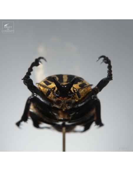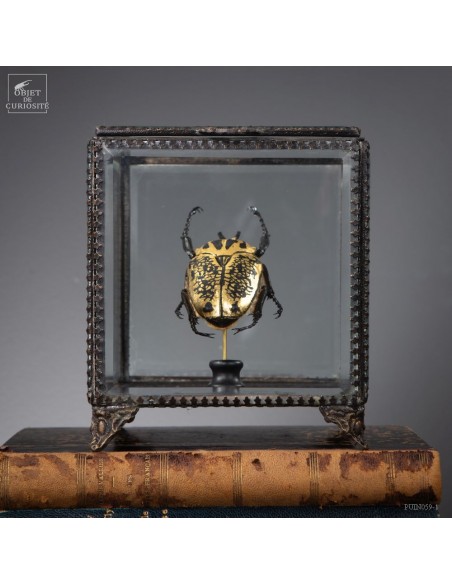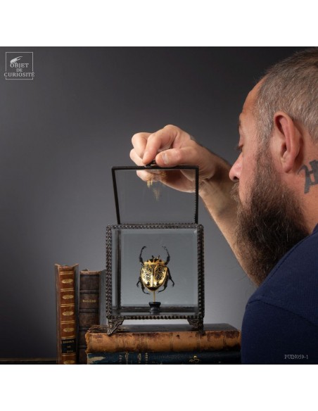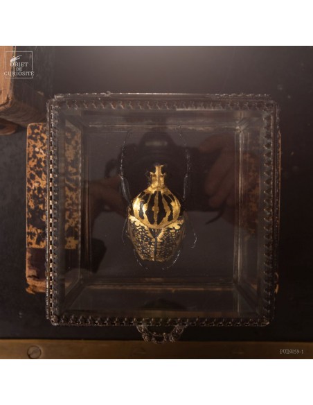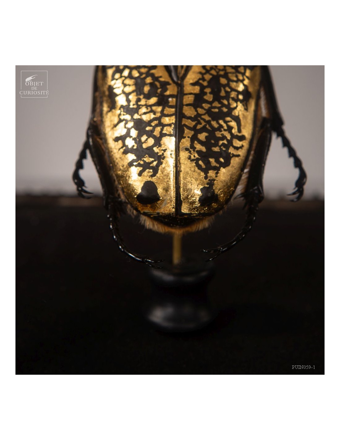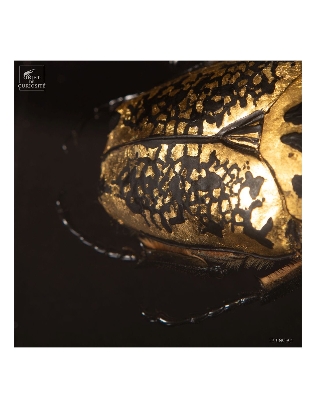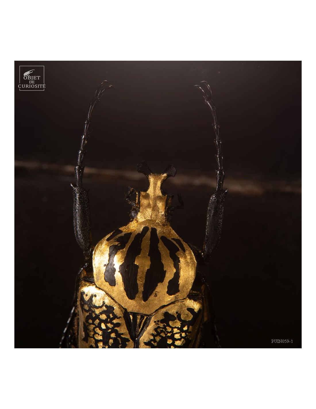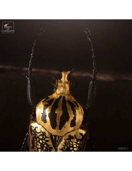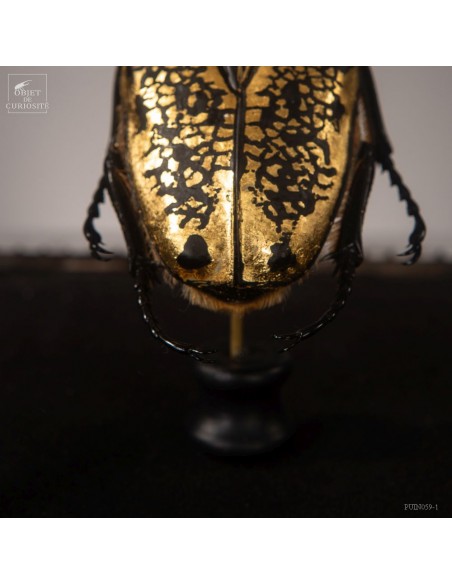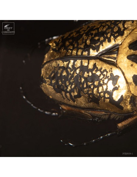 Real Goliathus Orientalis from Congo, the heaviest species of beetles of the world! But with a special treatment: 24K gold leaf applied on the clear parts of its exoskeleton (elytra). The result is a precious natural beetle from Africa , with a little luxury touch made in France...