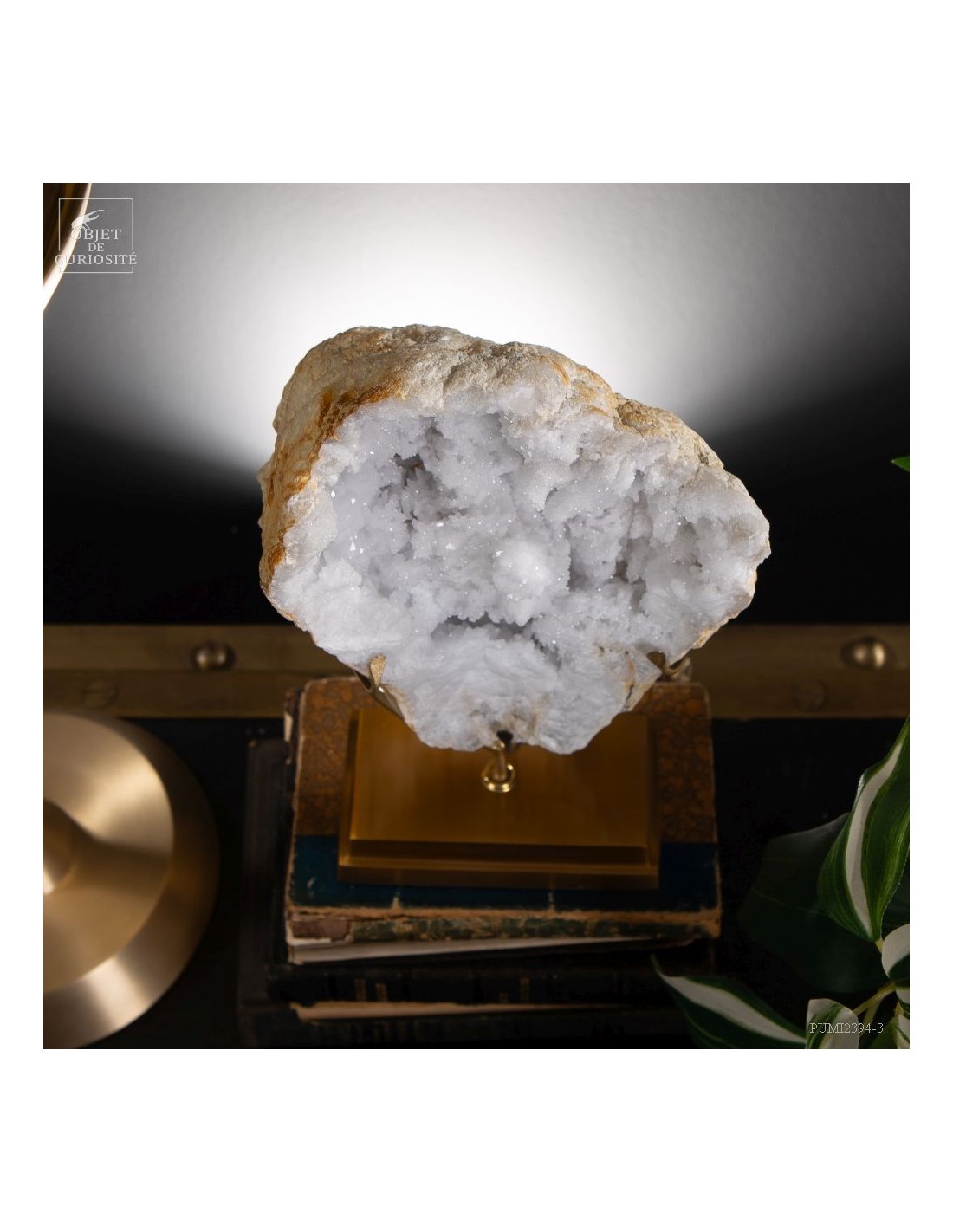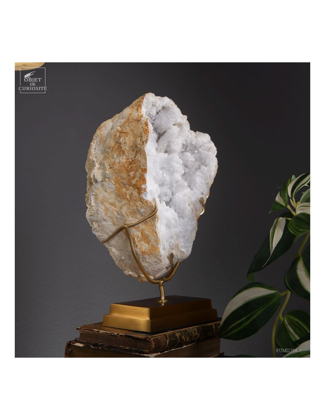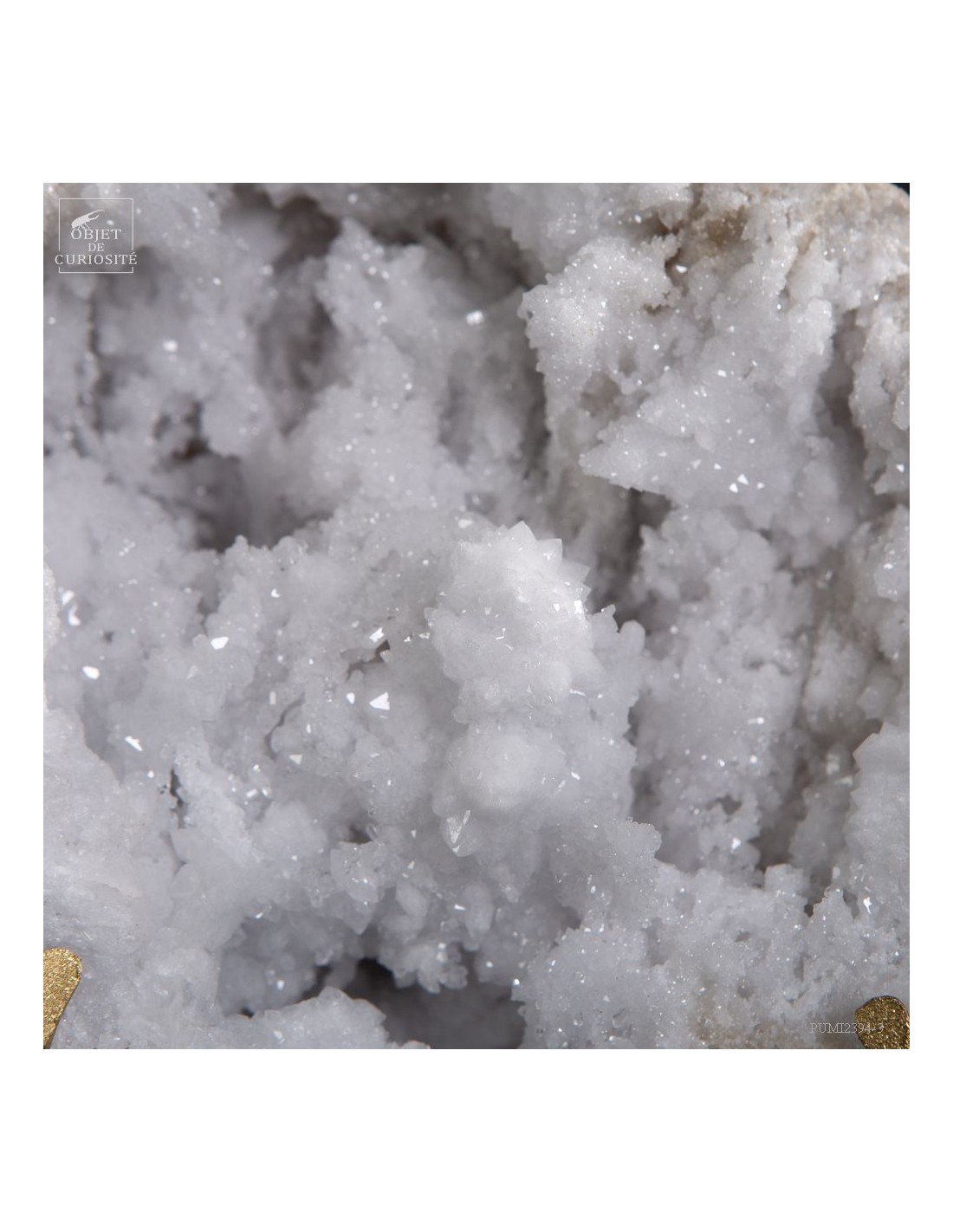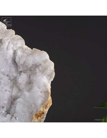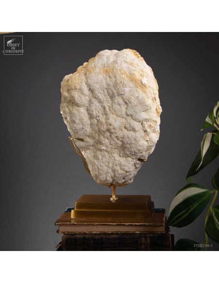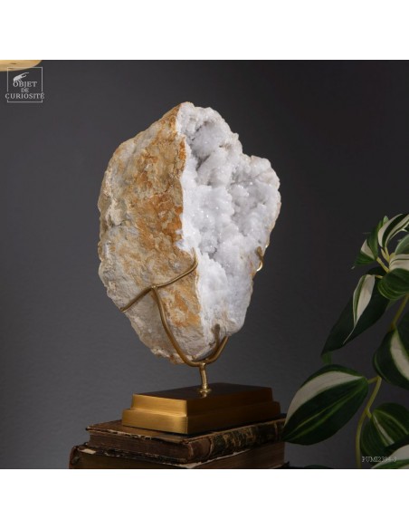 This mineral is a white quartz geode from the extreme south of Morocco - near Laâyoune - and which looks like a simple ball of natural stone, but inside reveals a geode full of sparkling natural crystals. A striking contrast with the very simple exterior of this mineral. In the group photo, it’s on the top right, in the hands of Lilau.