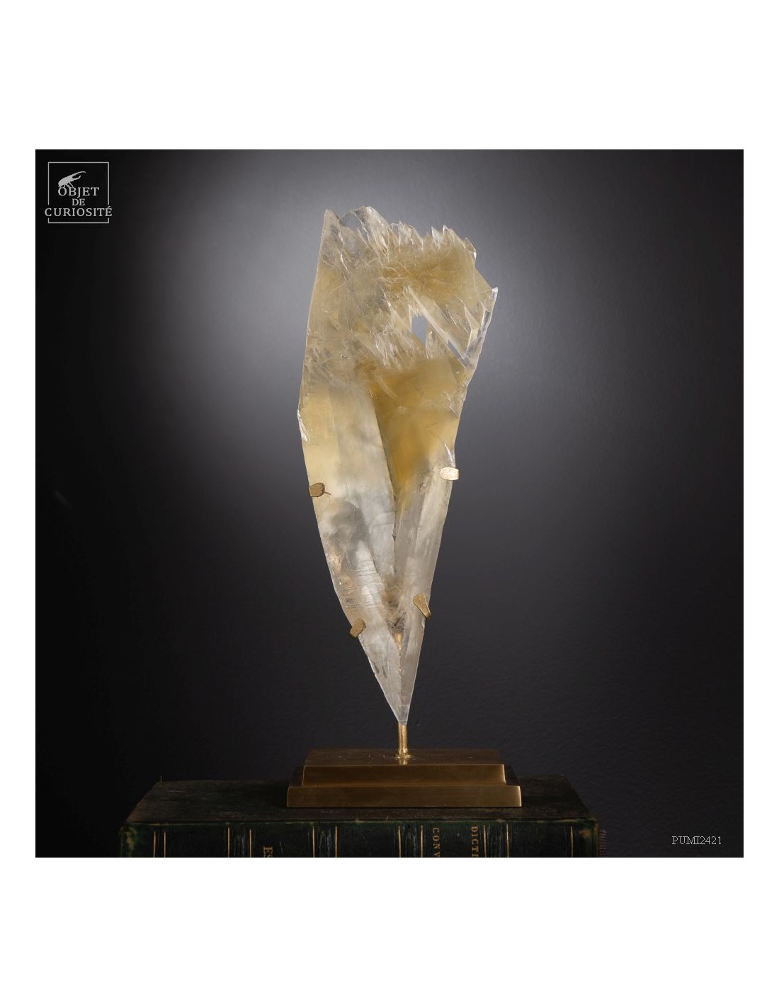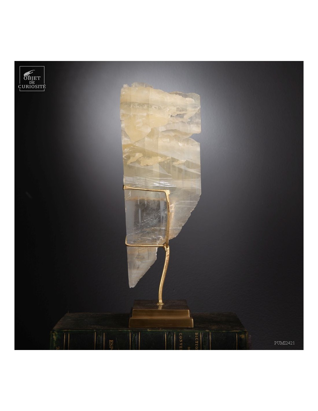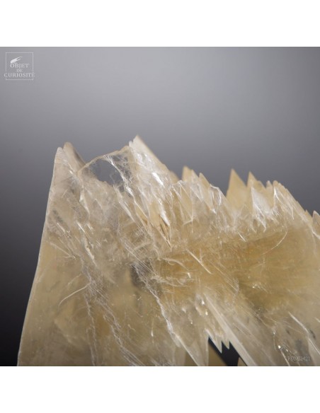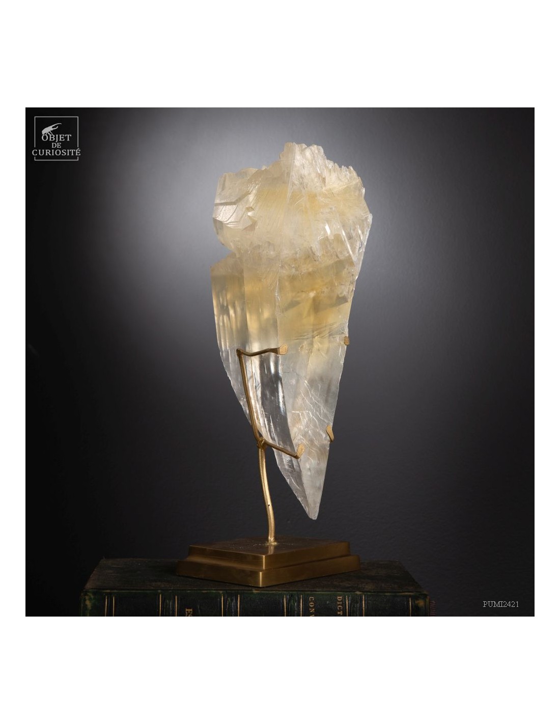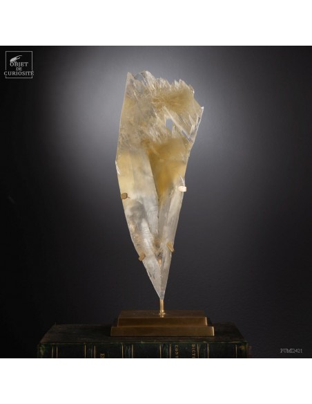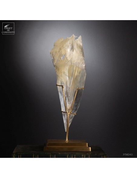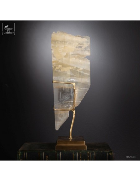 This full crystal of Gypsum is French, and comes from the village with the evocative name of Caresse in the southwest. The great transparency of this impressive crystal is the signature of the most beautiful pieces found in this mine. And despite its 12cm thick, a small central part very transparent allows to see very clearly the other side. On brass base; That's the one far left on the group picture.