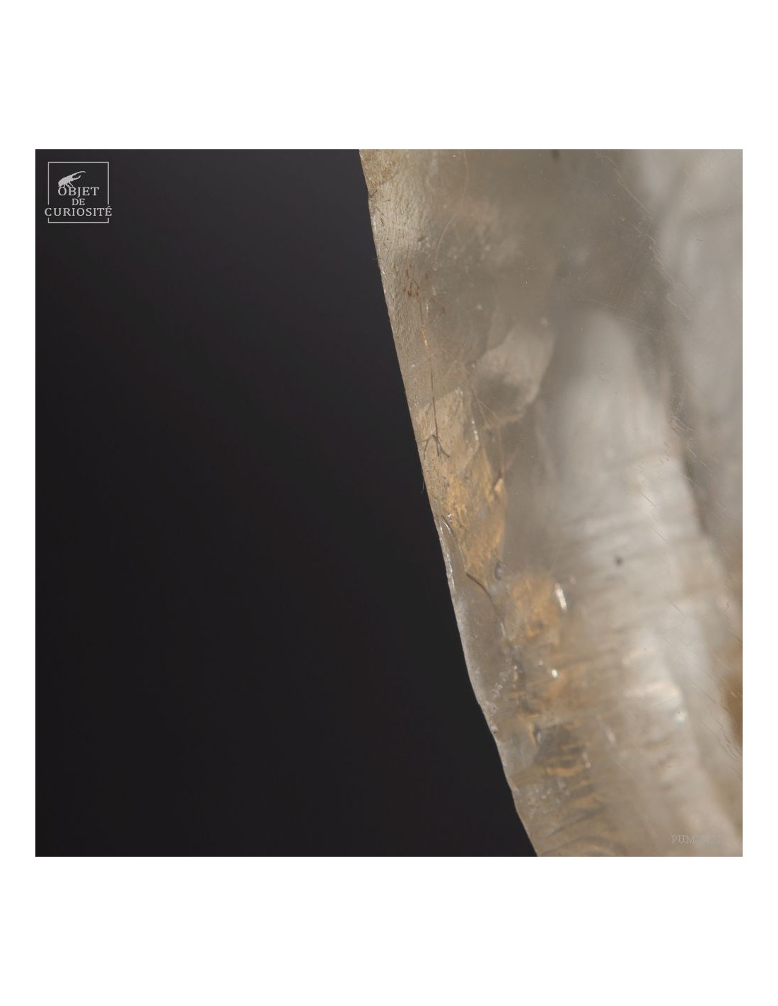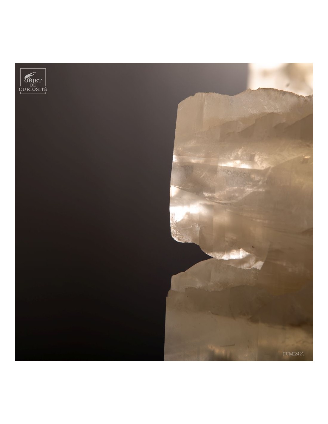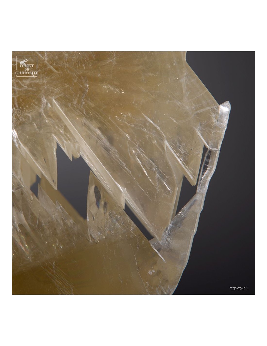 This full crystal of Gypsum is French, and comes from the village with the evocative name of Caresse in the southwest. The great transparency of this impressive crystal is the signature of the most beautiful pieces found in this mine. And despite its 12cm thick, a small central part very transparent allows to see very clearly the other side. On brass base; That's the one far left on the group picture.