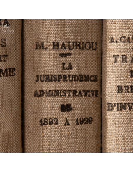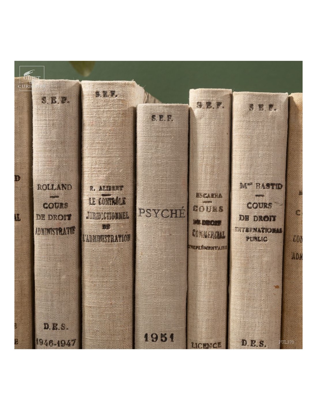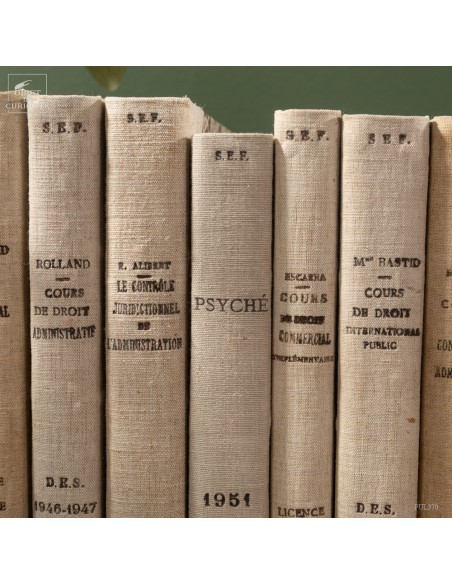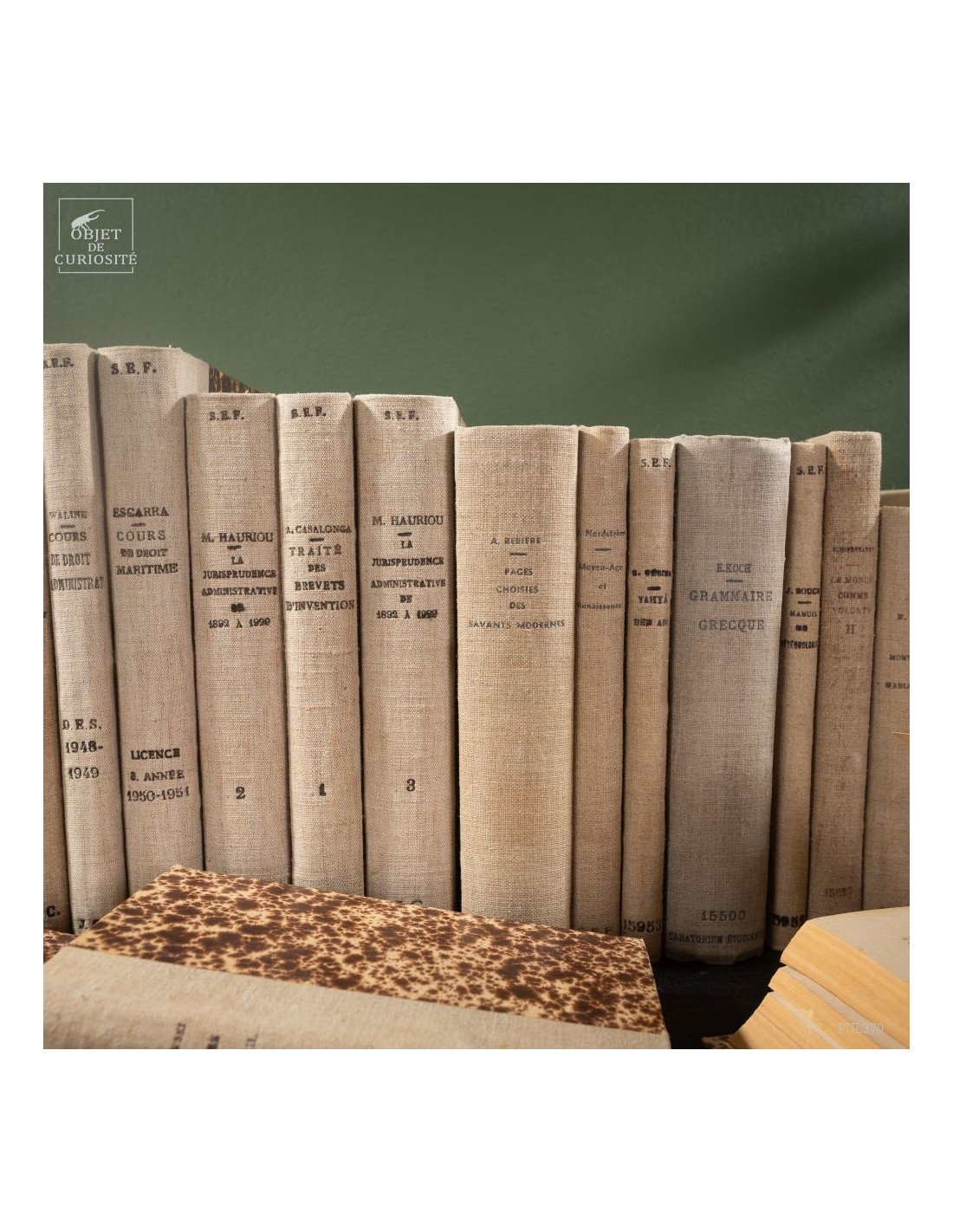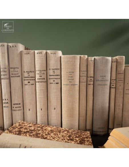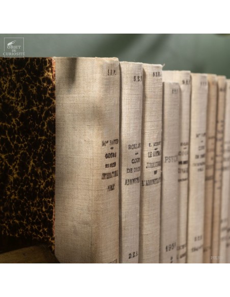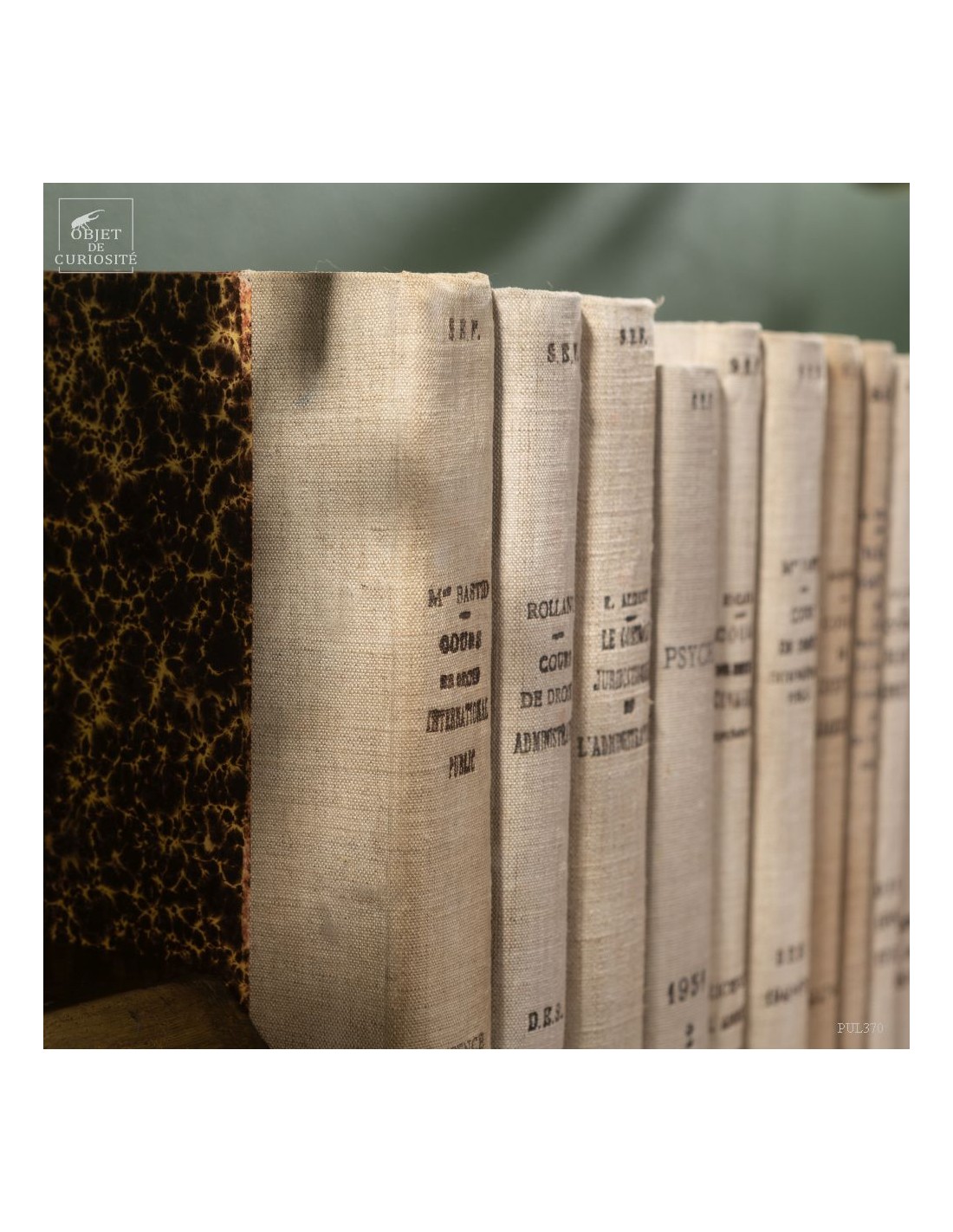 Covering the books with this beige canvas was the signature of the library of a sanatorium for students in the 1930s. This library was originally made up of donations from the Sorbonne University in Paris (some books bear the seal of the Ministry of the Interior stipulating a donation by the government in 1936). A library composed of novels but also legal works. 30 volumes.