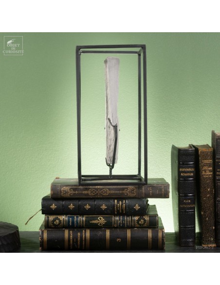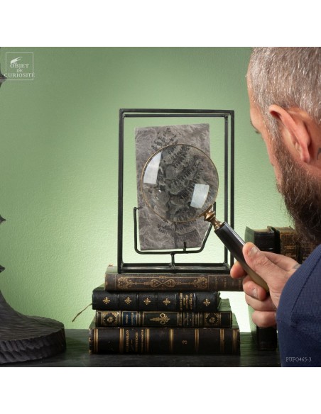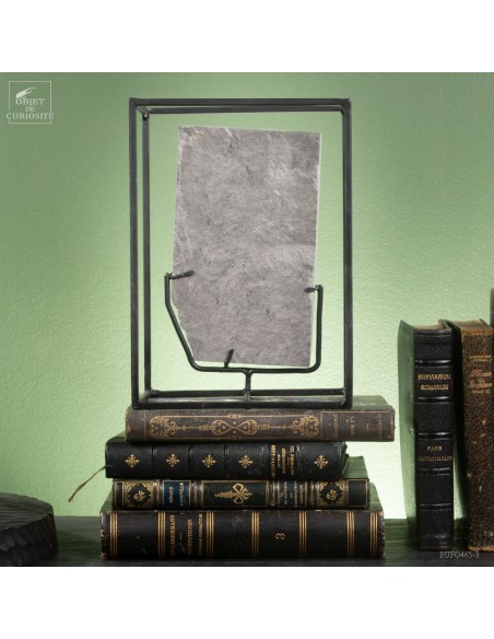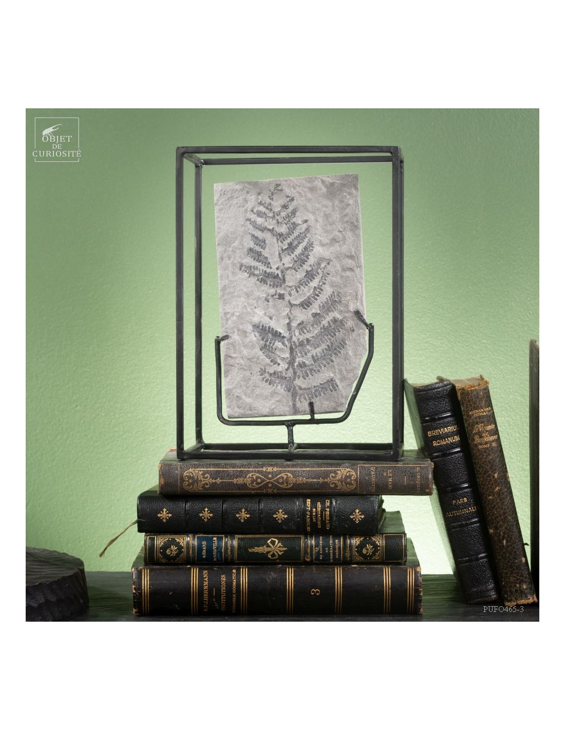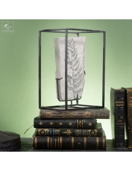 This fossil PECOPTERIS FEMINAEFORMIS, dating back to the Carboniferous about 300 million years ago, was discovered in the mines of Montceau-les-Mines, France. These mines, formerly dedicated to coal mining, have preserved exceptional remains of ancient flora due to favorable geological conditions. PECOPTERIS FEMINAEFORMIS belongs to a genus of ferns characteristic of this period, highlighting the abundance of plant life in swampy environments. Interesting contrast between the past of plant life and the modernity of its display in a rectangular wire cage. Part of a collection of the 70s, identified at that time.