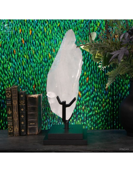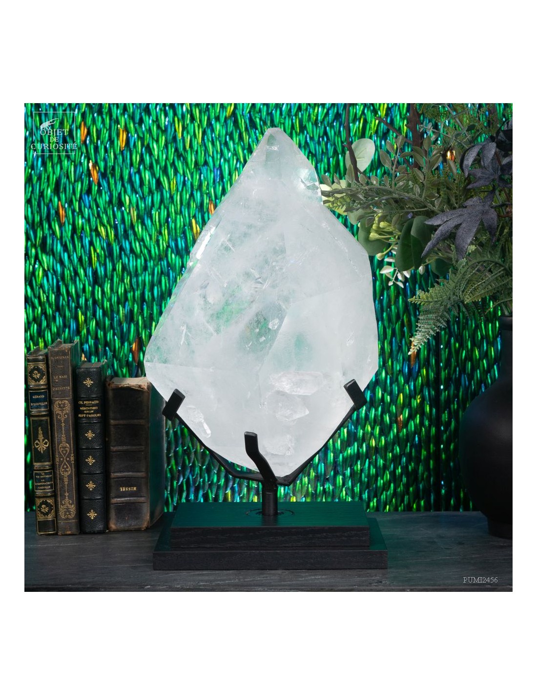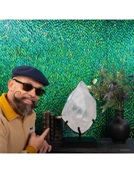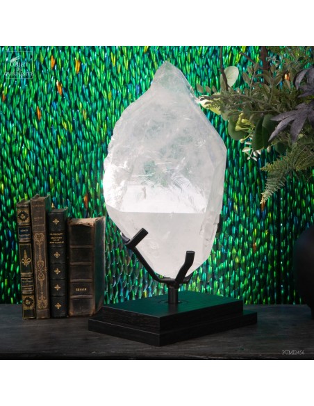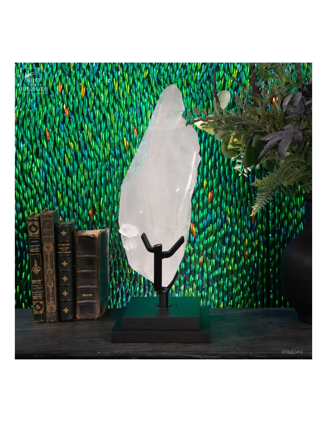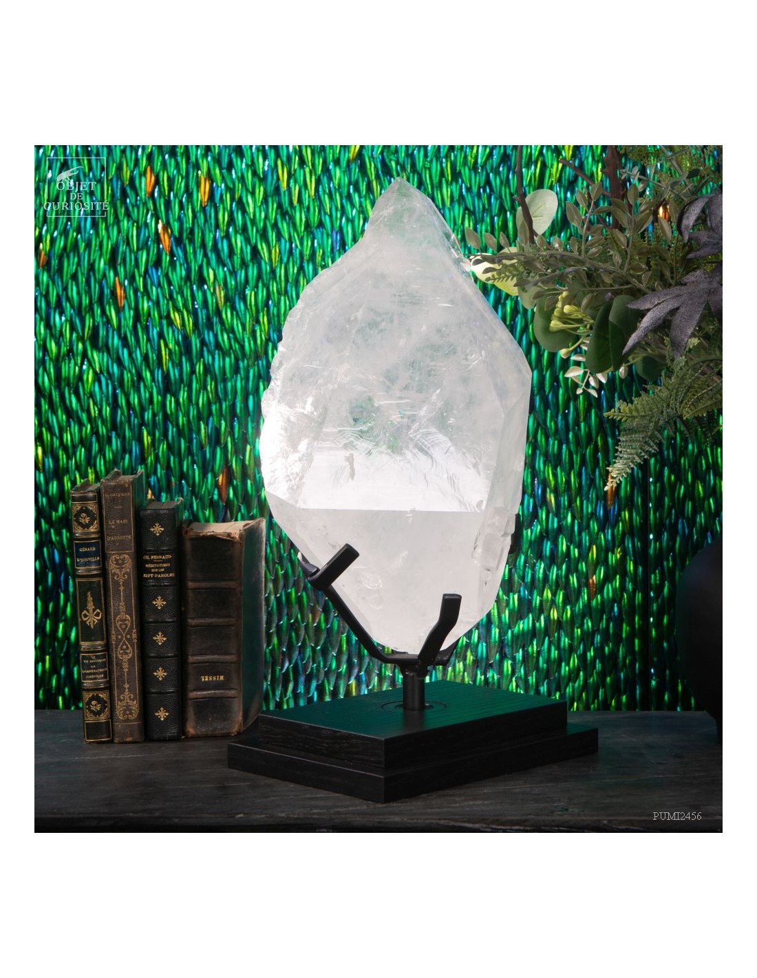 This large crystal is a Jacaré, which means "crocodile" in Brazilian. Because one of the two sides of this big bi-terminated crystal is made of many small crystals attached to the big crystal, with a flatter face. The rotating base inserted in the black oak base makes it possible to observe the two sides of this crystal. This imposing 40cm high crystal is completely natural, yet so bright. It is a floating crystal, which was in a softer matrix, from which it was removed. Came from Minas Gerais area in Brazil in 2023..