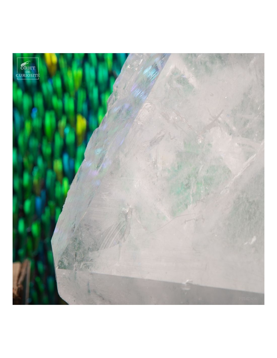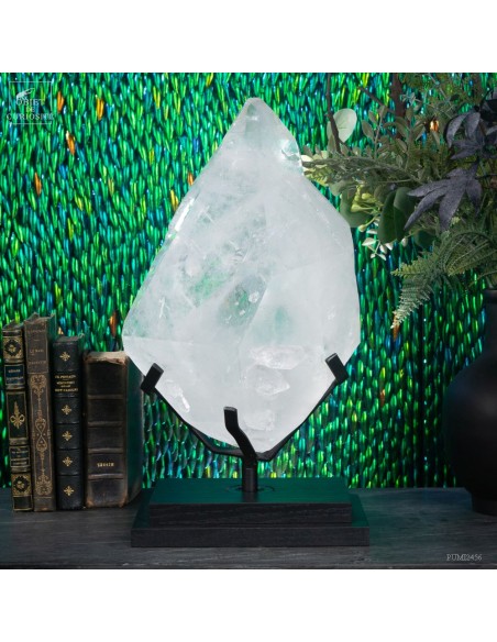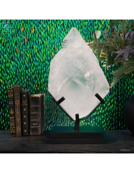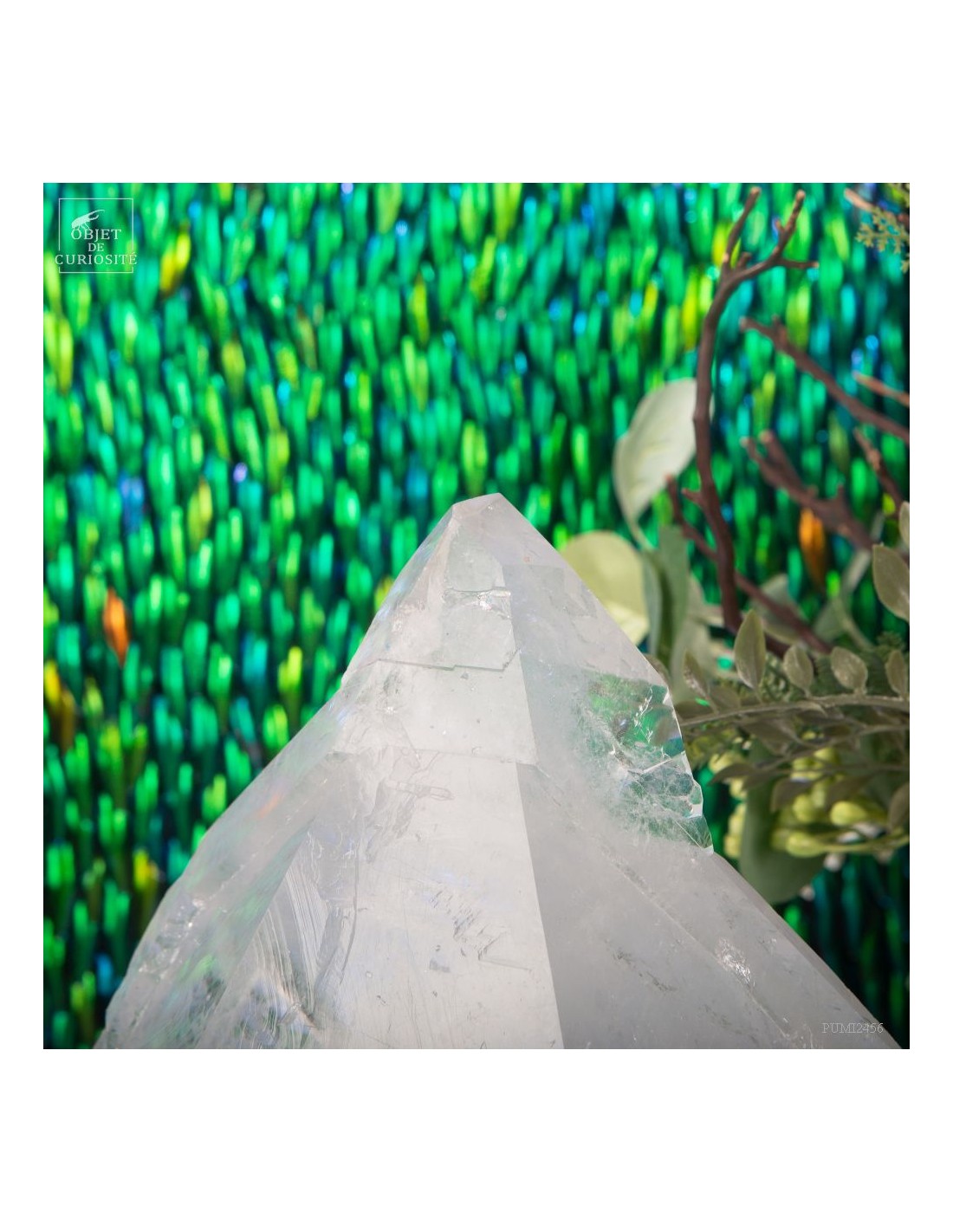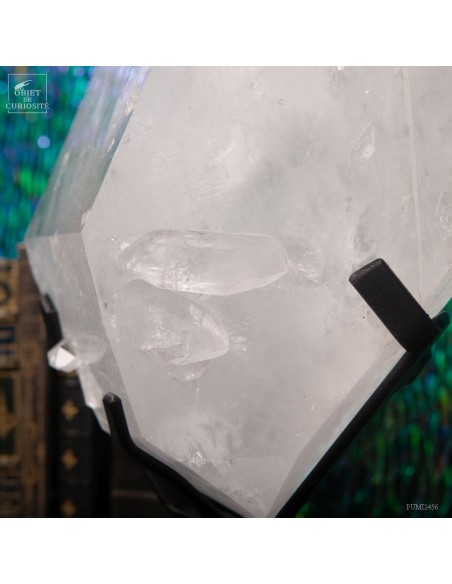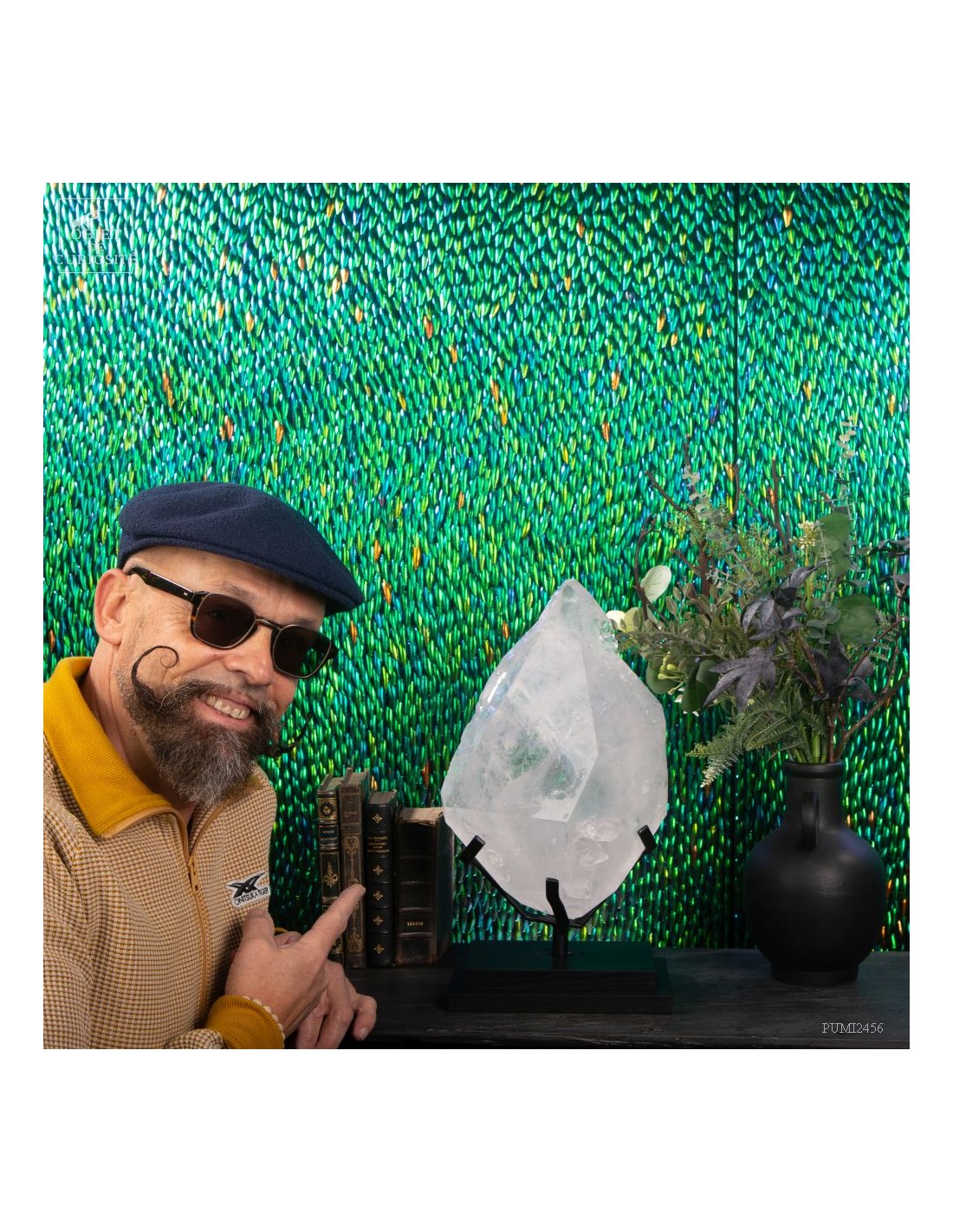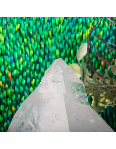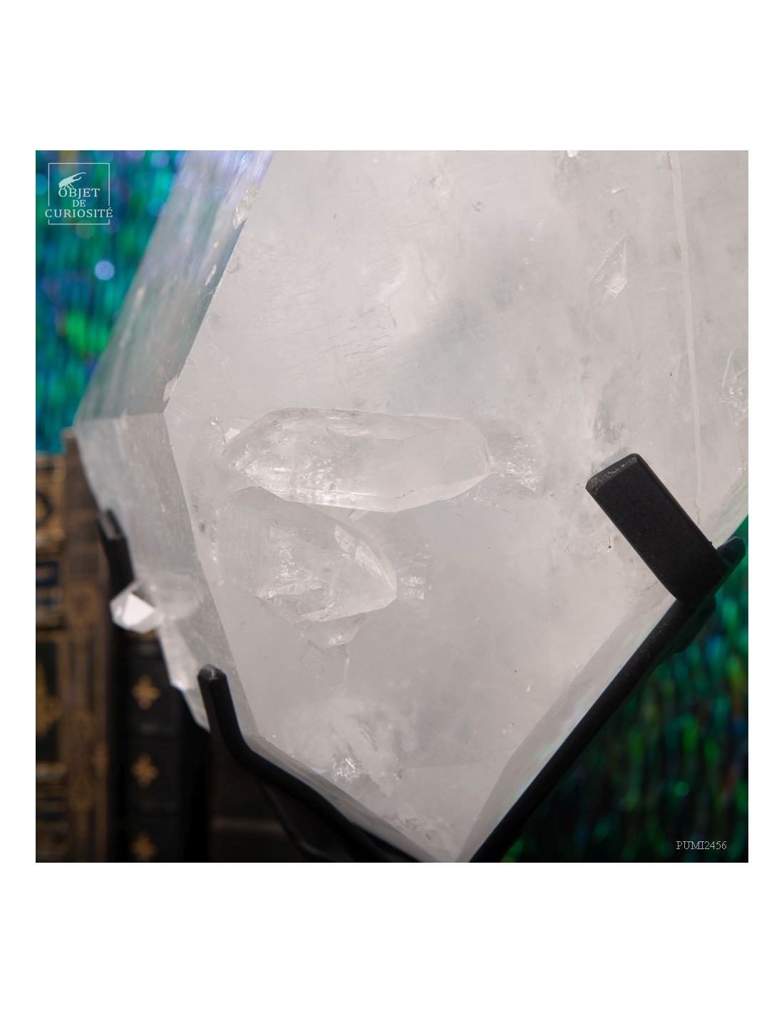 This large crystal is a Jacaré, which means "crocodile" in Brazilian. Because one of the two sides of this big bi-terminated crystal is made of many small crystals attached to the big crystal, with a flatter face. The rotating base inserted in the black oak base makes it possible to observe the two sides of this crystal. This imposing 40cm high crystal is completely natural, yet so bright. It is a floating crystal, which was in a softer matrix, from which it was removed. Came from Minas Gerais area in Brazil in 2023..