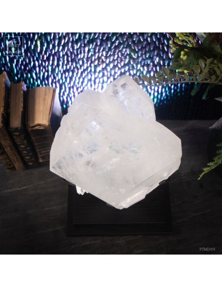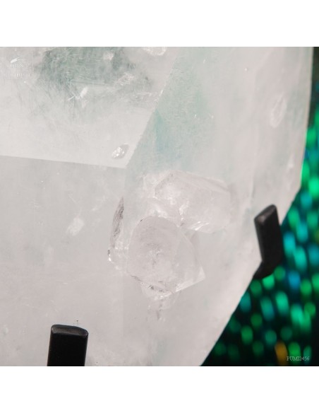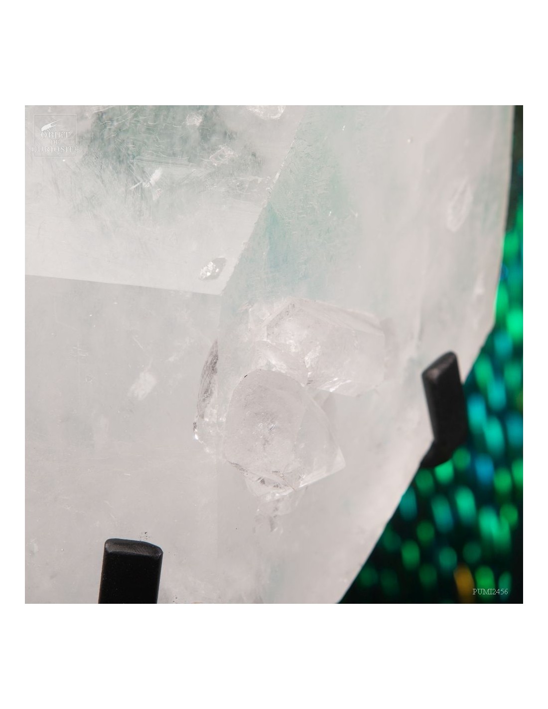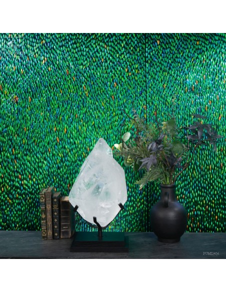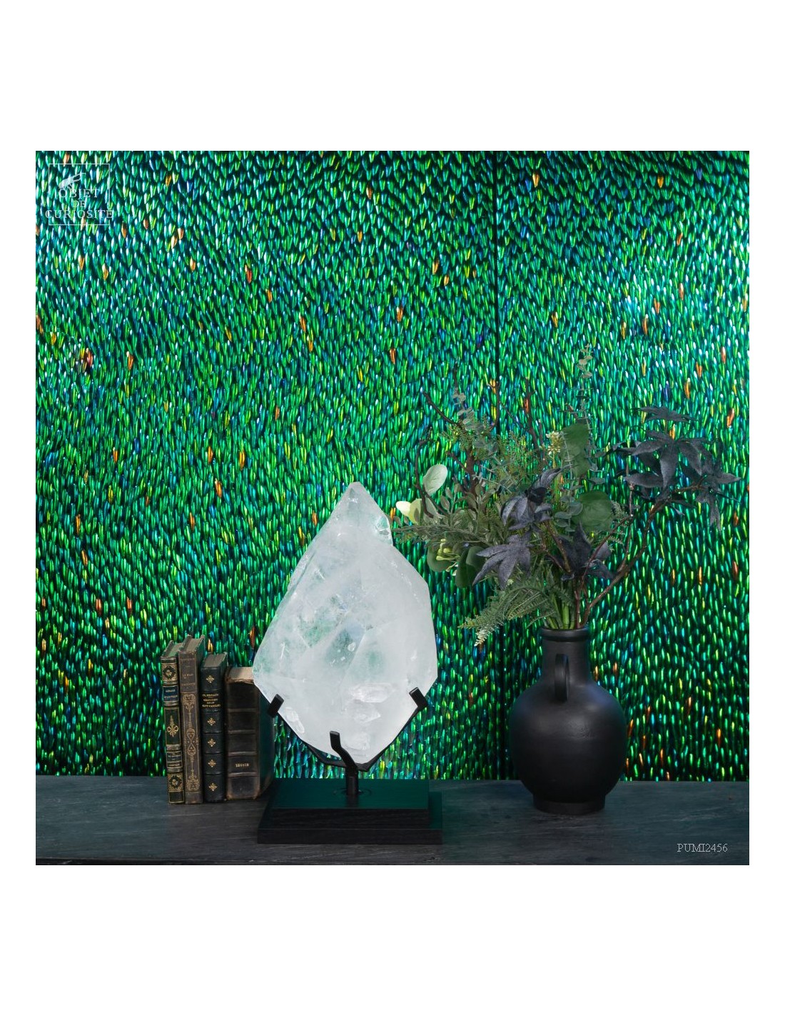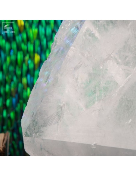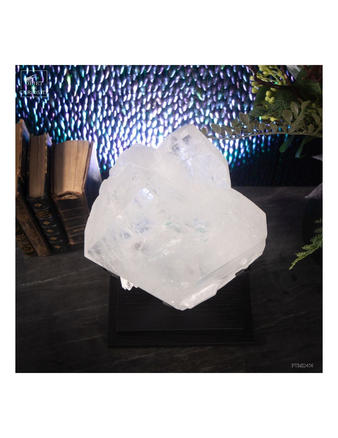 This large crystal is a Jacaré, which means "crocodile" in Brazilian. Because one of the two sides of this big bi-terminated crystal is made of many small crystals attached to the big crystal, with a flatter face. The rotating base inserted in the black oak base makes it possible to observe the two sides of this crystal. This imposing 40cm high crystal is completely natural, yet so bright. It is a floating crystal, which was in a softer matrix, from which it was removed. Came from Minas Gerais area in Brazil in 2023..