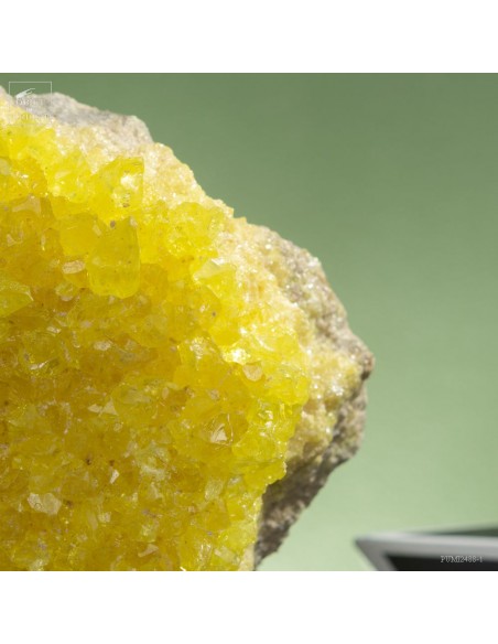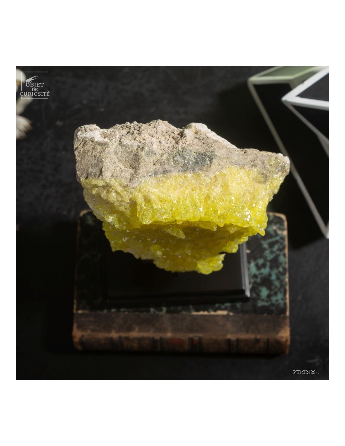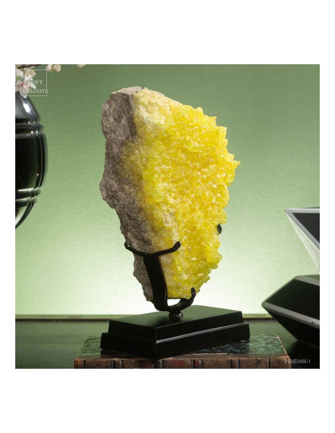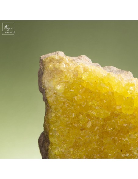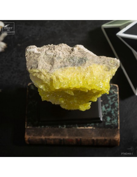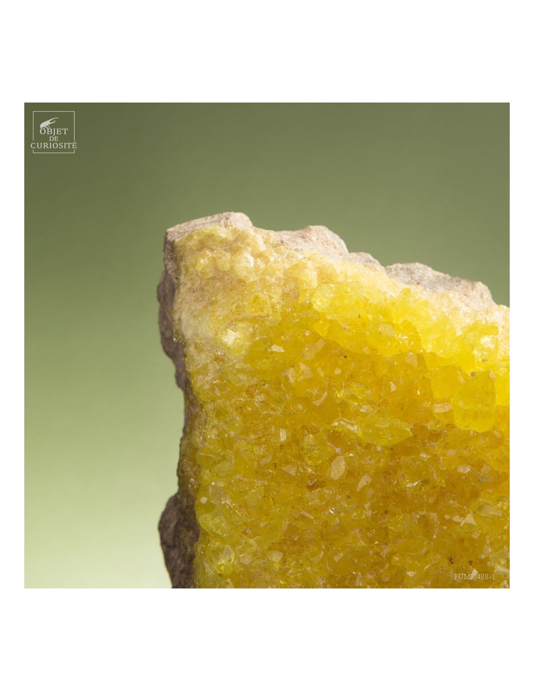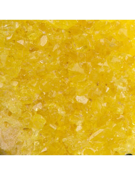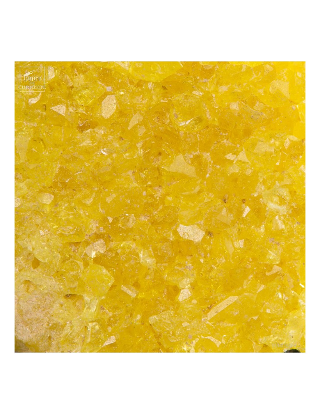 Crystallized native Sulphur from a mine near San Pablo de Napa in Bolivia. Before becoming matches, sulfur is a natural mineral! This cluster of bright yellow crystals is on its original matrix.