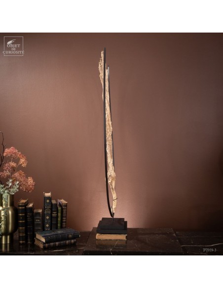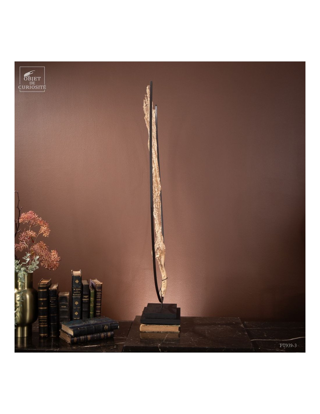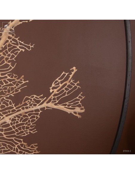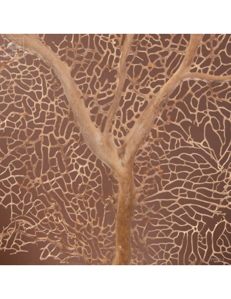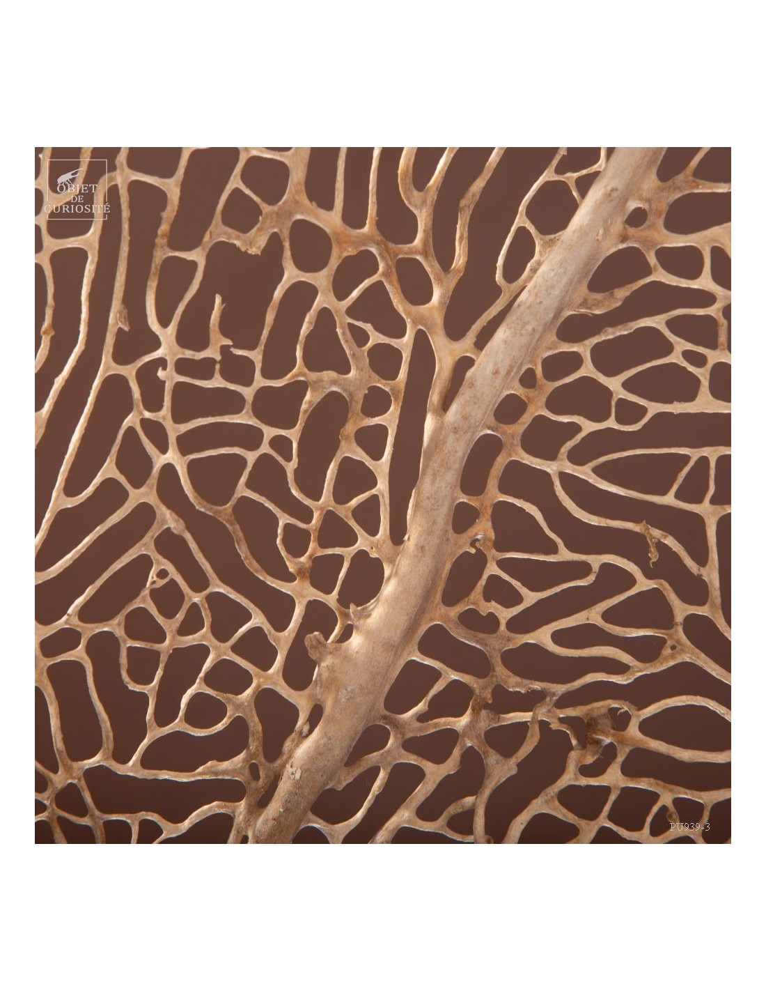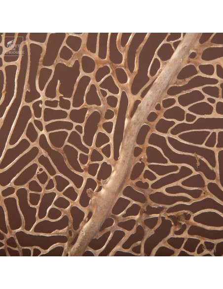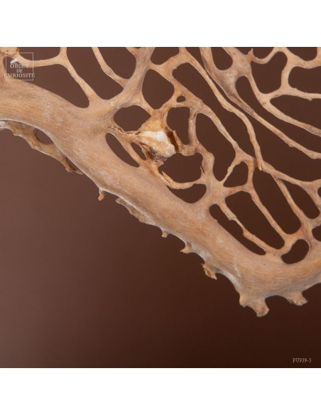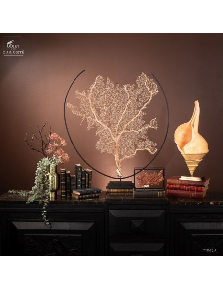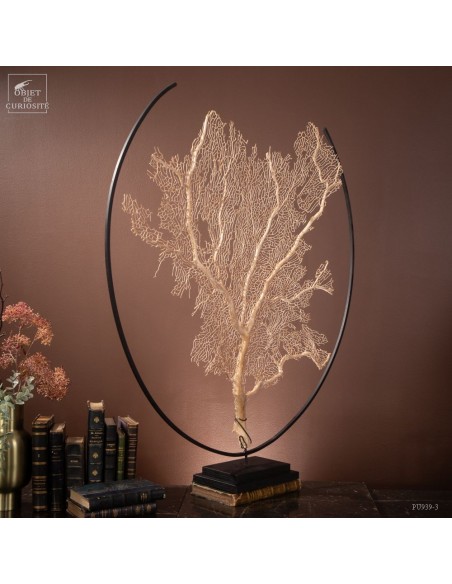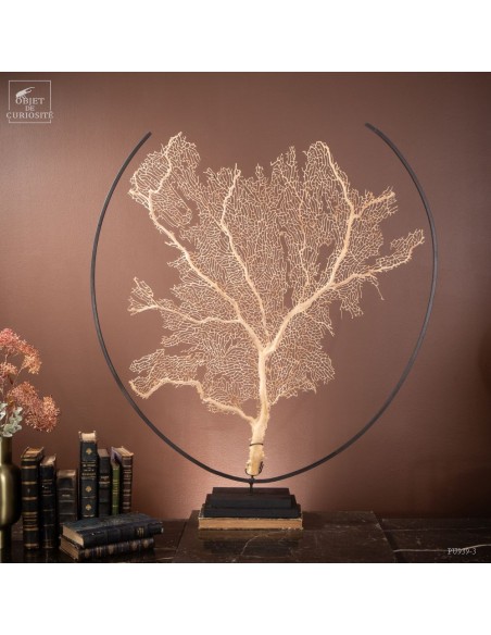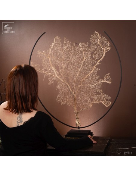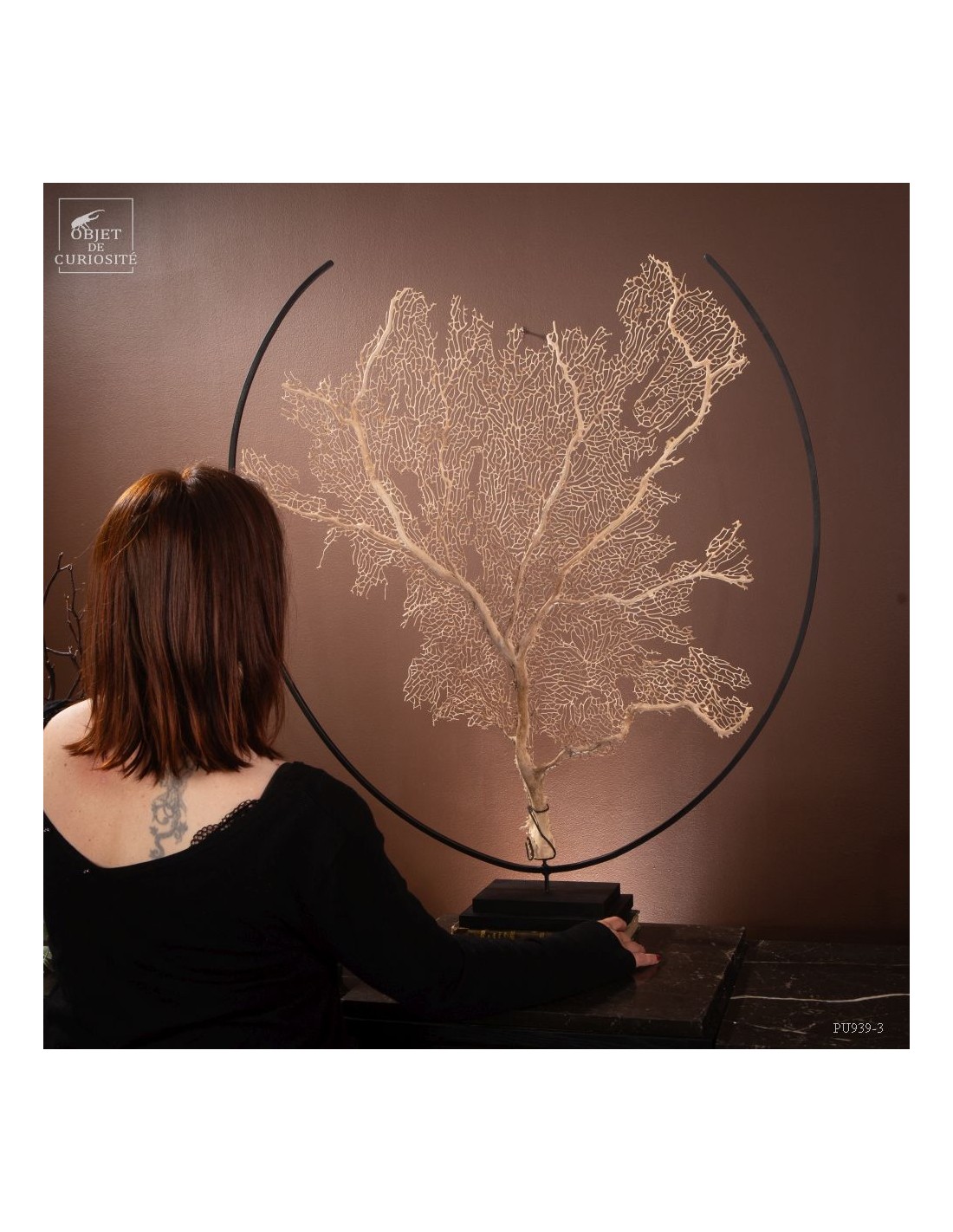 Off-white natural Gorgonia on a black oak base with metal circle. This beige skeleton look like lace. No wonder why they are called sea-fan: when they reach that size, they look like a screen. They can be a great divider in a room, on a console and we also have a natural black species than can reach the same size, also from Micronesia.
