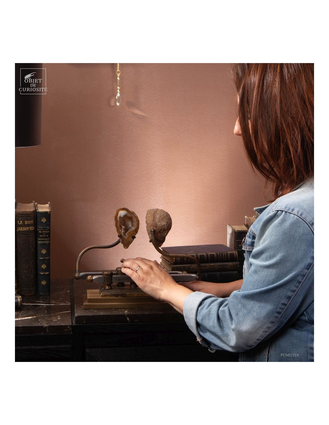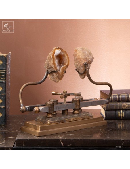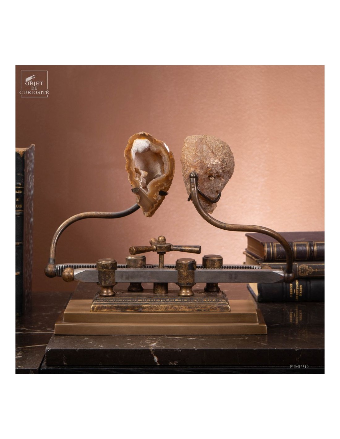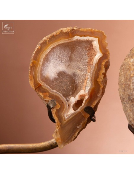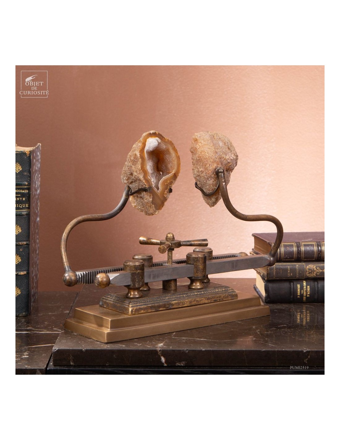 This agate geode comes from Brazil It is sawn in 2 and mounted on a rack mechanism with a brass base. By turning this brass wheel, you can "open" this stone and discover the inside of the geode: you will perfectly see the golden agate border,and the whole interior which is entirely crystallized.