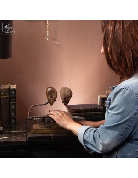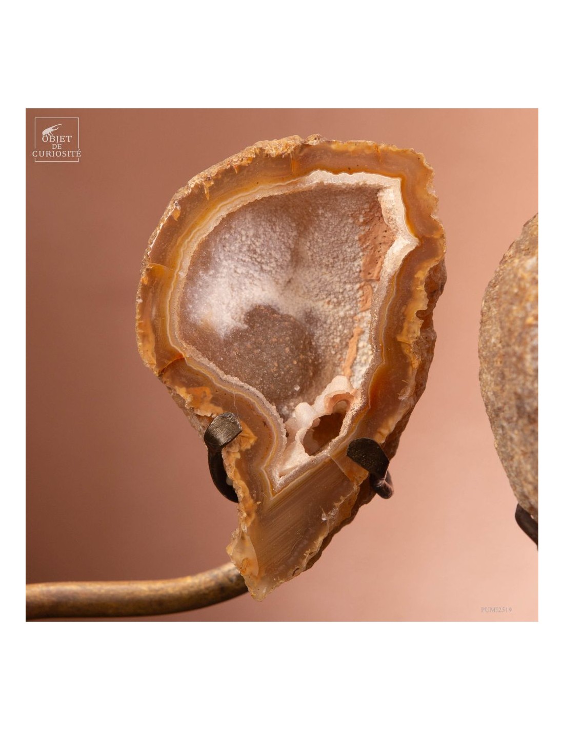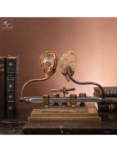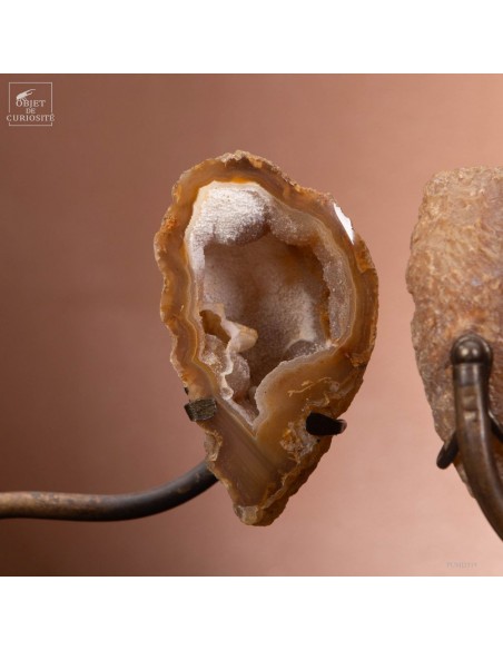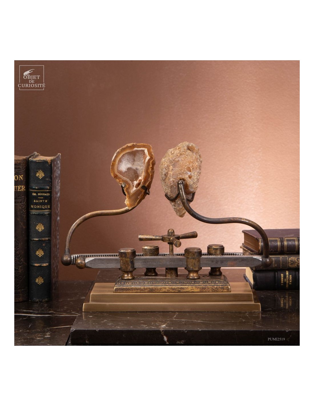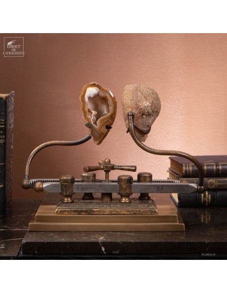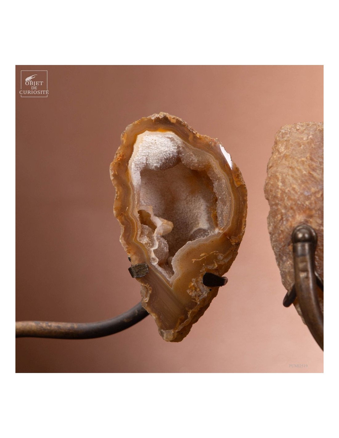 This agate geode comes from Brazil It is sawn in 2 and mounted on a rack mechanism with a brass base. By turning this brass wheel, you can "open" this stone and discover the inside of the geode: you will perfectly see the golden agate border,and the whole interior which is entirely crystallized.