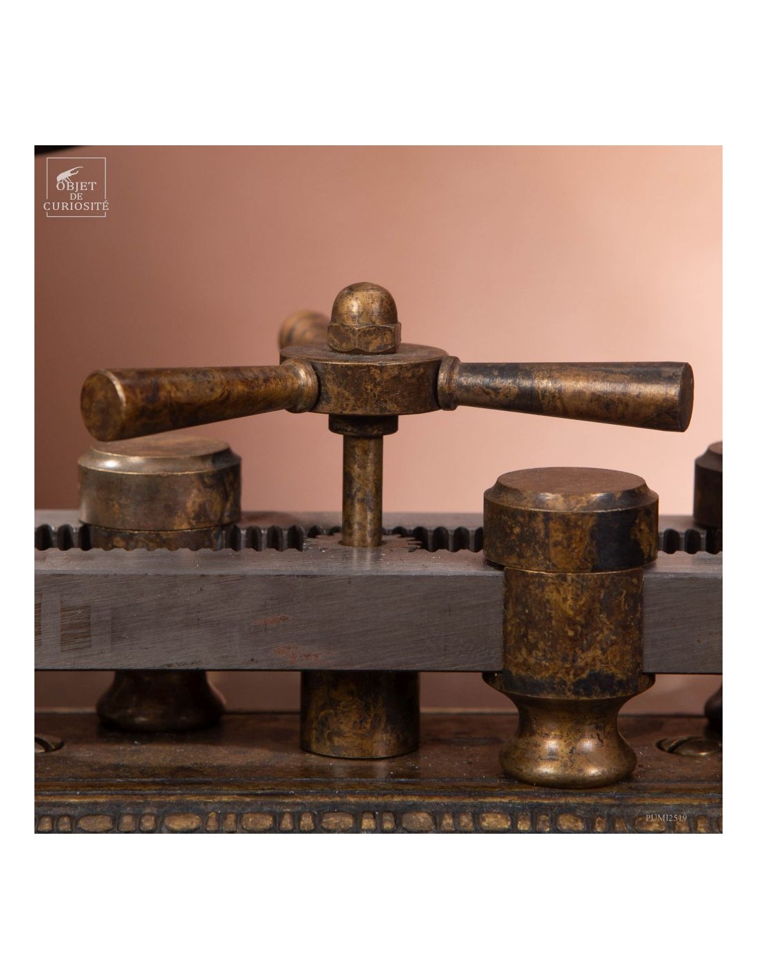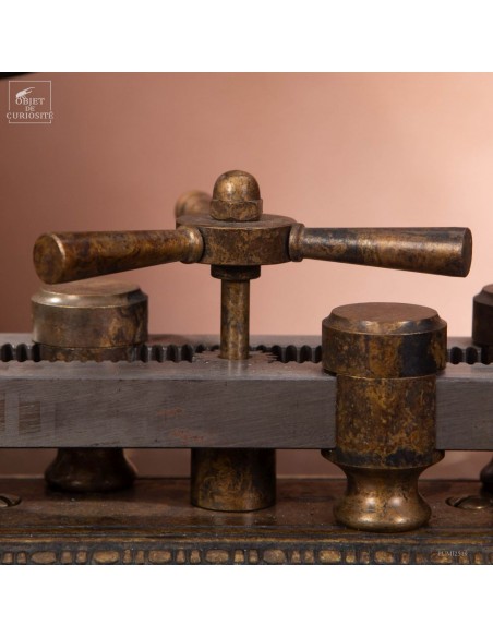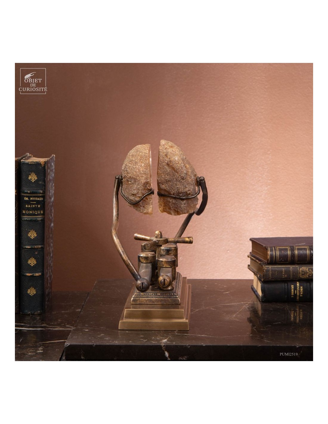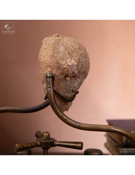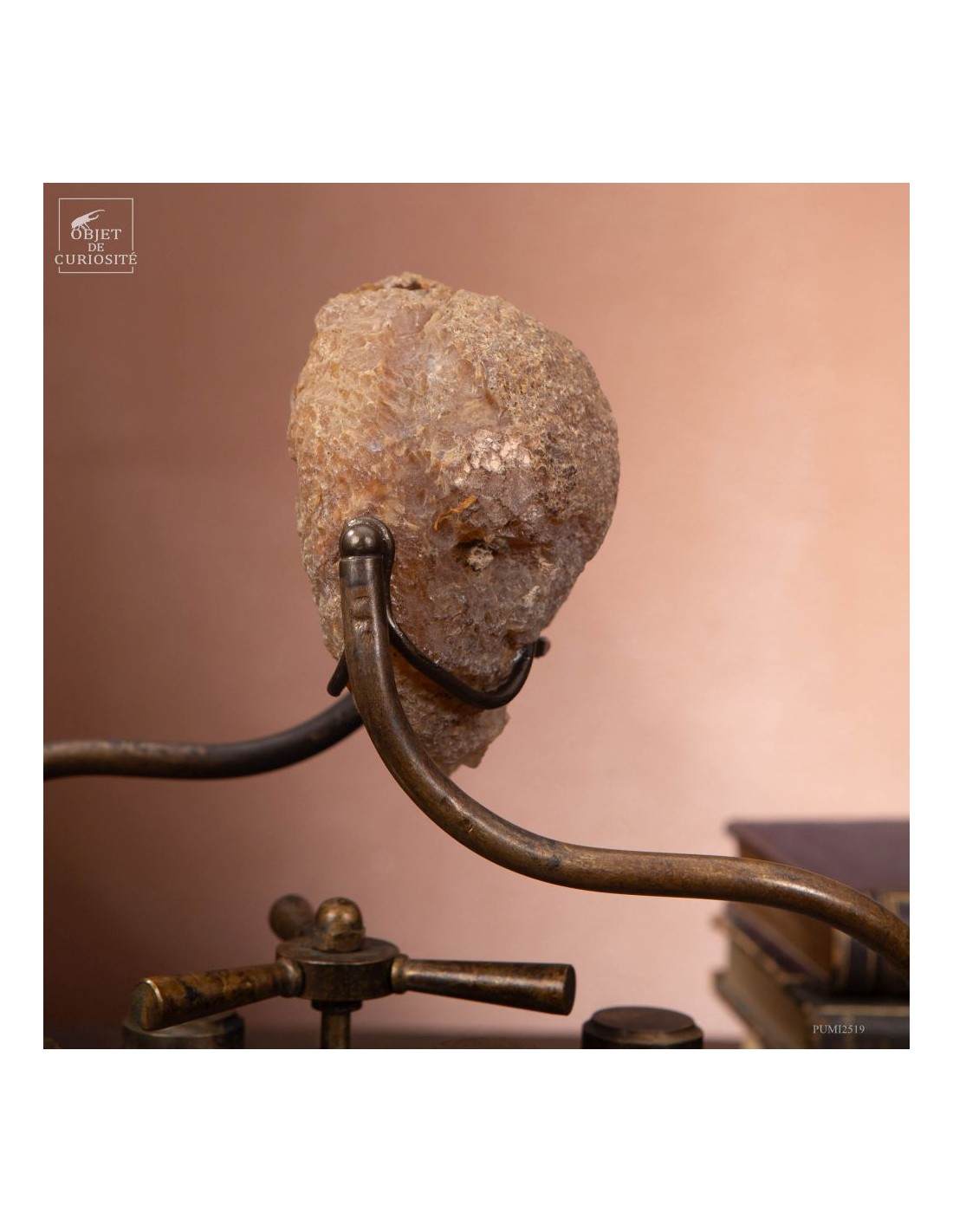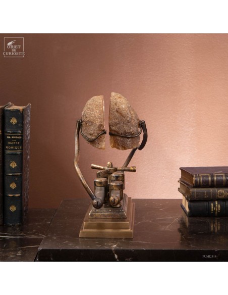 This agate geode comes from Brazil It is sawn in 2 and mounted on a rack mechanism with a brass base. By turning this brass wheel, you can "open" this stone and discover the inside of the geode: you will perfectly see the golden agate border,and the whole interior which is entirely crystallized.
