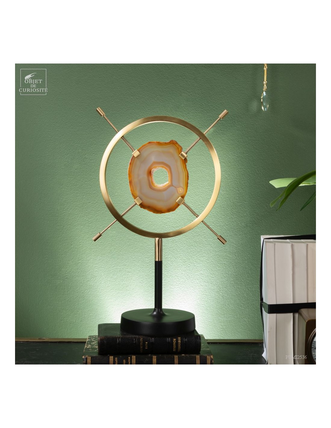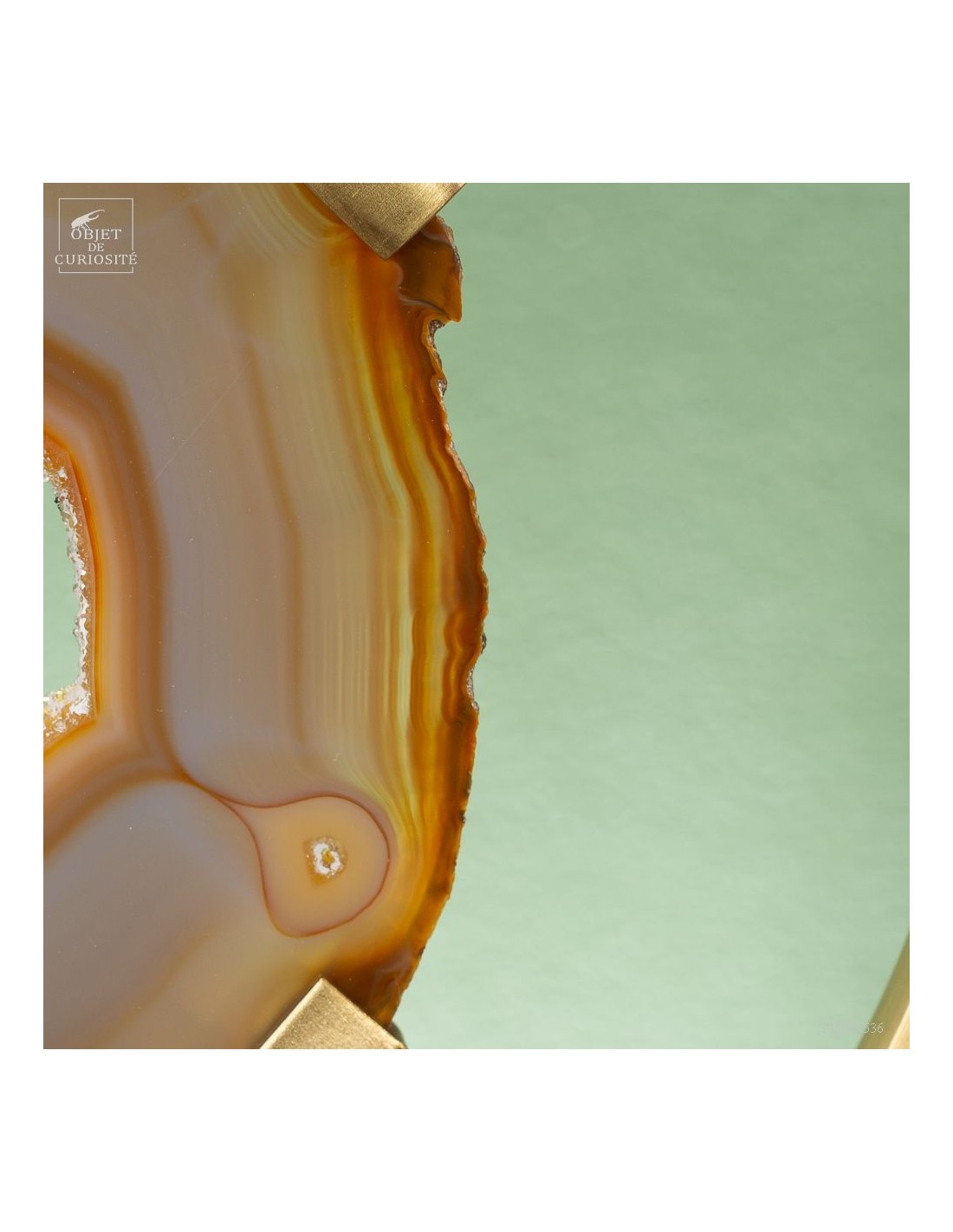 Before becoming a slice of Agate on our console, it was a round pebble from Brazil in a basalt matrix that has been sliced and polished. And before a pebble, it was a bubble of air in a cooling lava of a volcano. Lava became basalt, a porous stone and the chamber has been filled consecutively over millions of years, by water containing dissolved minerals,. Each flood led to a layer of different density, color... That's how a hole becomes such a wonderfull agate. In this case the process stopped before it was completely filled.