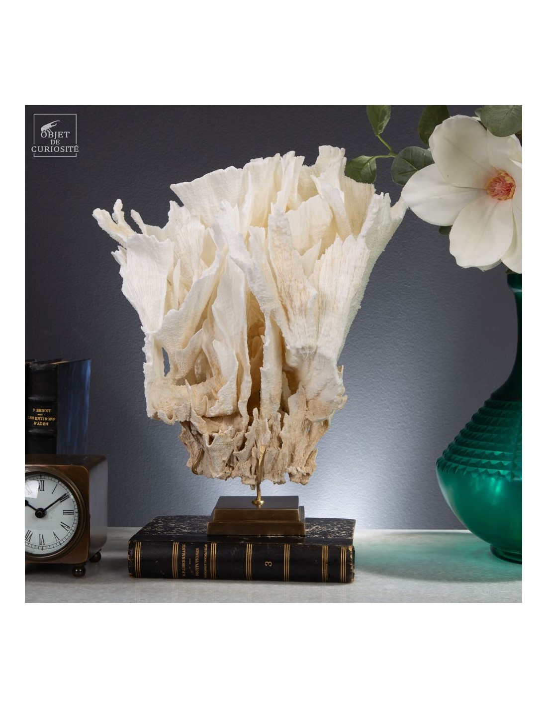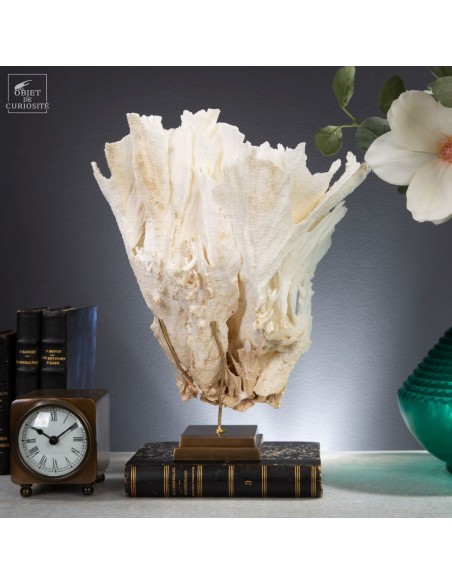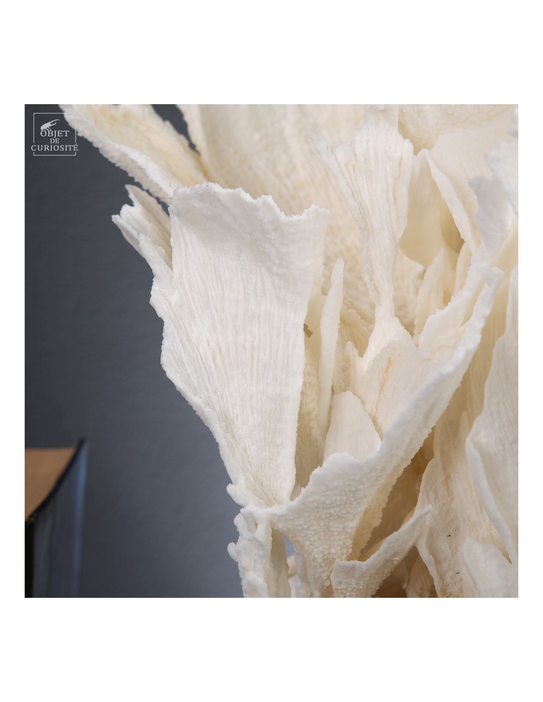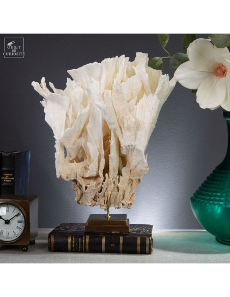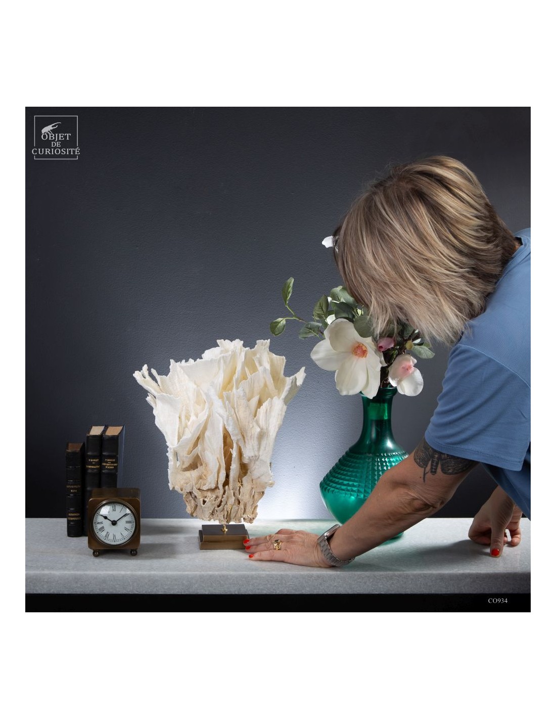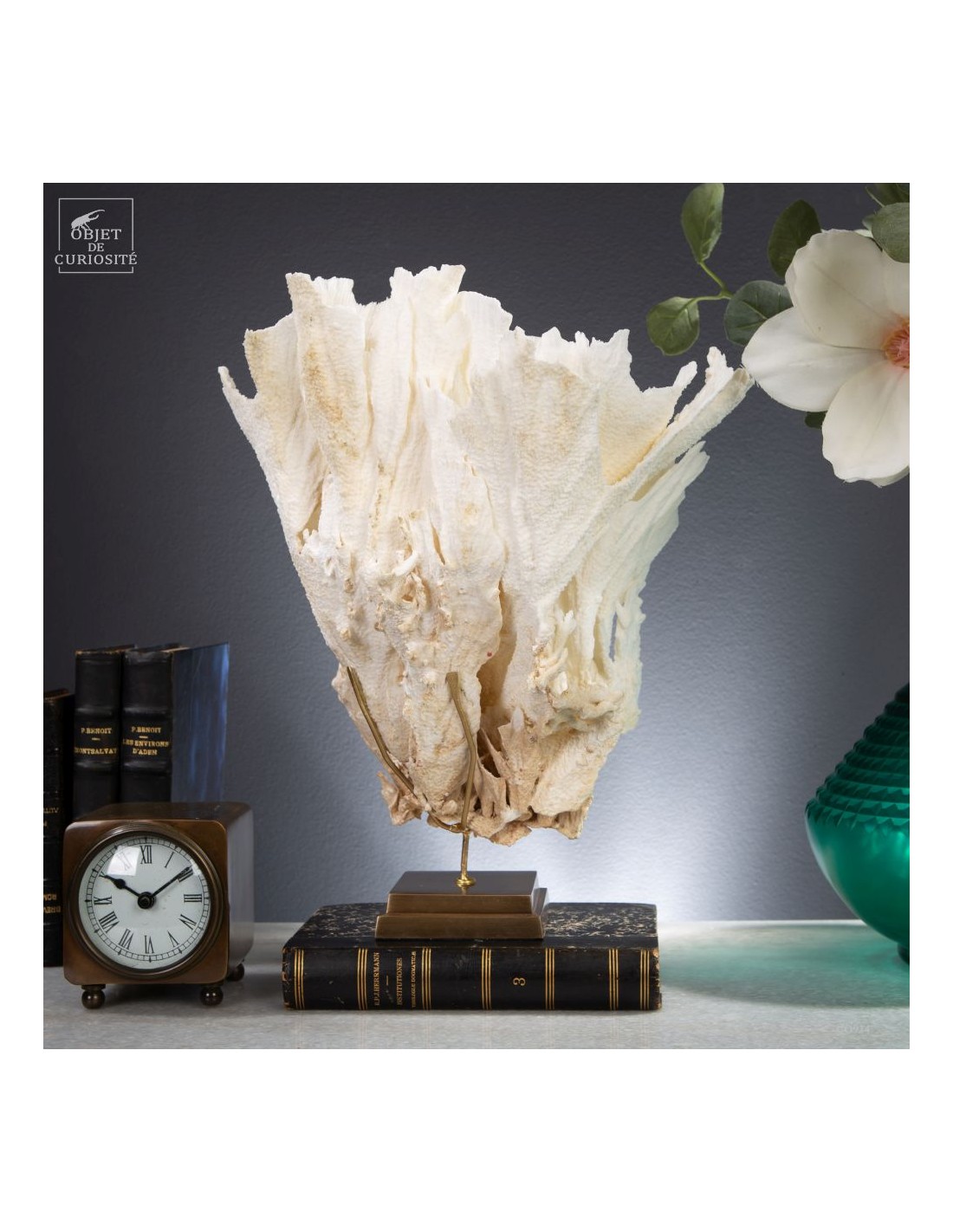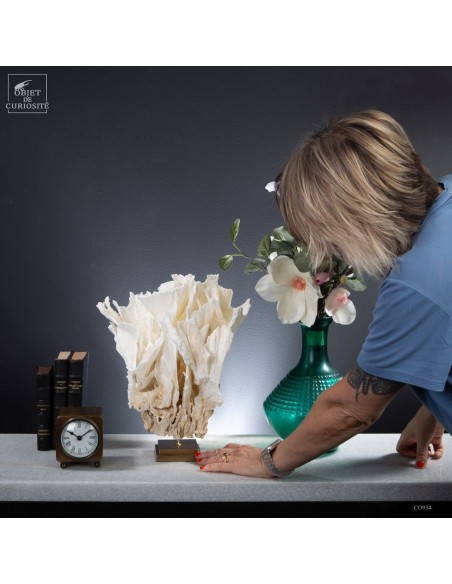 Montipora is a genus of coral from the Acroporidae family, known for its varied forms, ranging from flat plates to encrusting or branching structures. This particular coral has a flower-like morphology, characteristic of certain Montipora species, with thin and delicate “petals” that unfold in radial columns. It has grown in the coral reefs of the Pacific, where relatively calm waters promote its development, especially in sheltered areas away from strong waves. The bright pink coloration along the edges is due to the presence of fluorescent pigments that capture ultraviolet light. Like many coral species, this Montipora is protected under the CITES convention, and it comes with its CITES certificate.