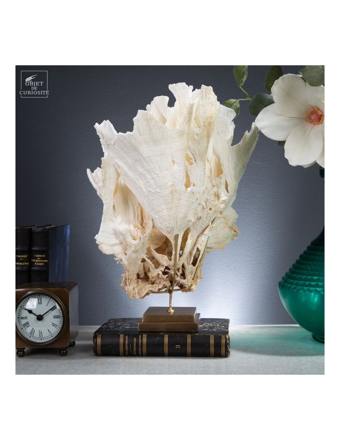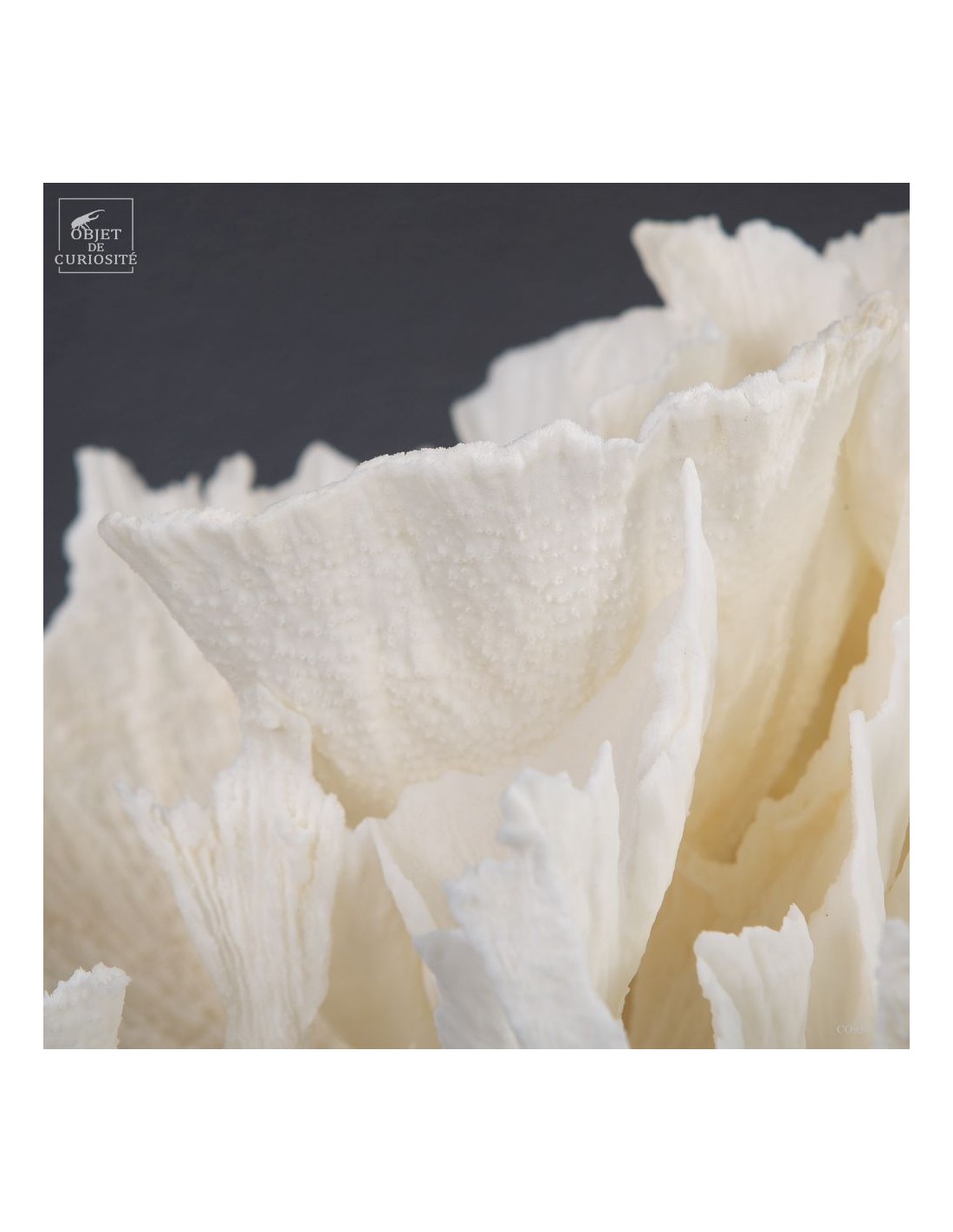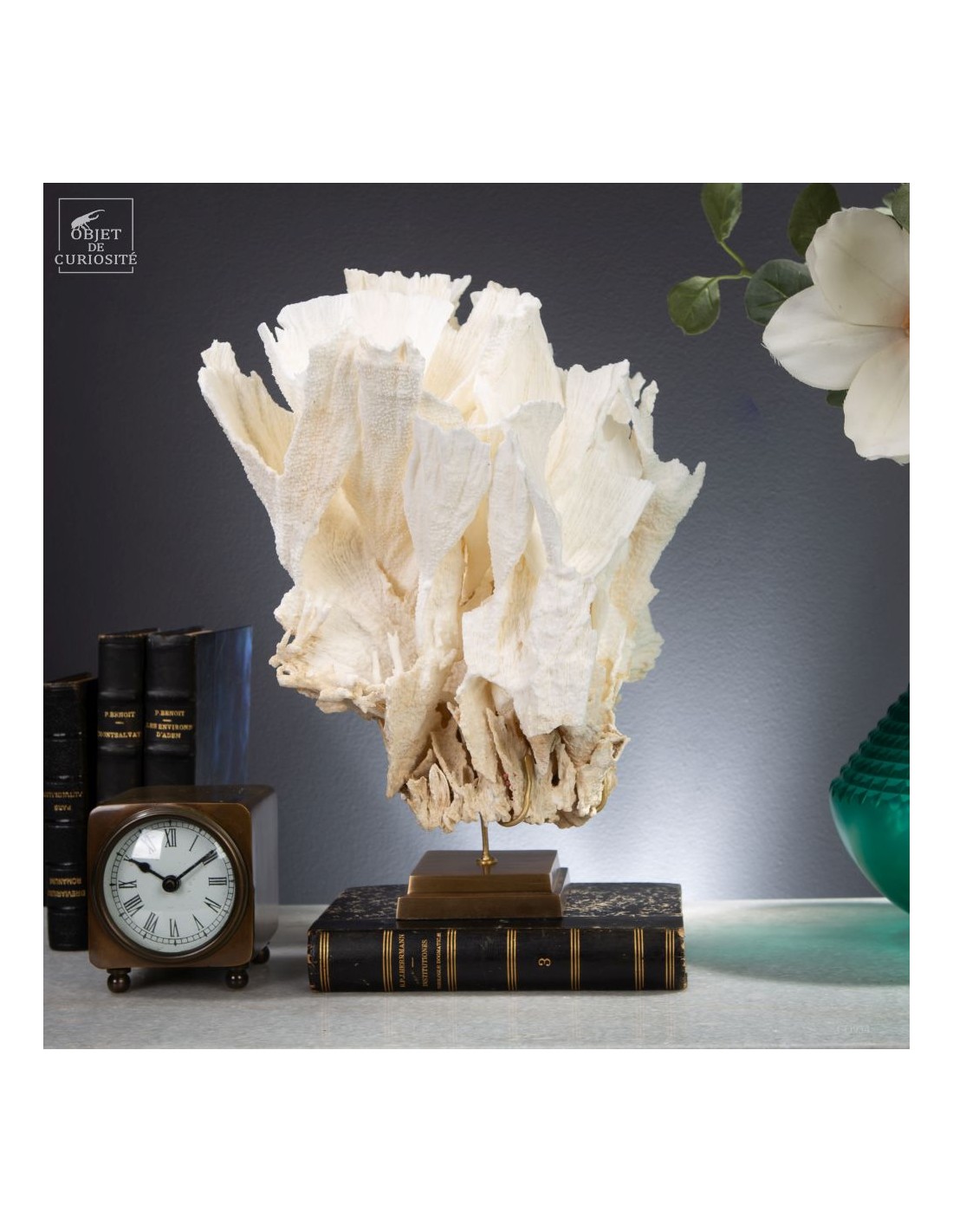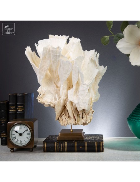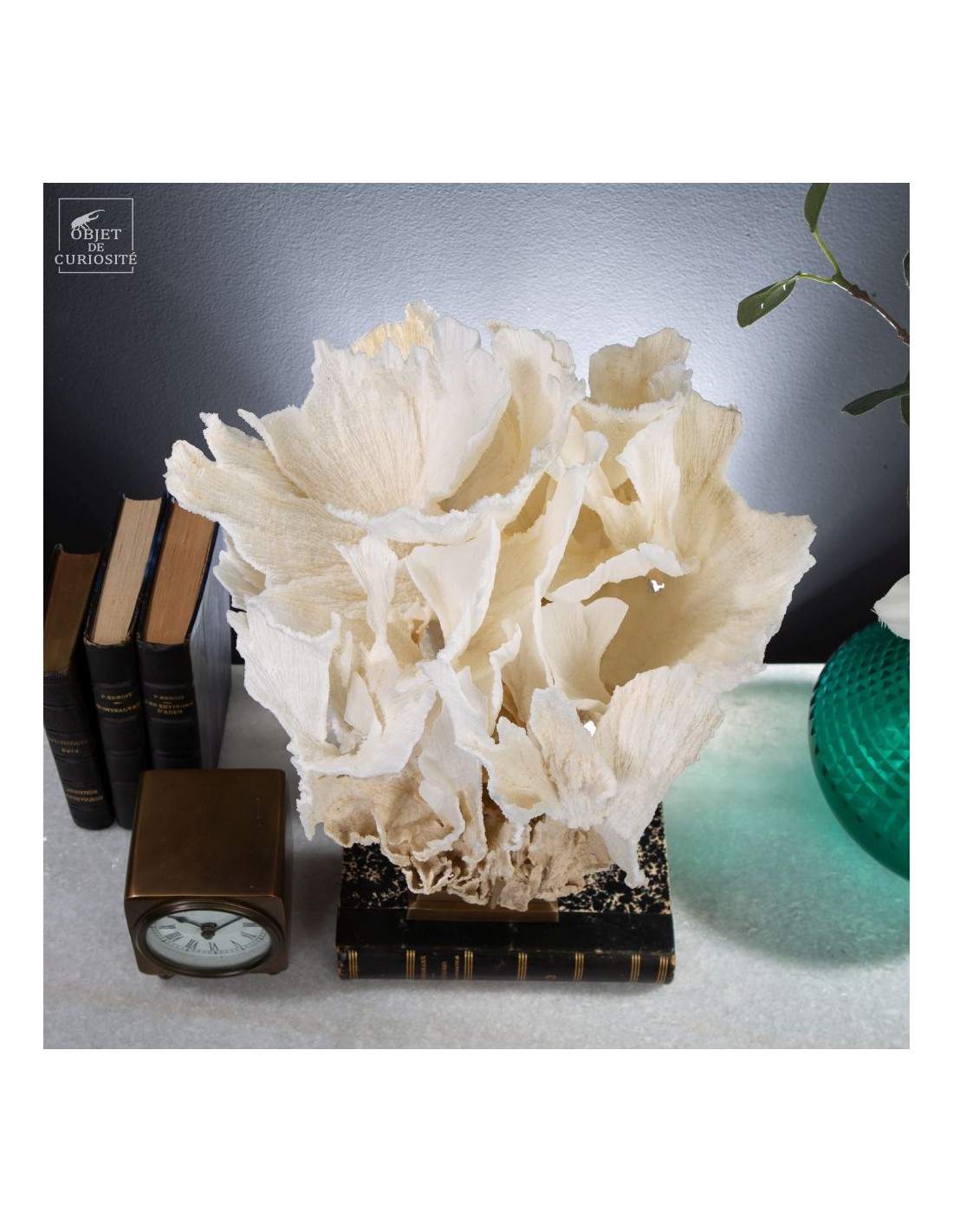 Montipora is a genus of coral from the Acroporidae family, known for its varied forms, ranging from flat plates to encrusting or branching structures. This particular coral has a flower-like morphology, characteristic of certain Montipora species, with thin and delicate “petals” that unfold in radial columns. It has grown in the coral reefs of the Pacific, where relatively calm waters promote its development, especially in sheltered areas away from strong waves. The bright pink coloration along the edges is due to the presence of fluorescent pigments that capture ultraviolet light. Like many coral species, this Montipora is protected under the CITES convention, and it comes with its CITES certificate.