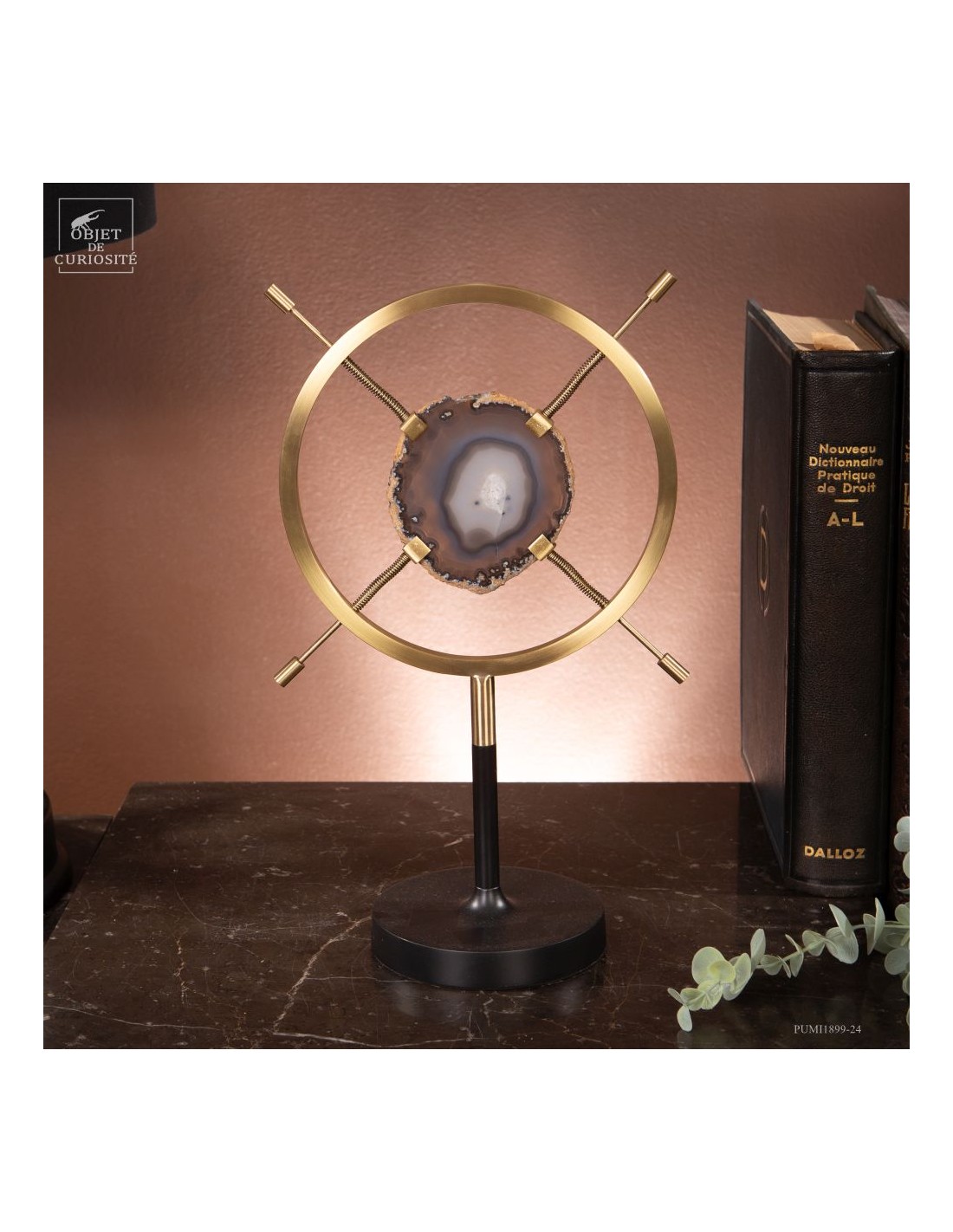 Before becoming a slice of Agate on our console, it was a round pebble from Brazil in a basalt matrix that has been sliced and polished. And before a pebble, it was a bubble of air in a cooling lava of a volcano. Lava became basalt, a porous stone and the chamber has been filled consecutively over millions of years, by water containing dissolved minerals,. Each flood led to a layer of different density, color... That's how a hole becomes such a wonderfull agate. In this case the process stopped before it was completely filled.