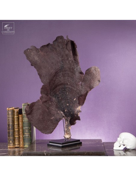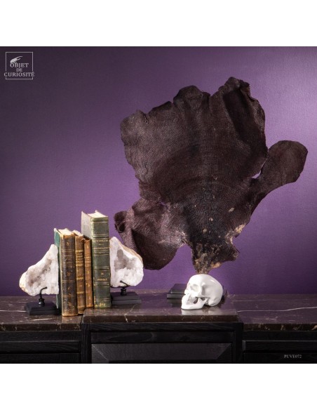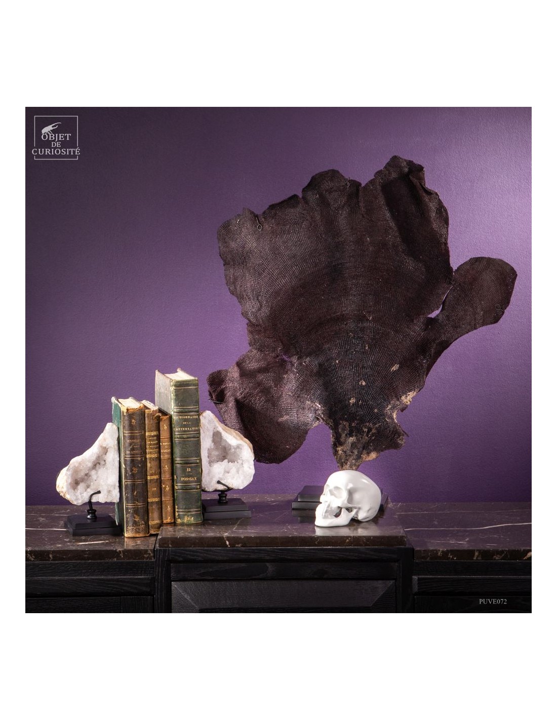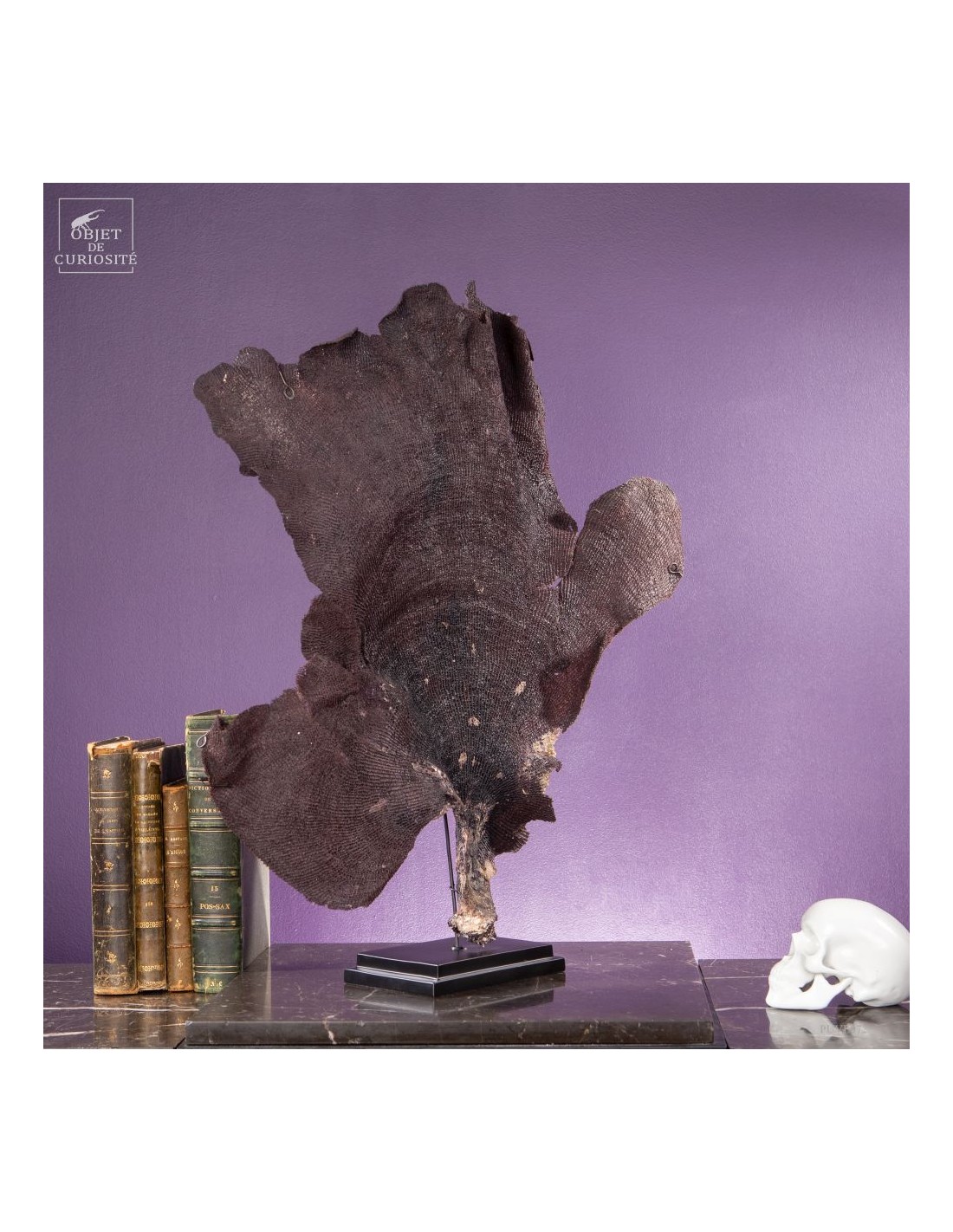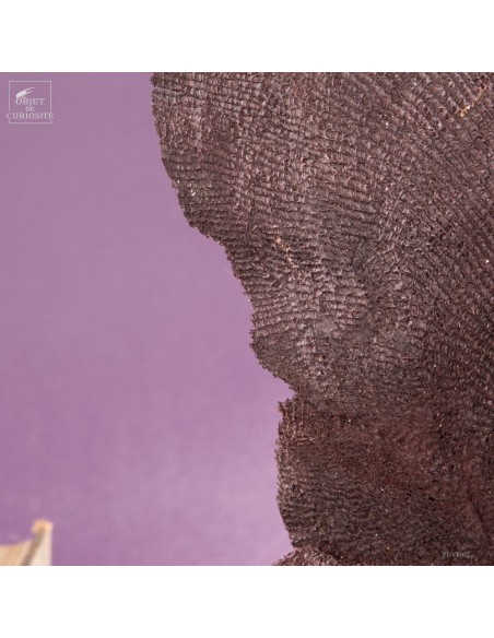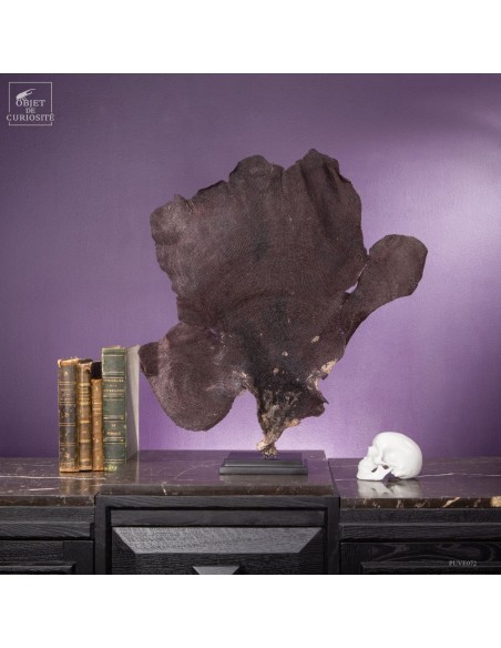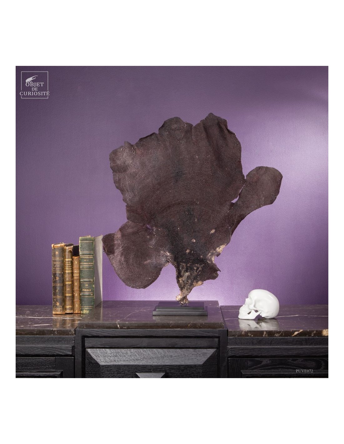 The Ianthella Basta, also known as the elephant ear sponge due to its large, undulating shape, stands out with its deep violet, almost black hue in this particular specimen. This natural fan unfolds into a spectacular form, allowing it to capture nutrients from marine currents. Its texture, reminiscent of fine fabric, along with its delicate structure, is beautifully enhanced by the round brass base.