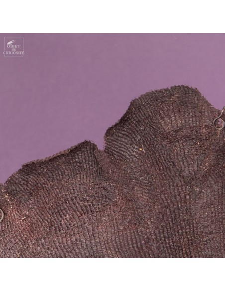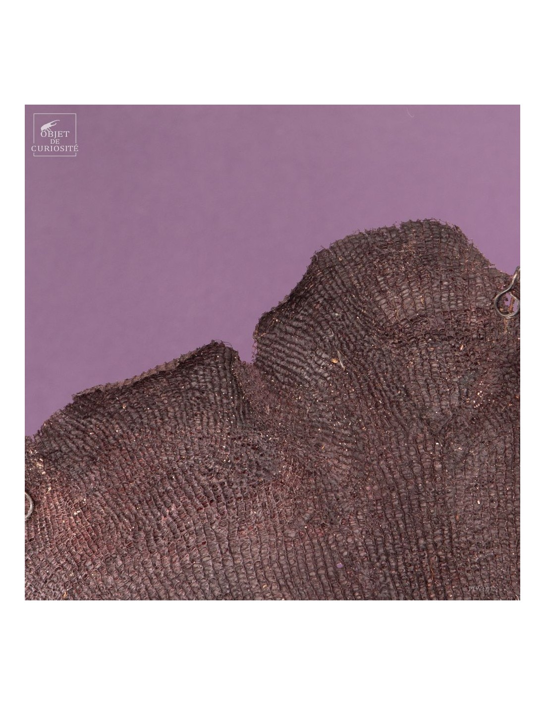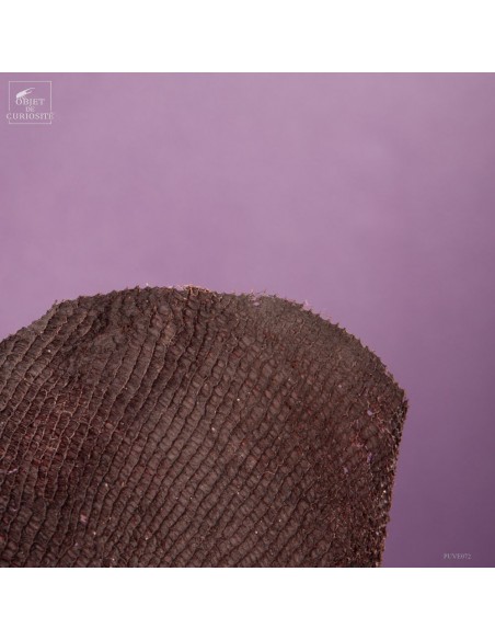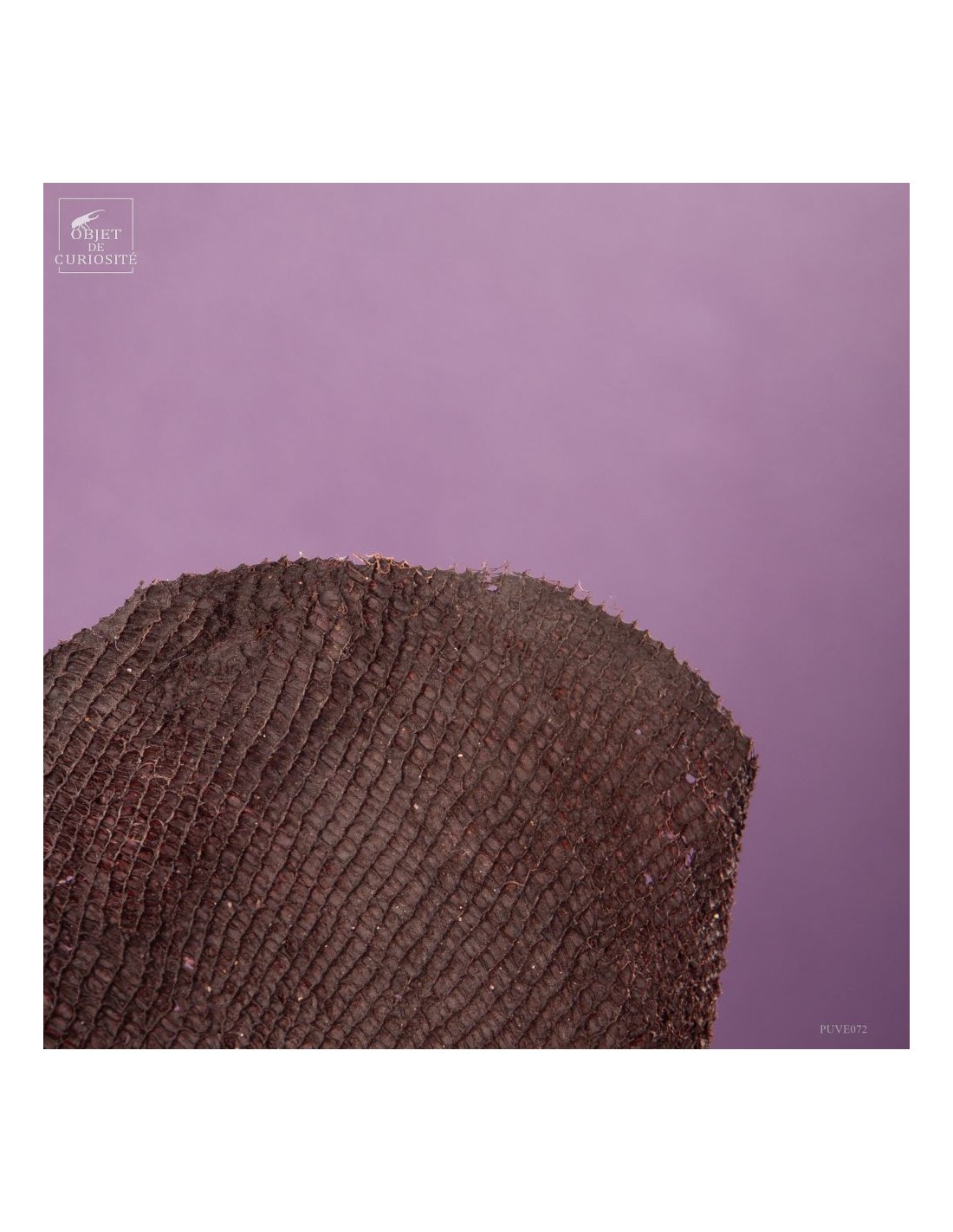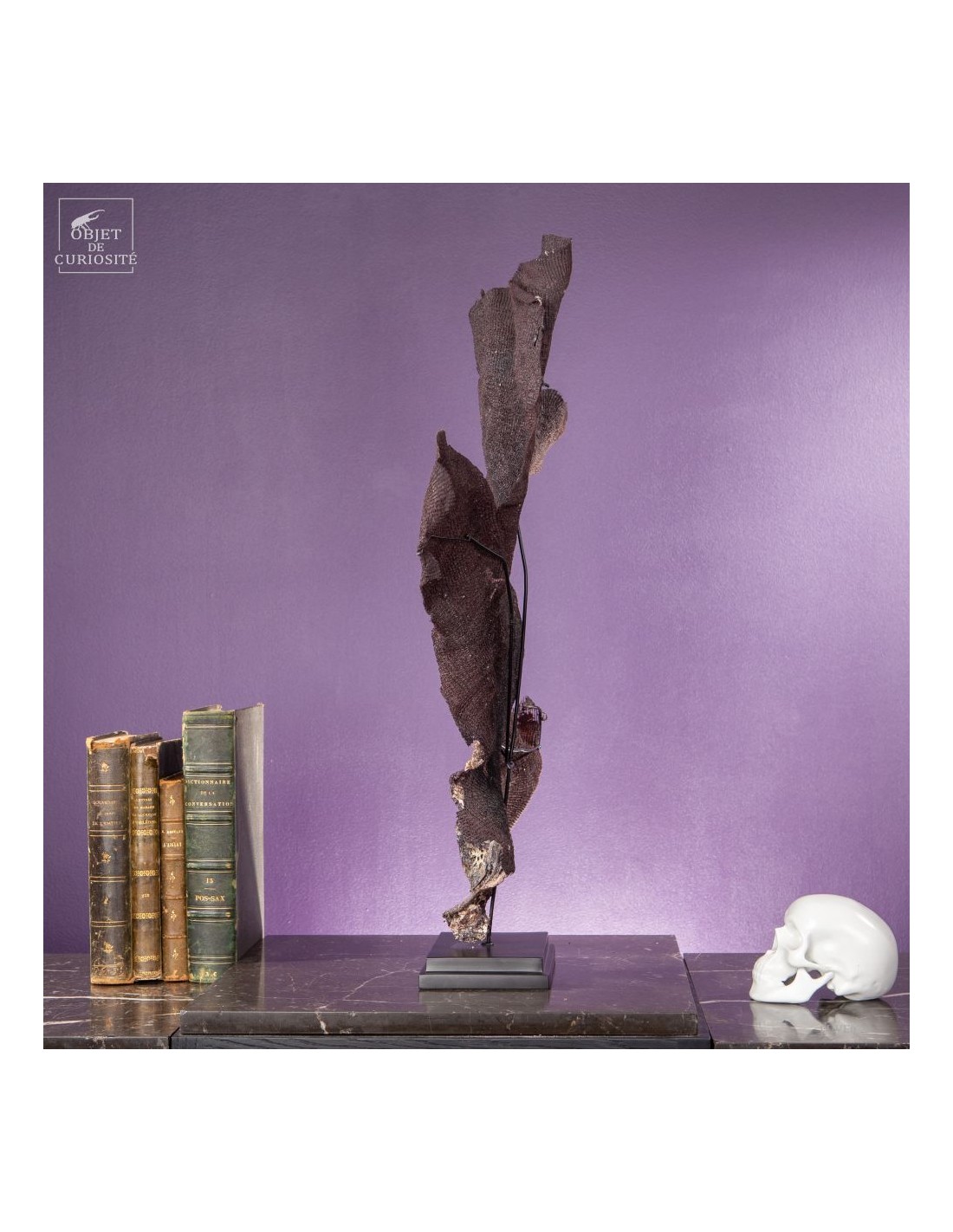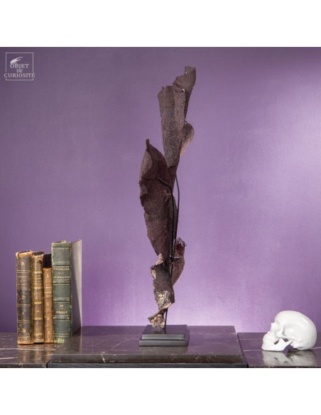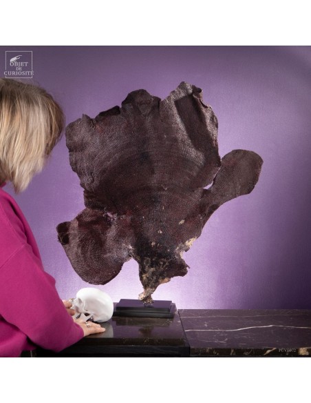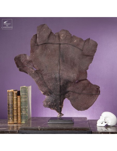 The Ianthella Basta, also known as the elephant ear sponge due to its large, undulating shape, stands out with its deep violet, almost black hue in this particular specimen. This natural fan unfolds into a spectacular form, allowing it to capture nutrients from marine currents. Its texture, reminiscent of fine fabric, along with its delicate structure, is beautifully enhanced by the round brass base.