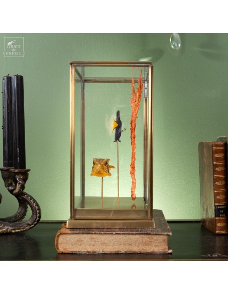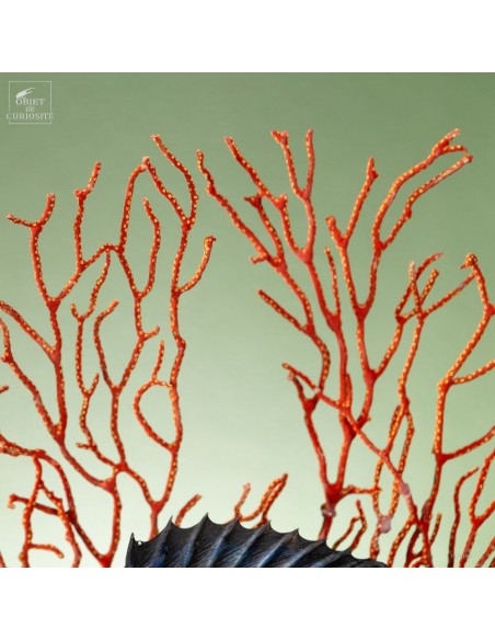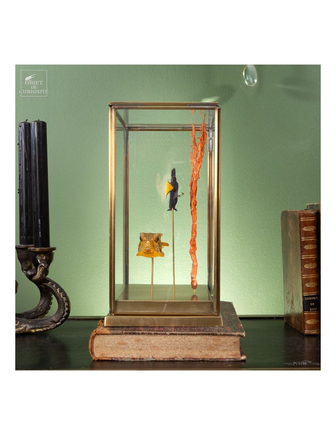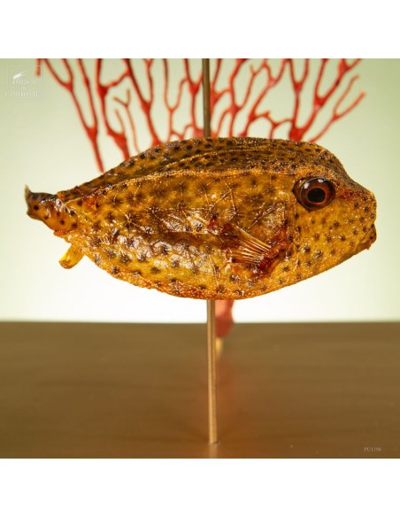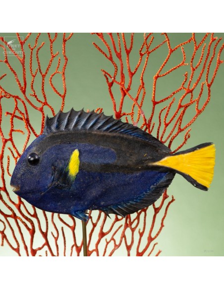 In the spirit of compositions very fashionable in the 60s, a very colorful set: A real fish in armor: the boxfish (the family of Ostraciidae) has endowed itself with bone plates that form an exoskeleton. added to this a toxin contained in their bodies: they have virtually no predators. As well as the famous blue surgeon fish, Paracanthurus hepatus. He is better known as Dory, the amnesic fish from the cartoon "Nemo". Once naturalized, they must be given back their original colors, because they fade very quickly as soon as they die.