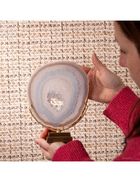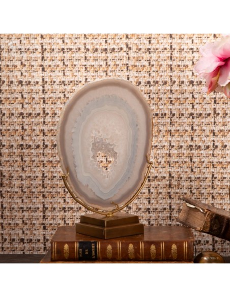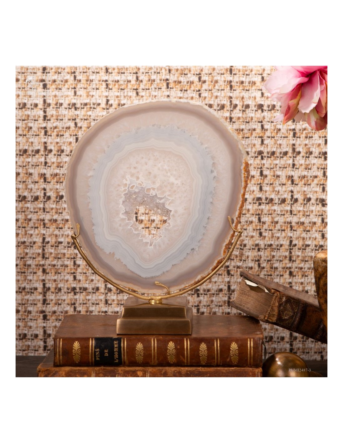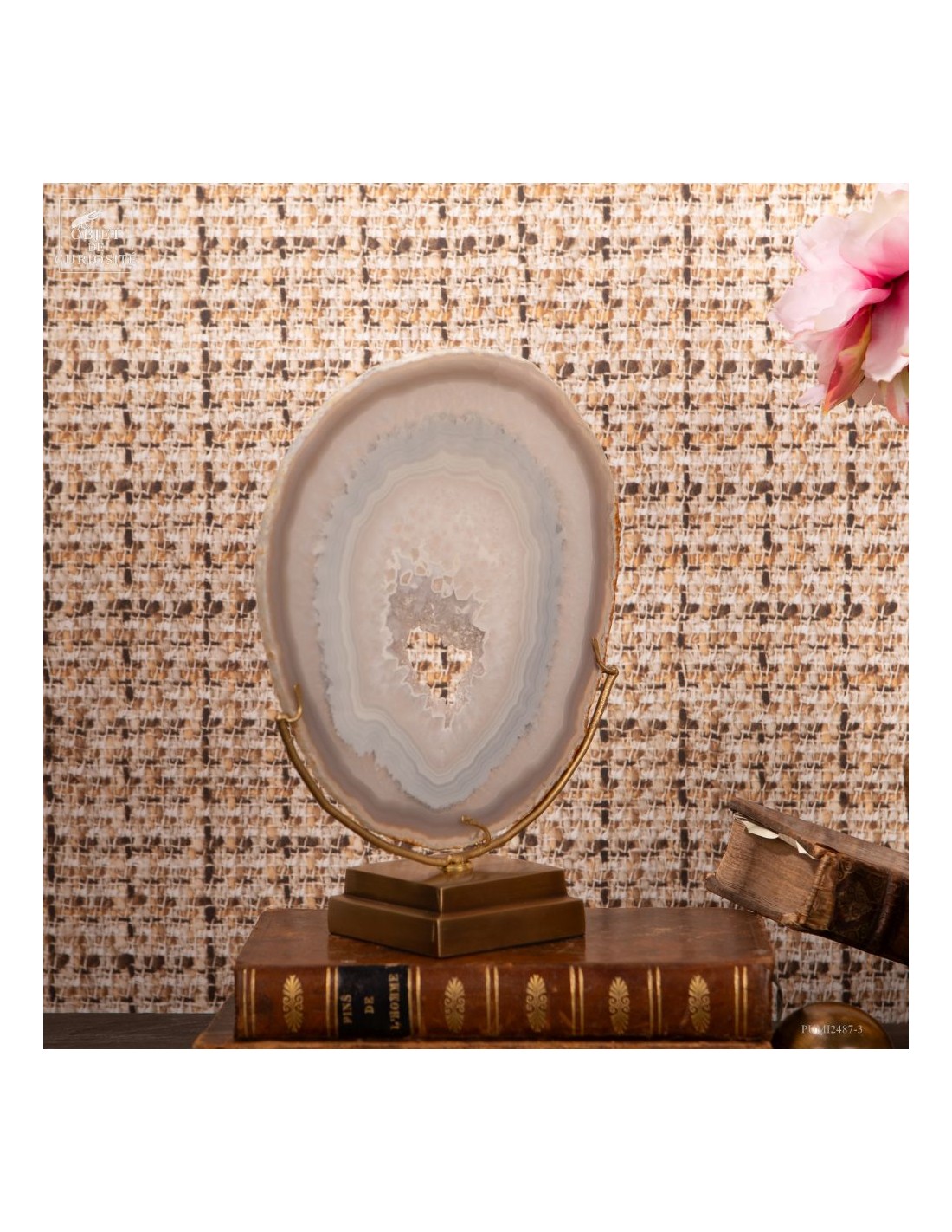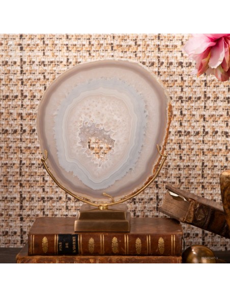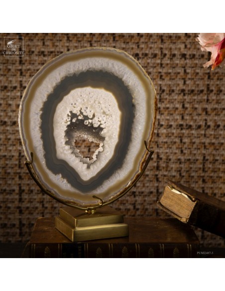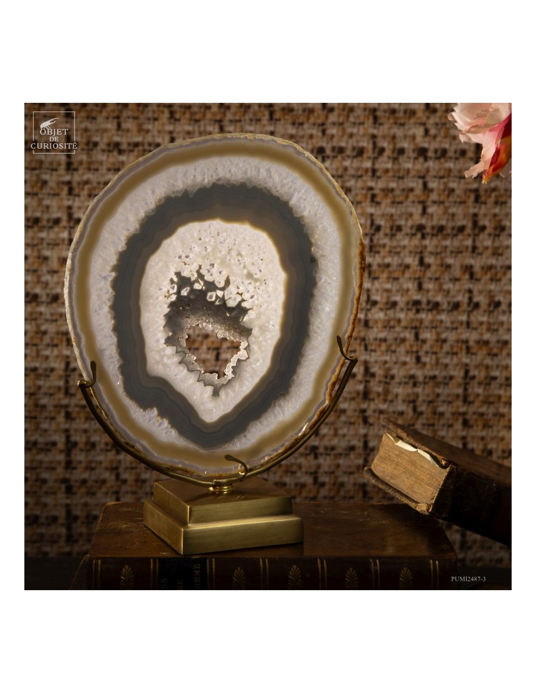 This natural contrast between the crystal structure and the layers of agate testifies to the millions of years necessary for the formation of this piece. Mounted on a brass base, it captures the light and reveals another facet of its beauty, perfect to attract the eye in a refined space.