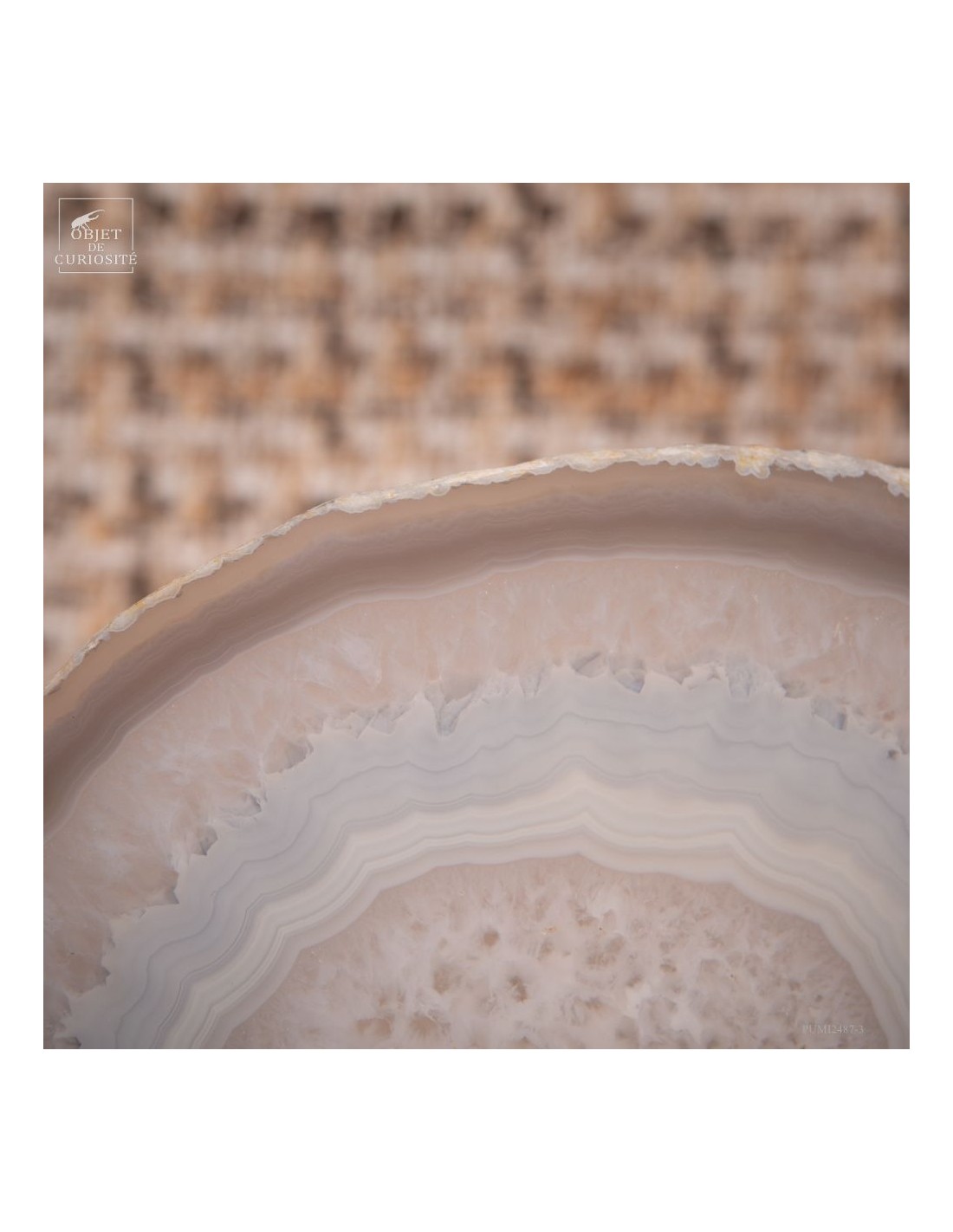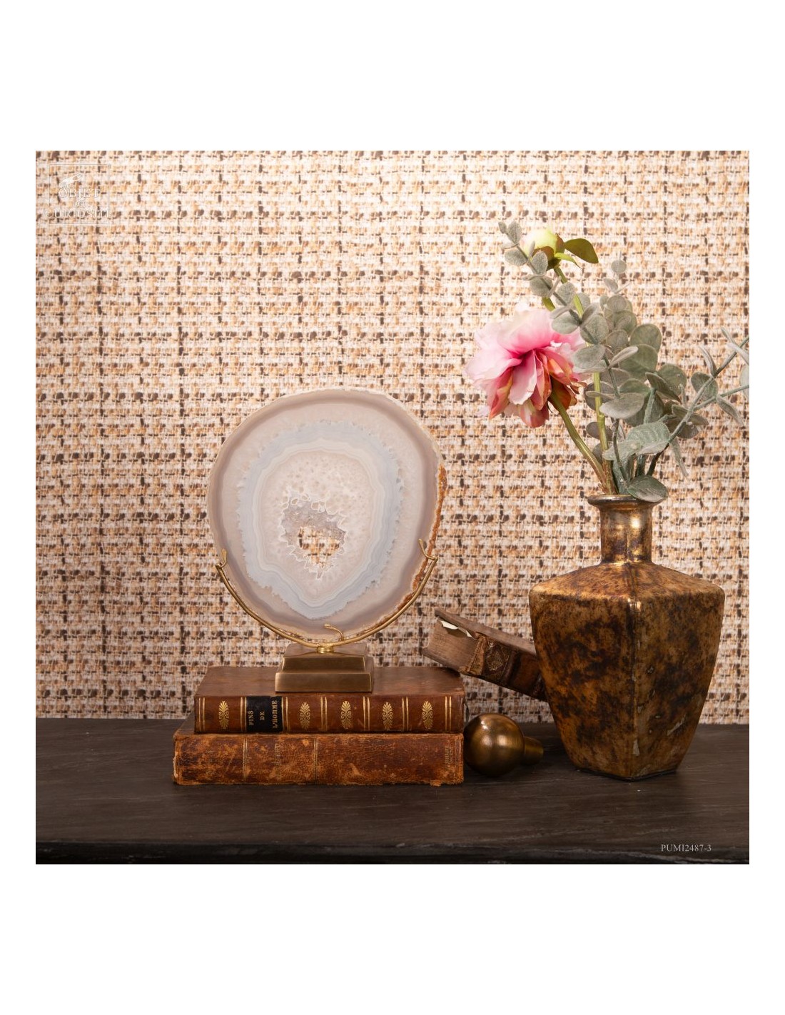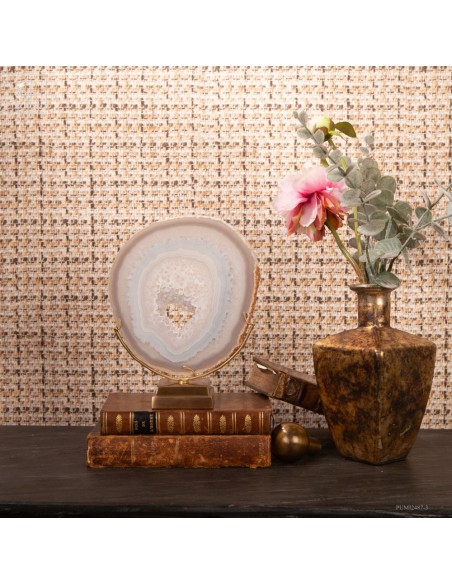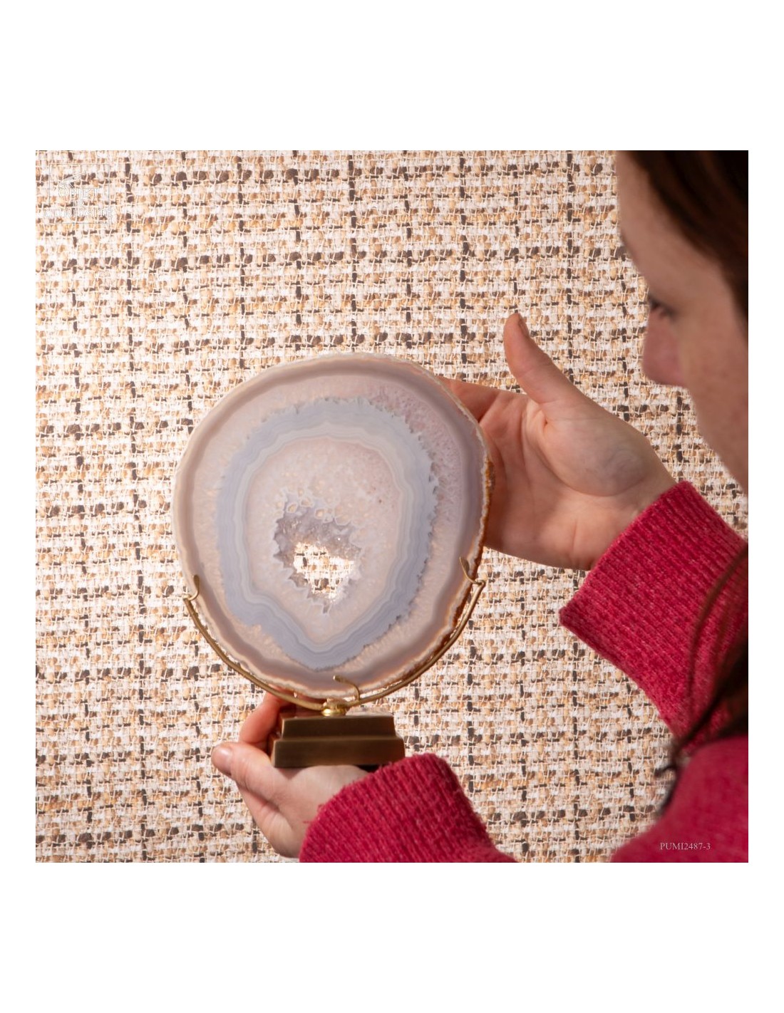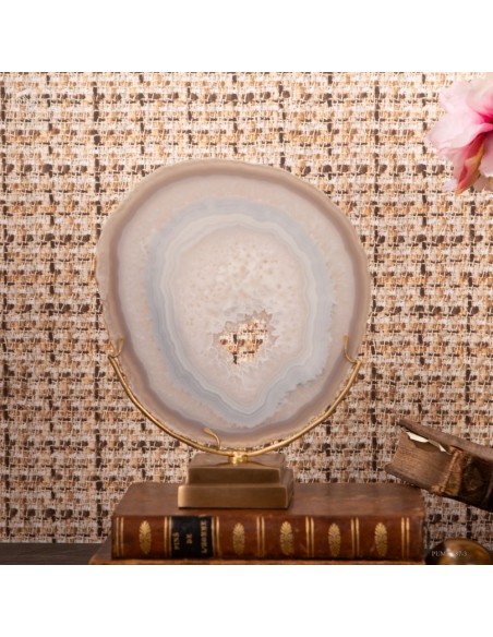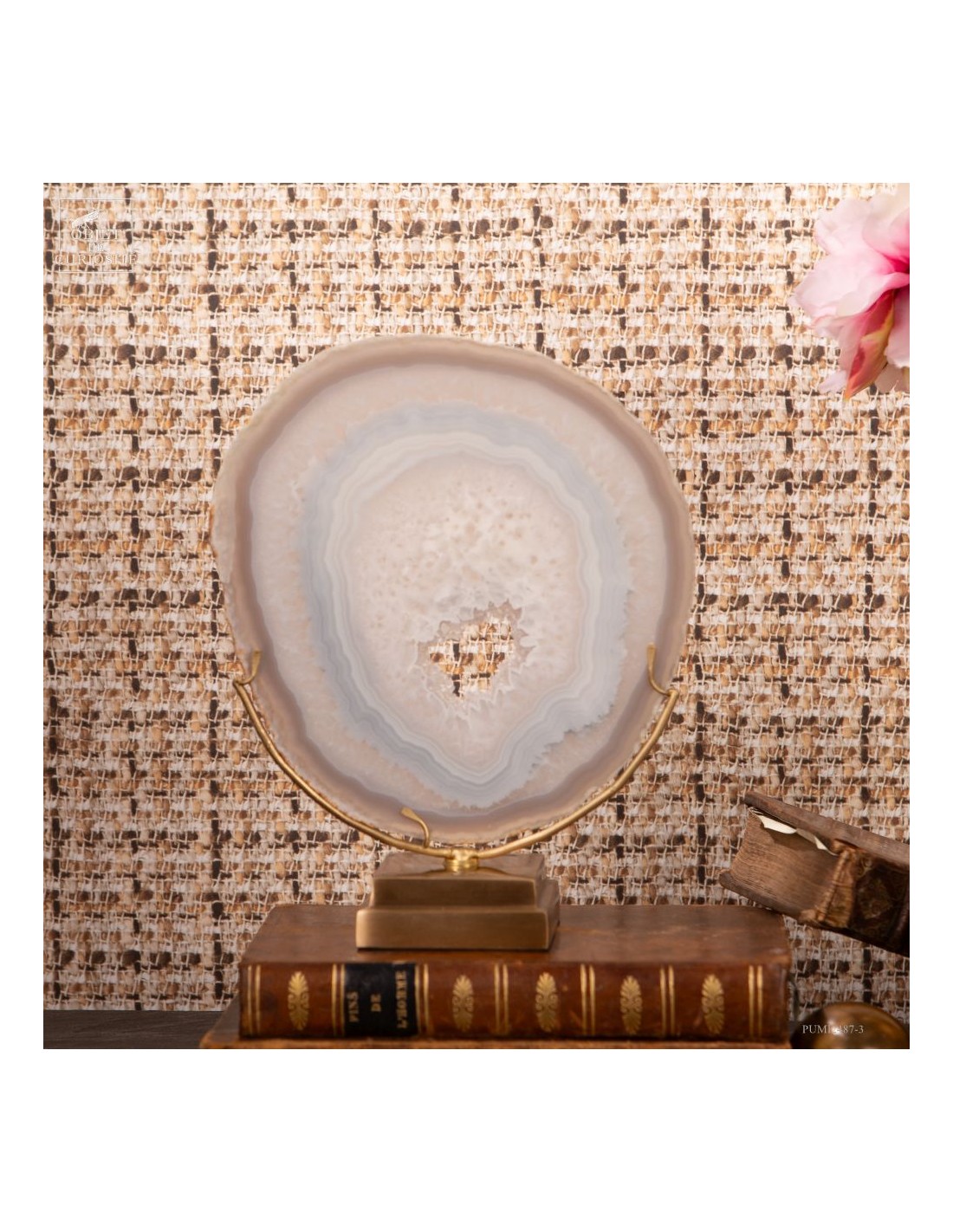 This natural contrast between the crystal structure and the layers of agate testifies to the millions of years necessary for the formation of this piece. Mounted on a brass base, it captures the light and reveals another facet of its beauty, perfect to attract the eye in a refined space.