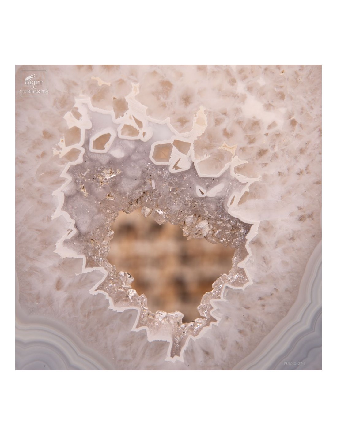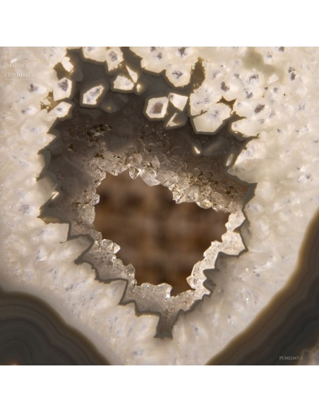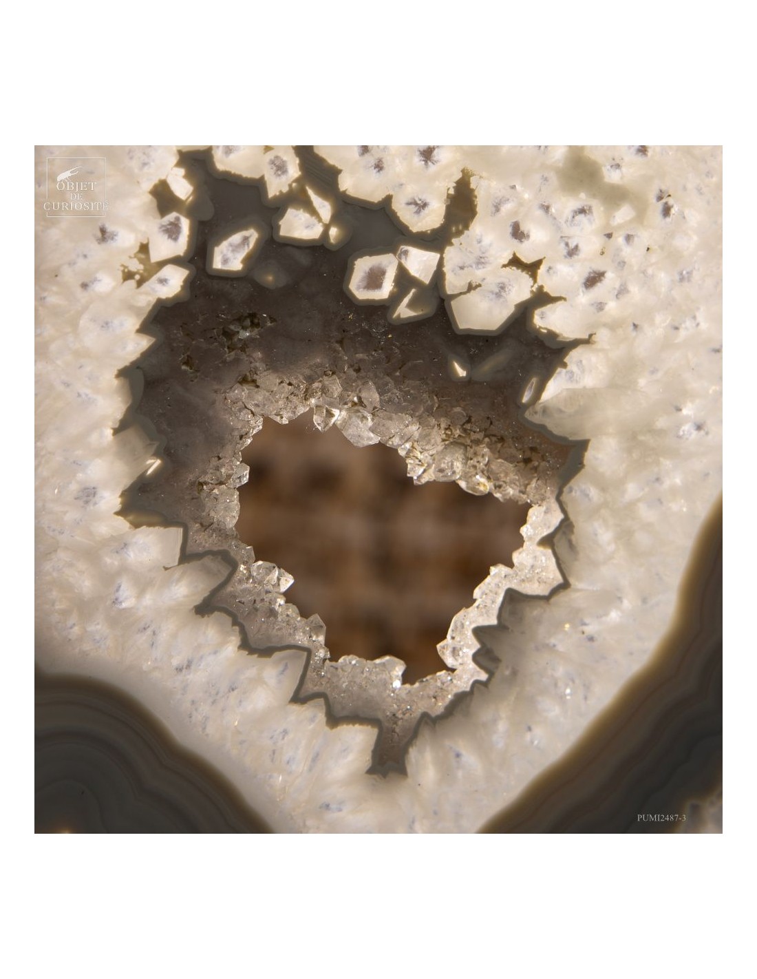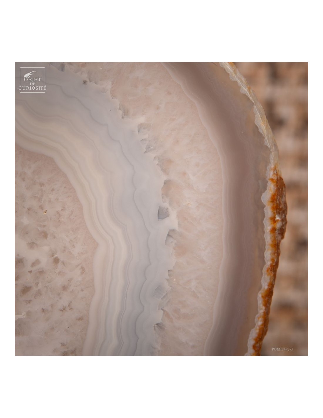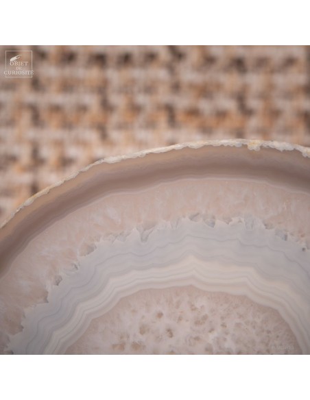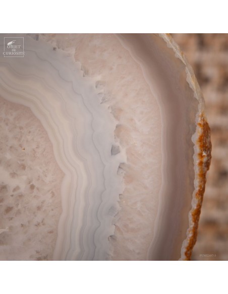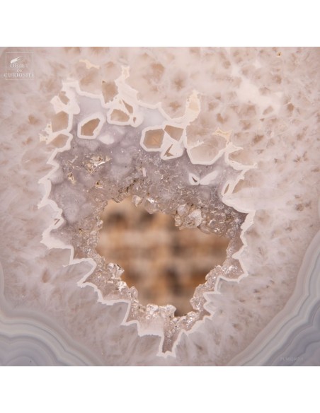 This agate slice, from the Brazilian deposits, is distinguished by its crystallized heart surrounded by a harmonious alternation of layers of agate in very soft tones. The crystals in the centre are bright, contrasting with the regular agate bands, which are much more contrasted when light passes through them (picture 7 and 8).