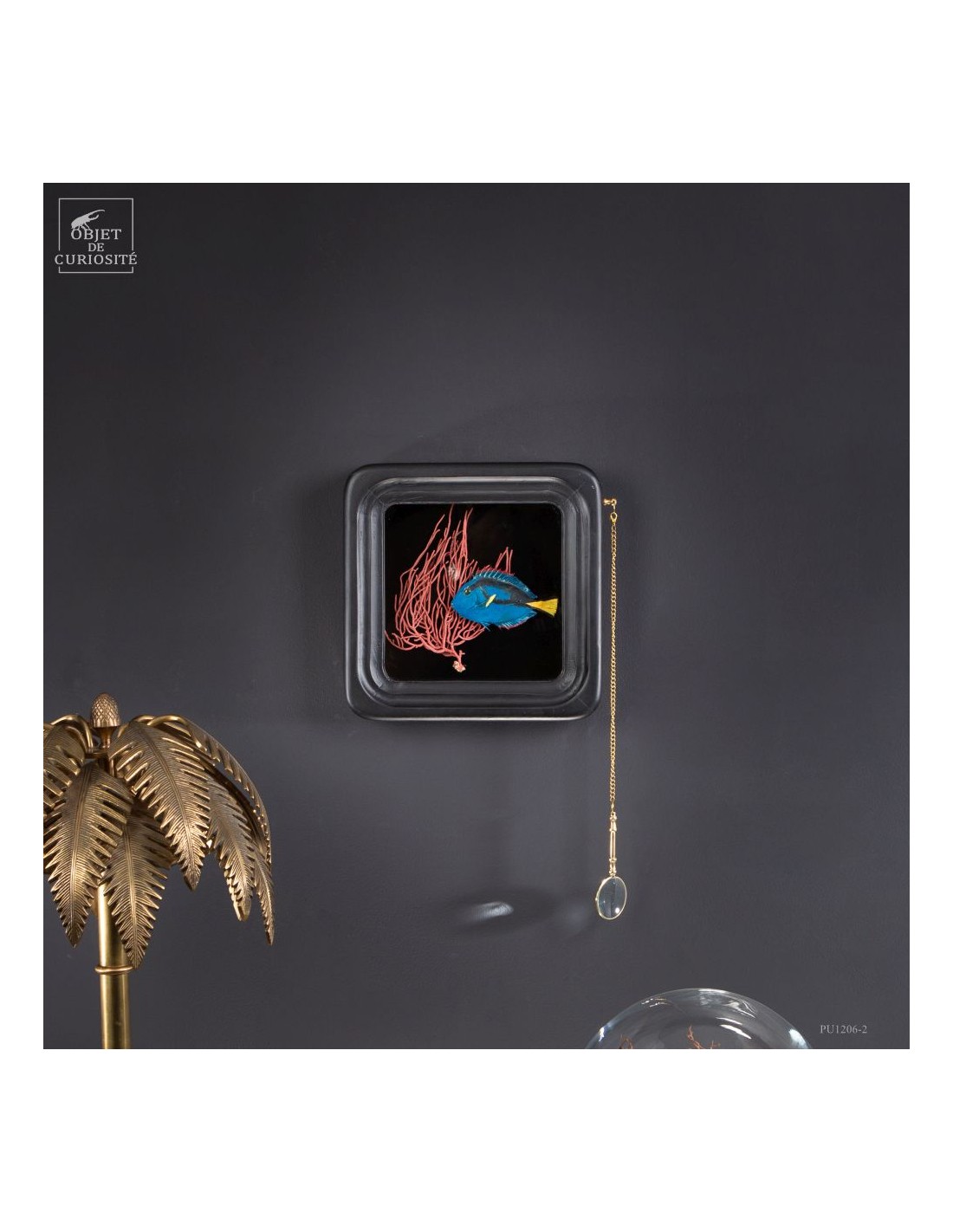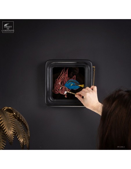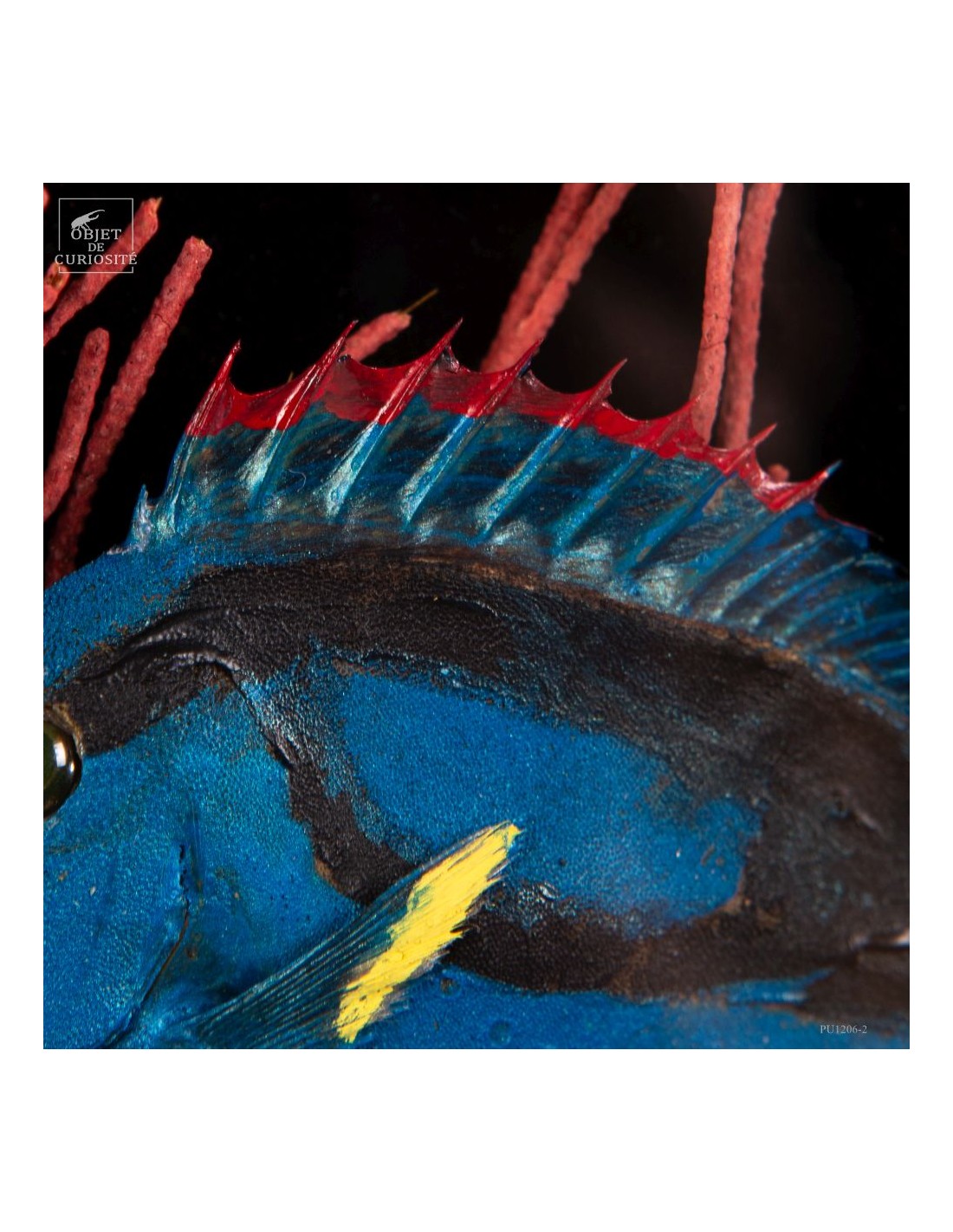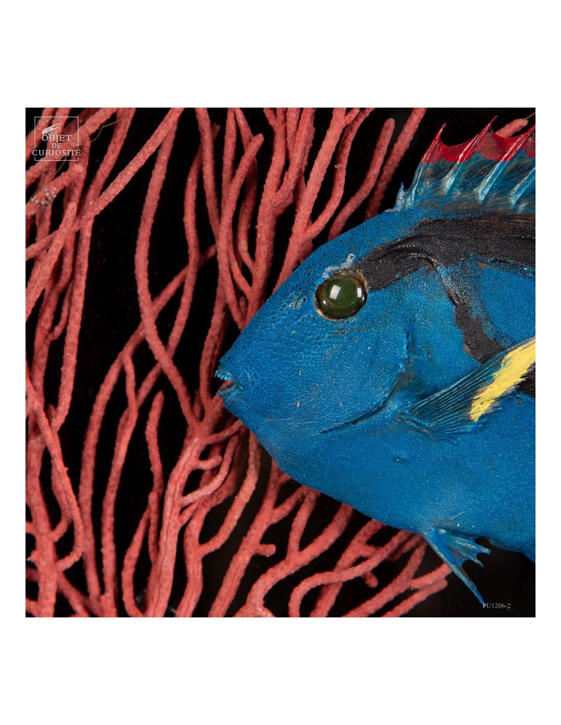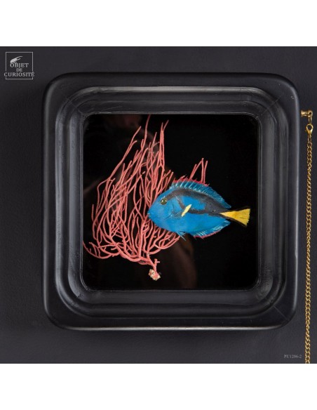 The Paracanthurus hepatus fish, better known as the blue surgeon or ‘Dory’ to film buffs, is an icon of tropical coral reefs. Native to the warm waters of the Indian Ocean and the Pacific, it is renowned for its electric blue body crossed by a sinuous black line and its bright yellow caudal fin. This specimen is displayed alongside a small red gorgonian.