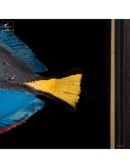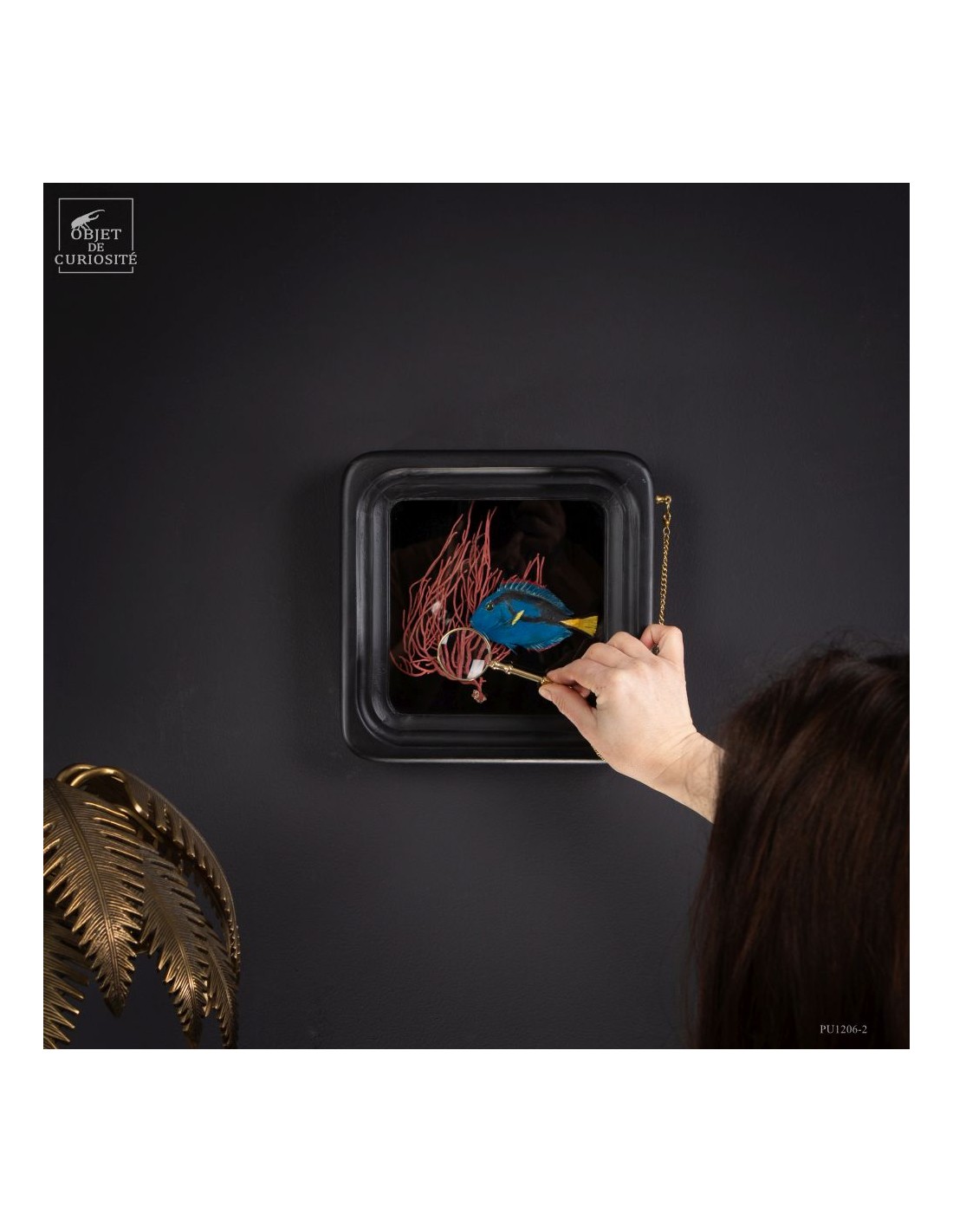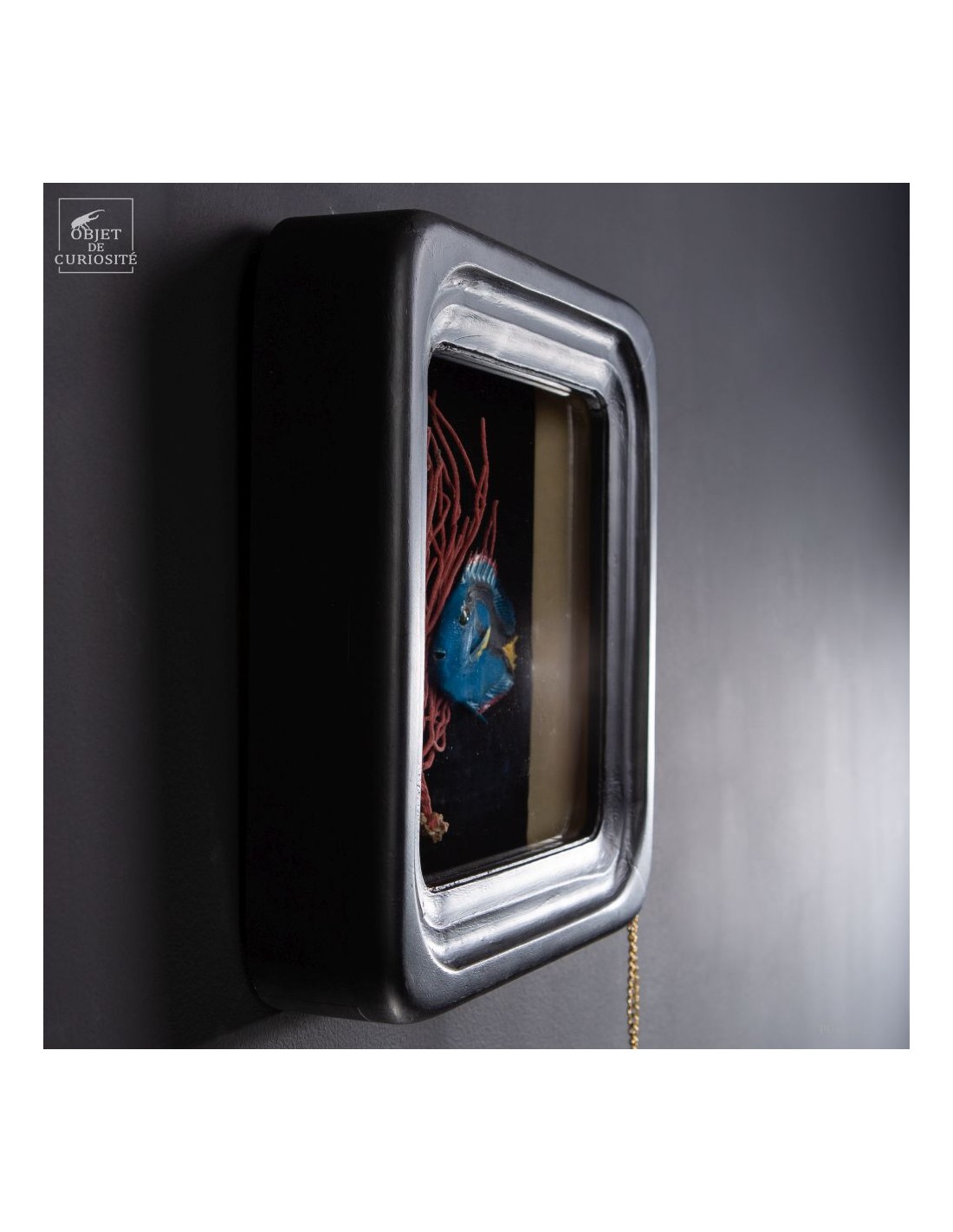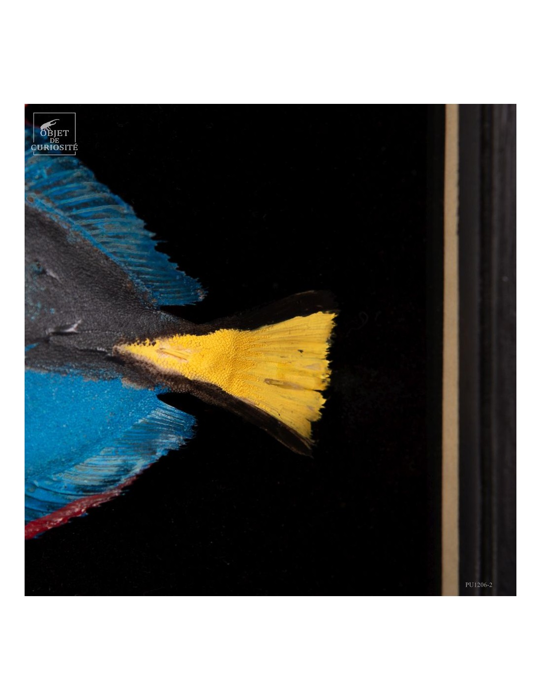The Paracanthurus hepatus fish, better known as the blue surgeon or ‘Dory’ to film buffs, is an icon of tropical coral reefs. Native to the warm waters of the Indian Ocean and the Pacific, it is renowned for its electric blue body crossed by a sinuous black line and its bright yellow caudal fin. This specimen is displayed alongside a small red gorgonian.