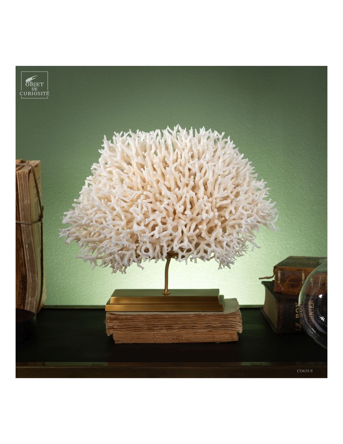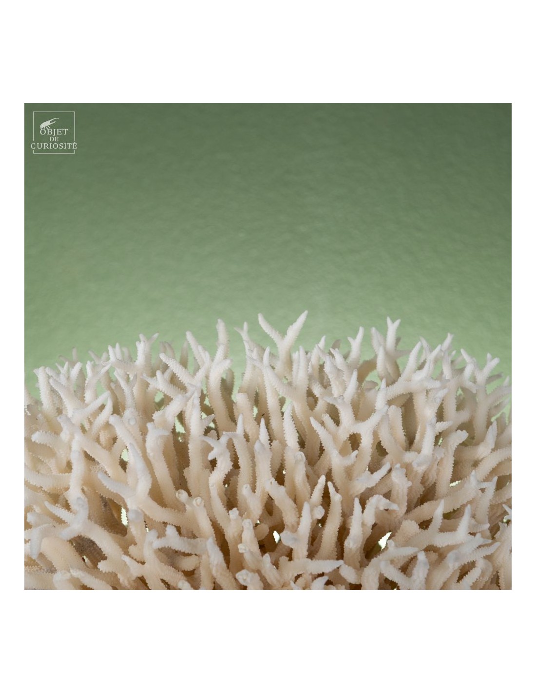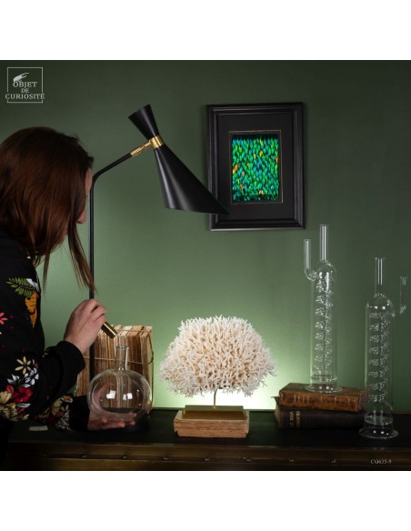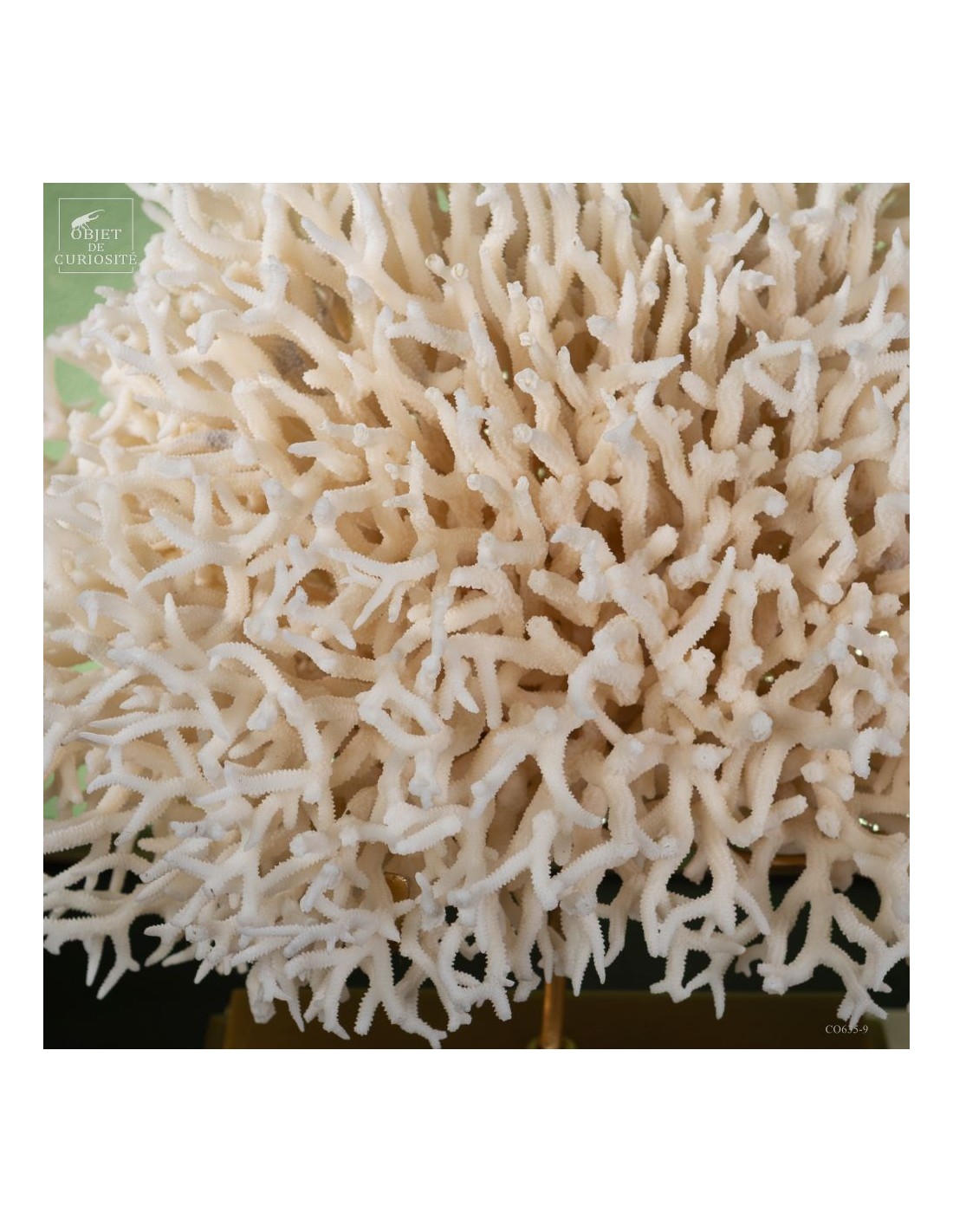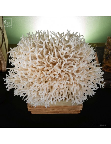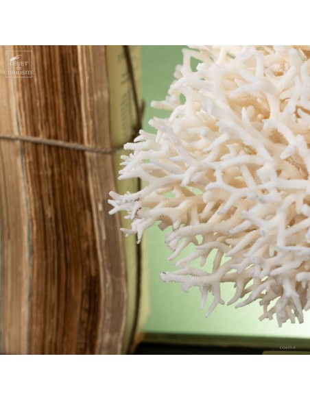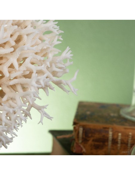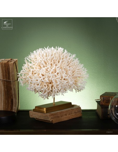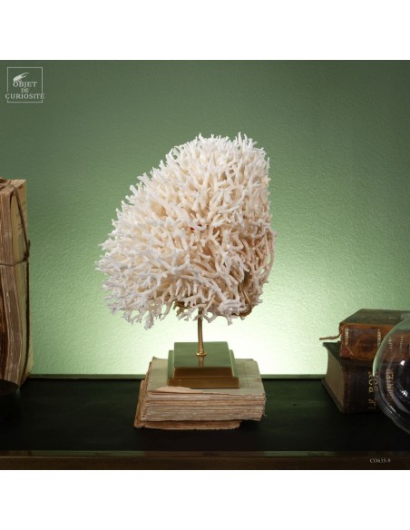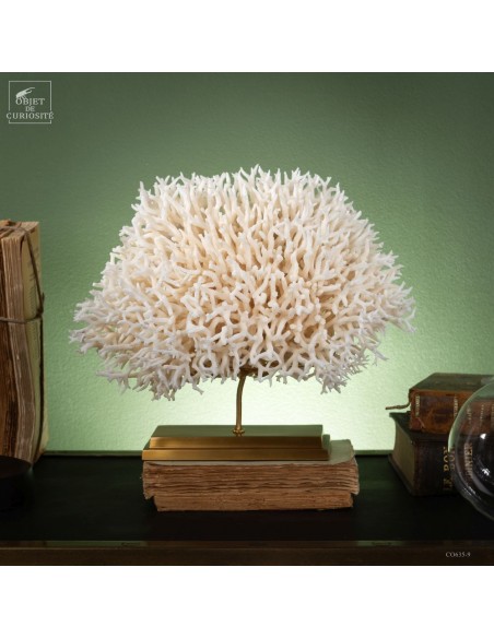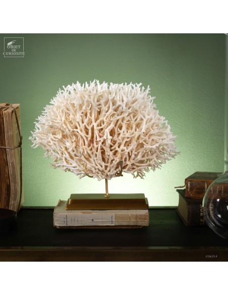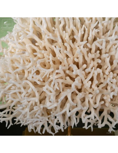 White nest coral on a brass base. This coral comes from the Salomon islands and is made of hundreds of small branches. Its scientific name: Seriatopora Hystrix. Under the water, the tiips remains white, but all the rest is showing a strong pink ( or yellow on some sub-species). This coral is delivered with its own CITES number (Convention of Washington on endangered species)