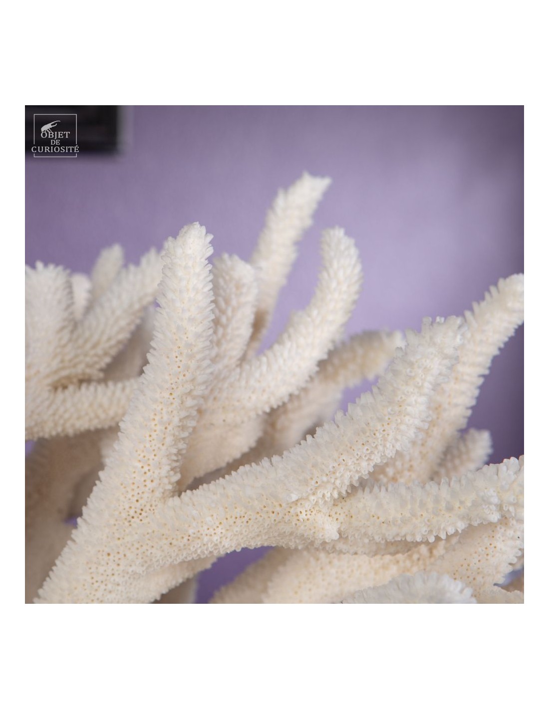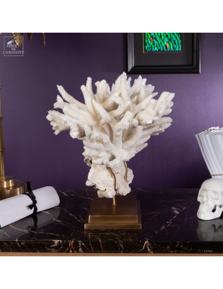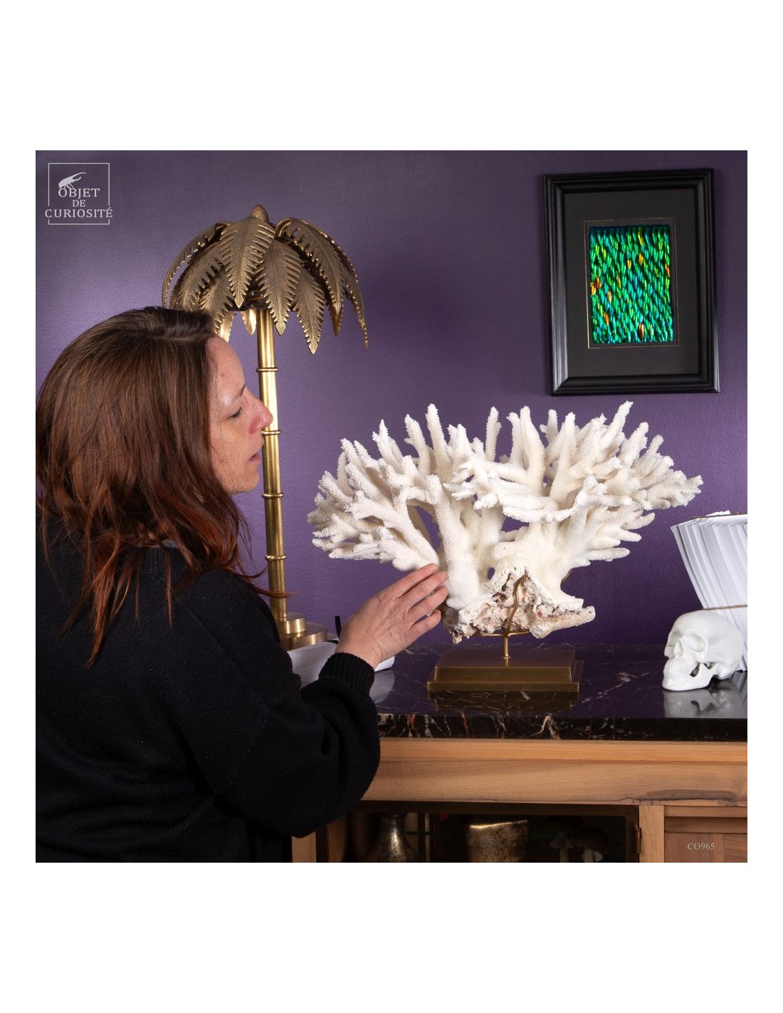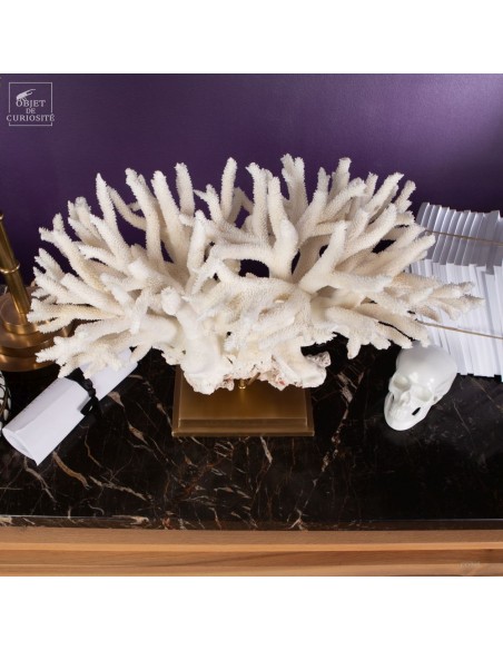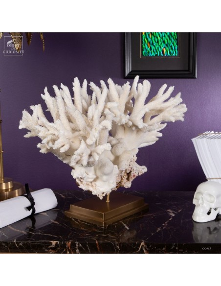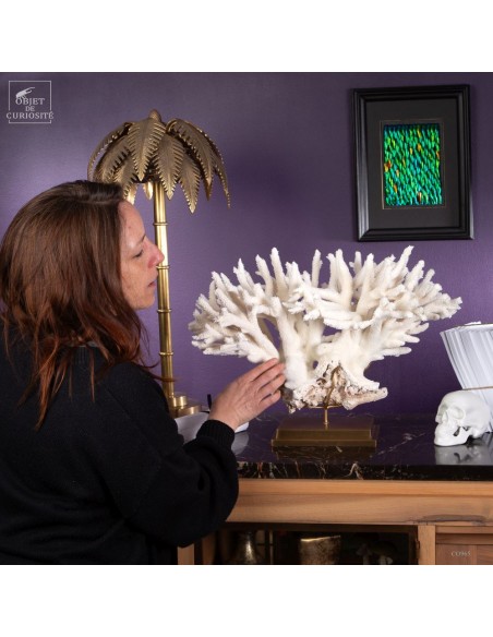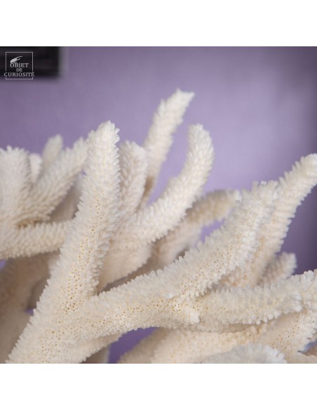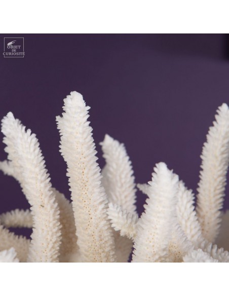 The coral Acropora nobilis, commonly known as “Staghorn coral” due to its thin branches resembling deer antlers, is a species widely distributed in the Indo-Pacific region, particularly around the Solomon Islands, where this piece originates. This coral is distinguished by its tangled colonies that form complex and airy structures. Its color generally ranges from cream to pale yellow, with whitish tips that remain visible, indicating the active growth of the species. This particular piece has a naturally balanced shape, making it ideal as a curiosity object.