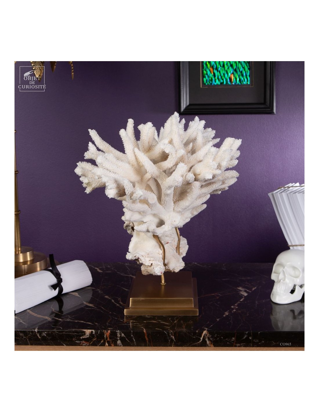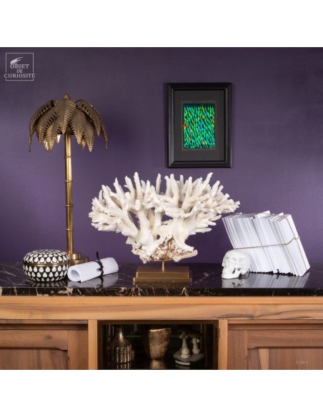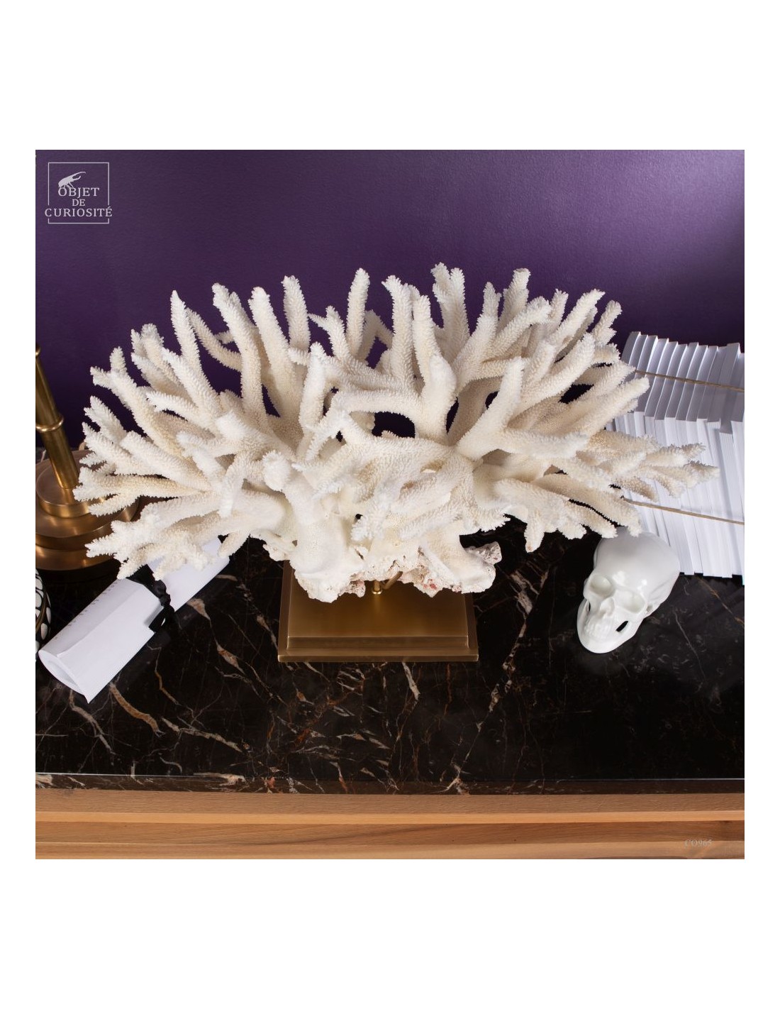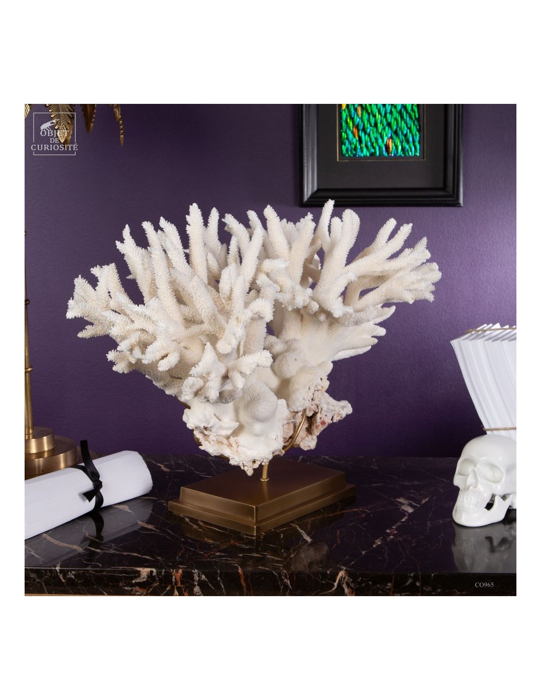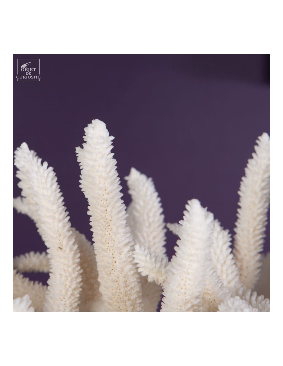 The coral Acropora nobilis, commonly known as “Staghorn coral” due to its thin branches resembling deer antlers, is a species widely distributed in the Indo-Pacific region, particularly around the Solomon Islands, where this piece originates. This coral is distinguished by its tangled colonies that form complex and airy structures. Its color generally ranges from cream to pale yellow, with whitish tips that remain visible, indicating the active growth of the species. This particular piece has a naturally balanced shape, making it ideal as a curiosity object.