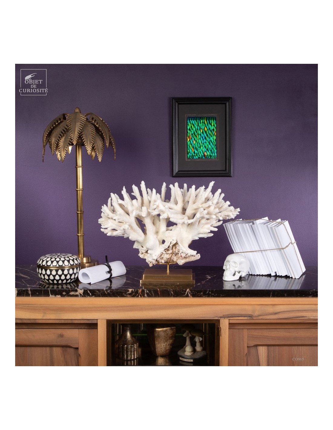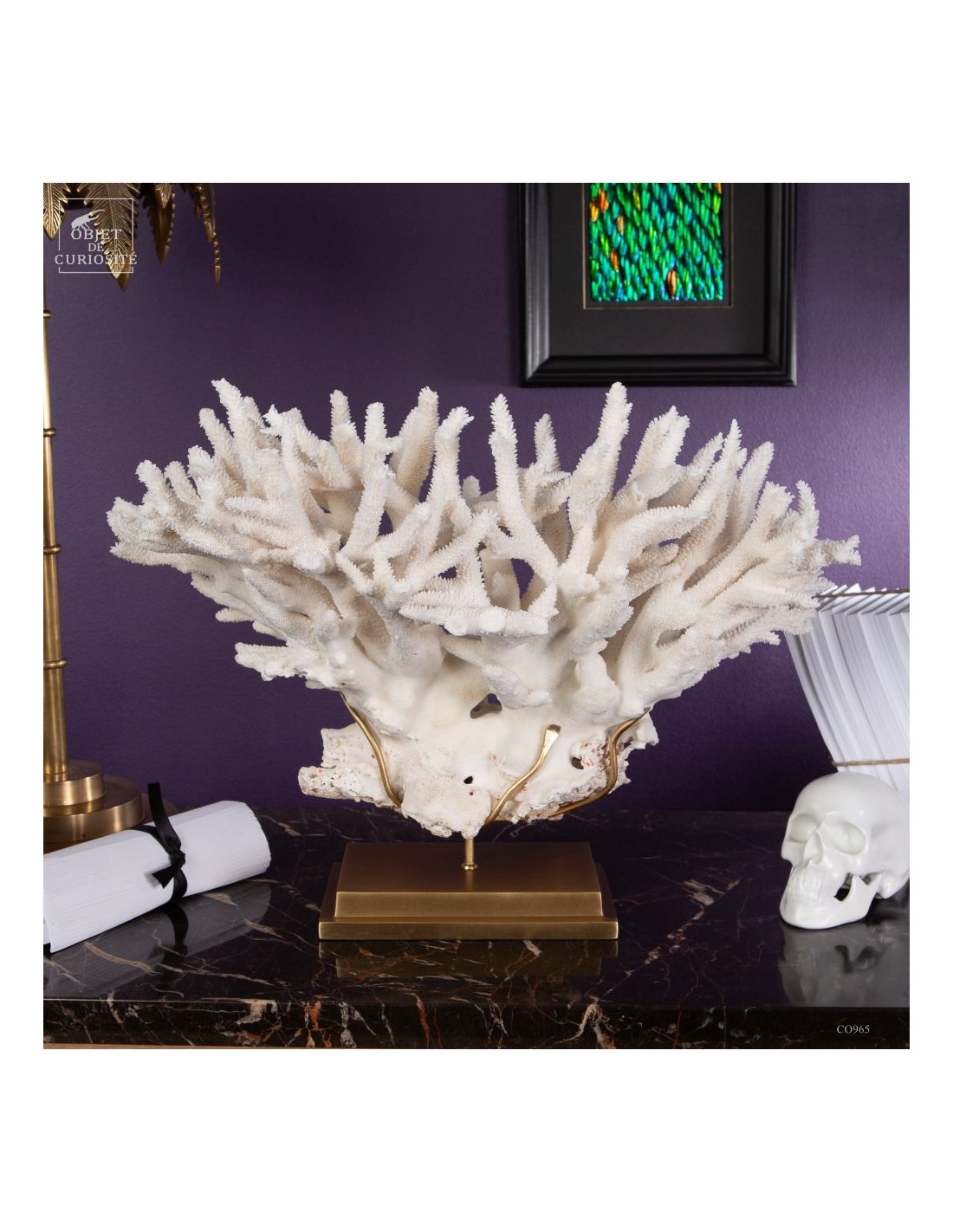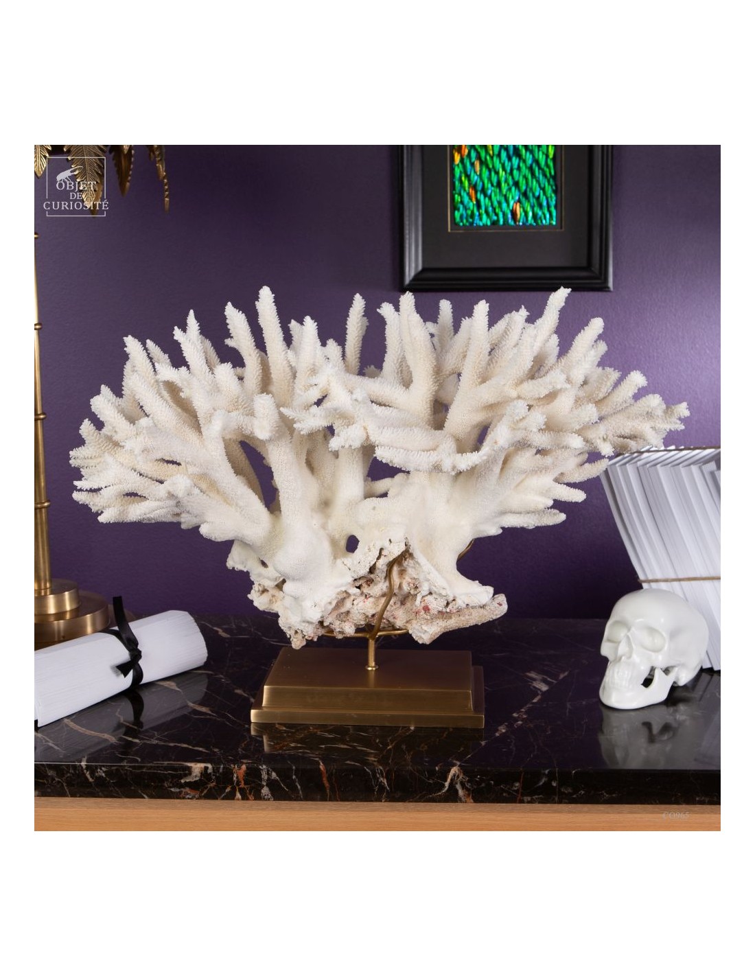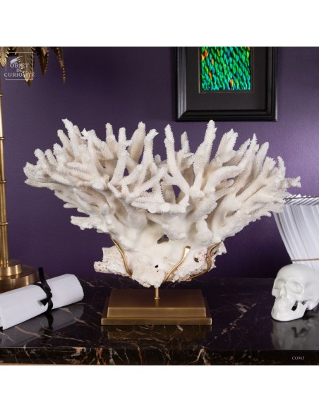 The coral Acropora nobilis, commonly known as “Staghorn coral” due to its thin branches resembling deer antlers, is a species widely distributed in the Indo-Pacific region, particularly around the Solomon Islands, where this piece originates. This coral is distinguished by its tangled colonies that form complex and airy structures. Its color generally ranges from cream to pale yellow, with whitish tips that remain visible, indicating the active growth of the species. This particular piece has a naturally balanced shape, making it ideal as a curiosity object.